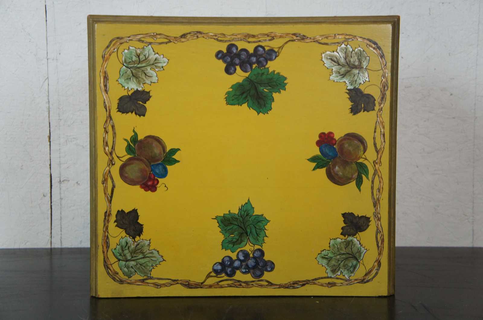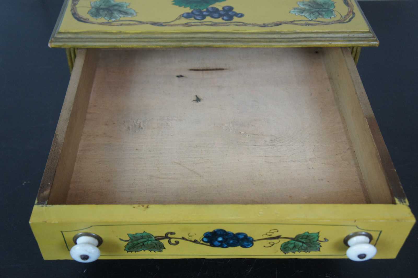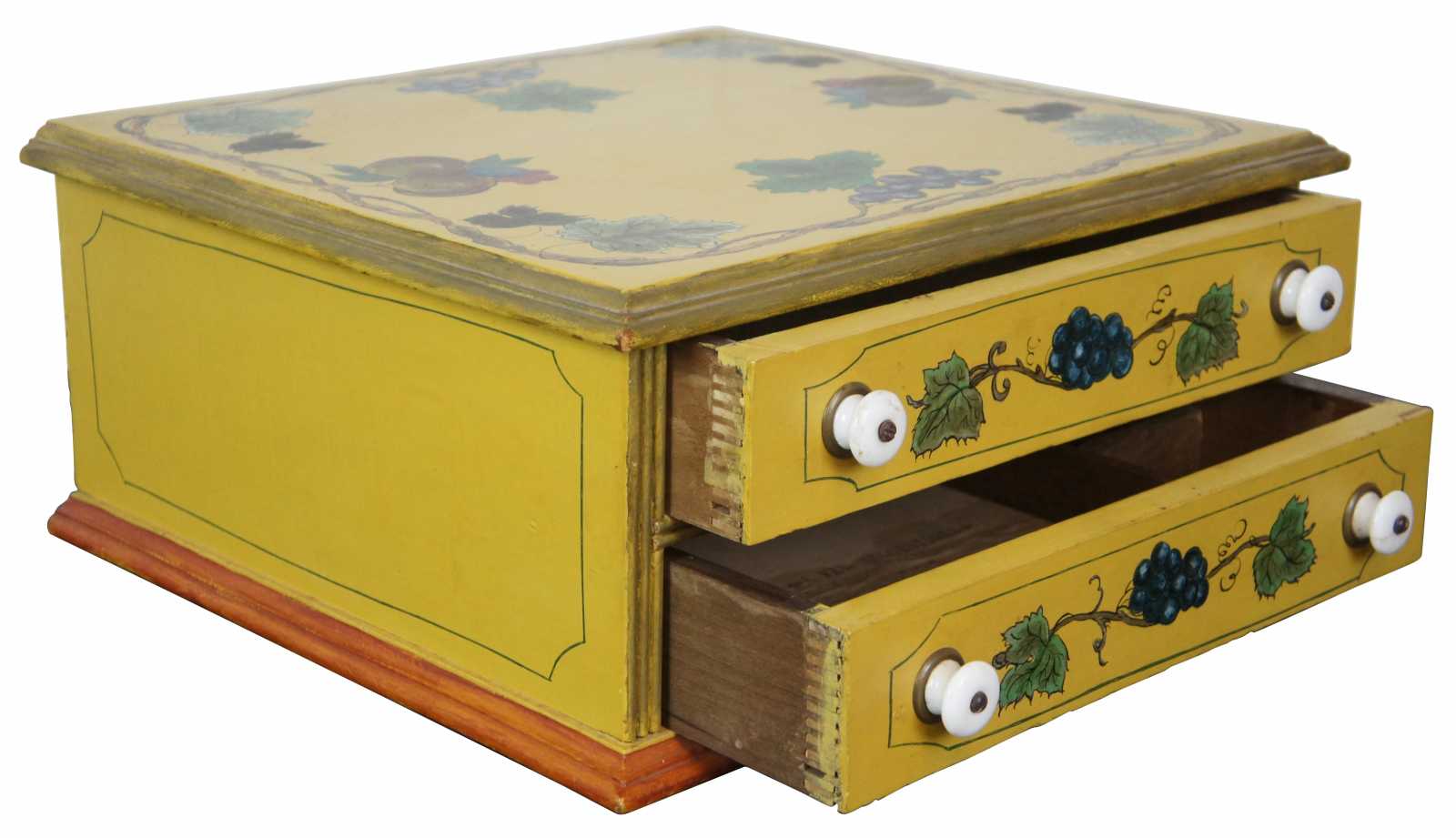 Antique two drawer wooden tabletop spool cabinet, painted over in yellow with a folk art design of grapes and peaches.