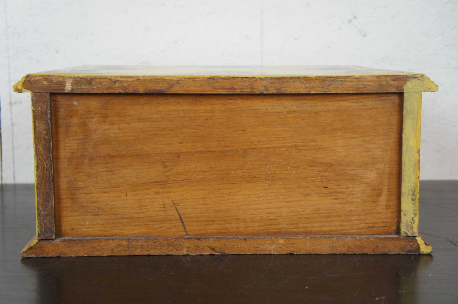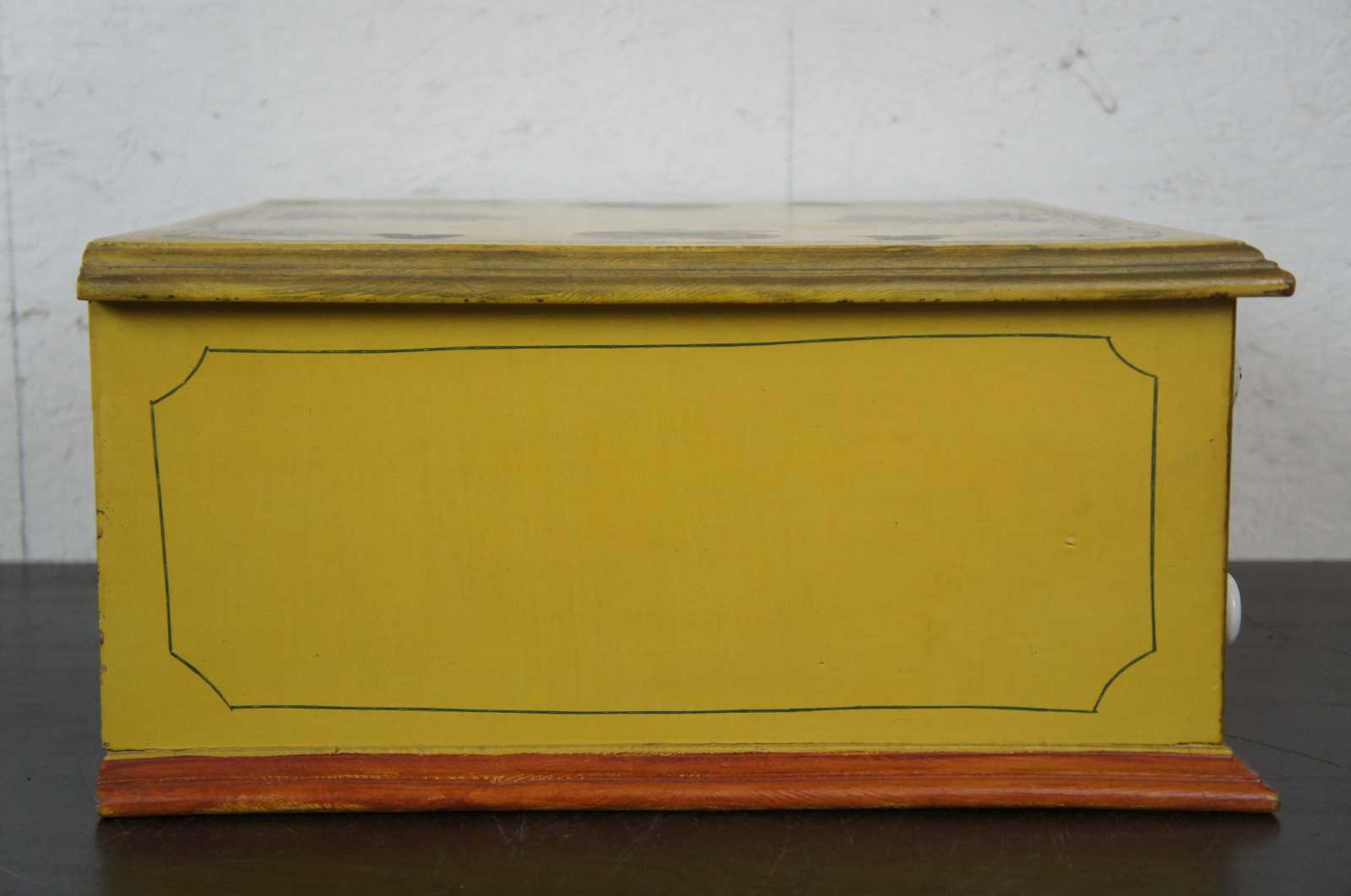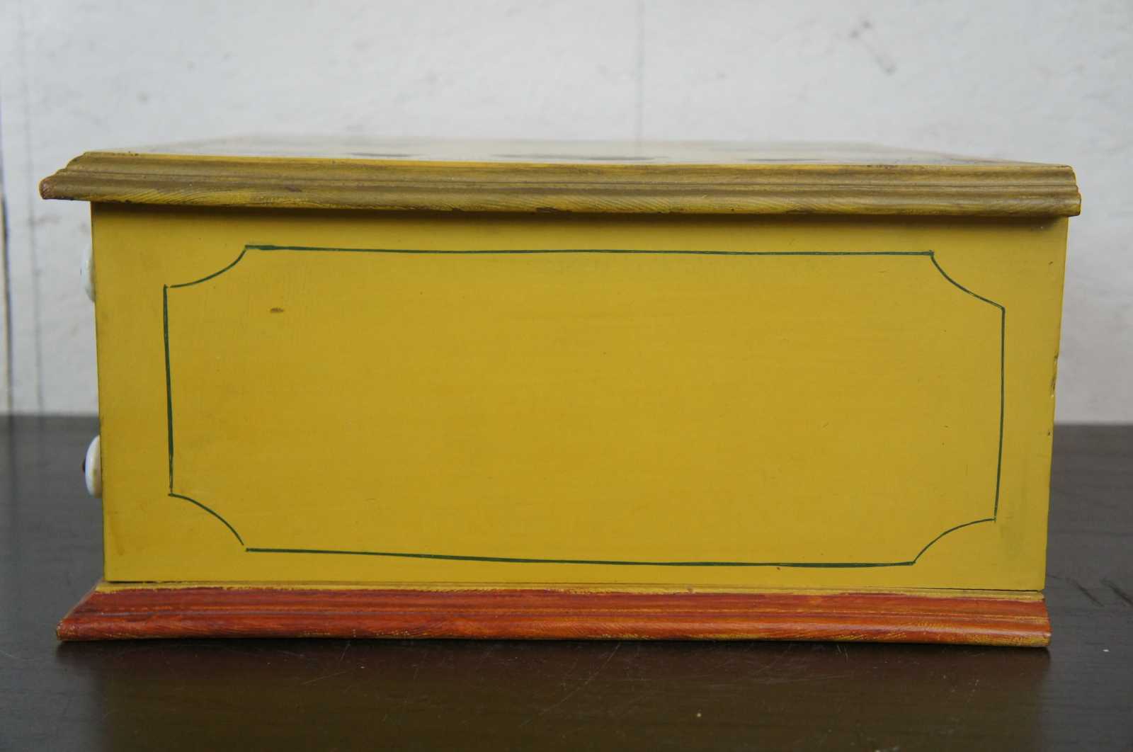 Antique two drawer wooden tabletop spool cabinet, painted over in yellow with a folk art design of grapes and peaches.