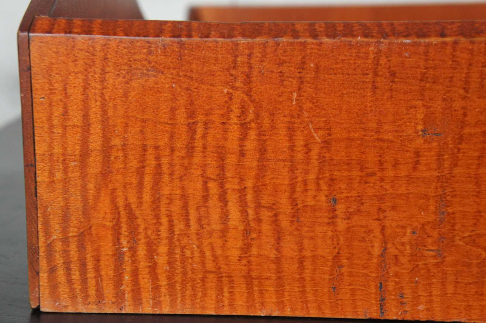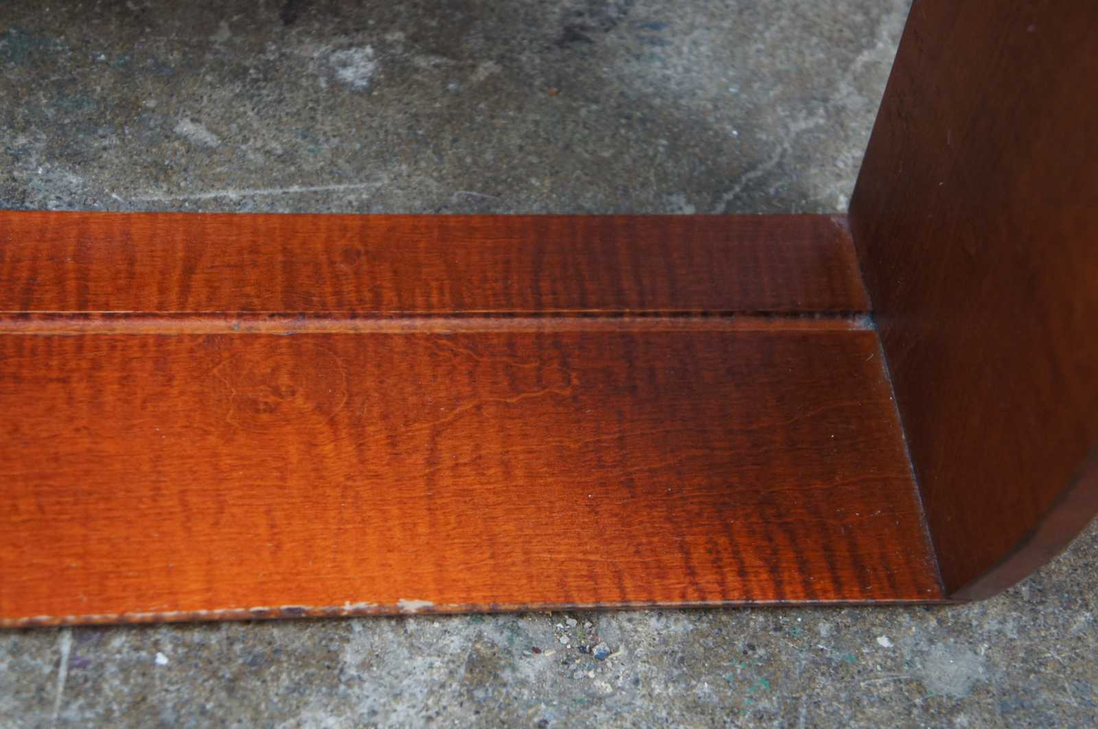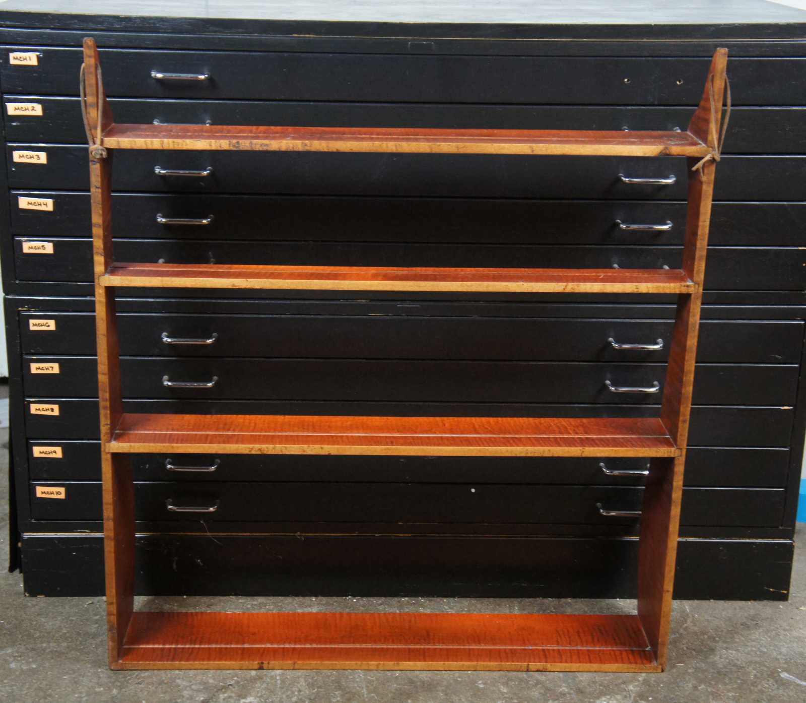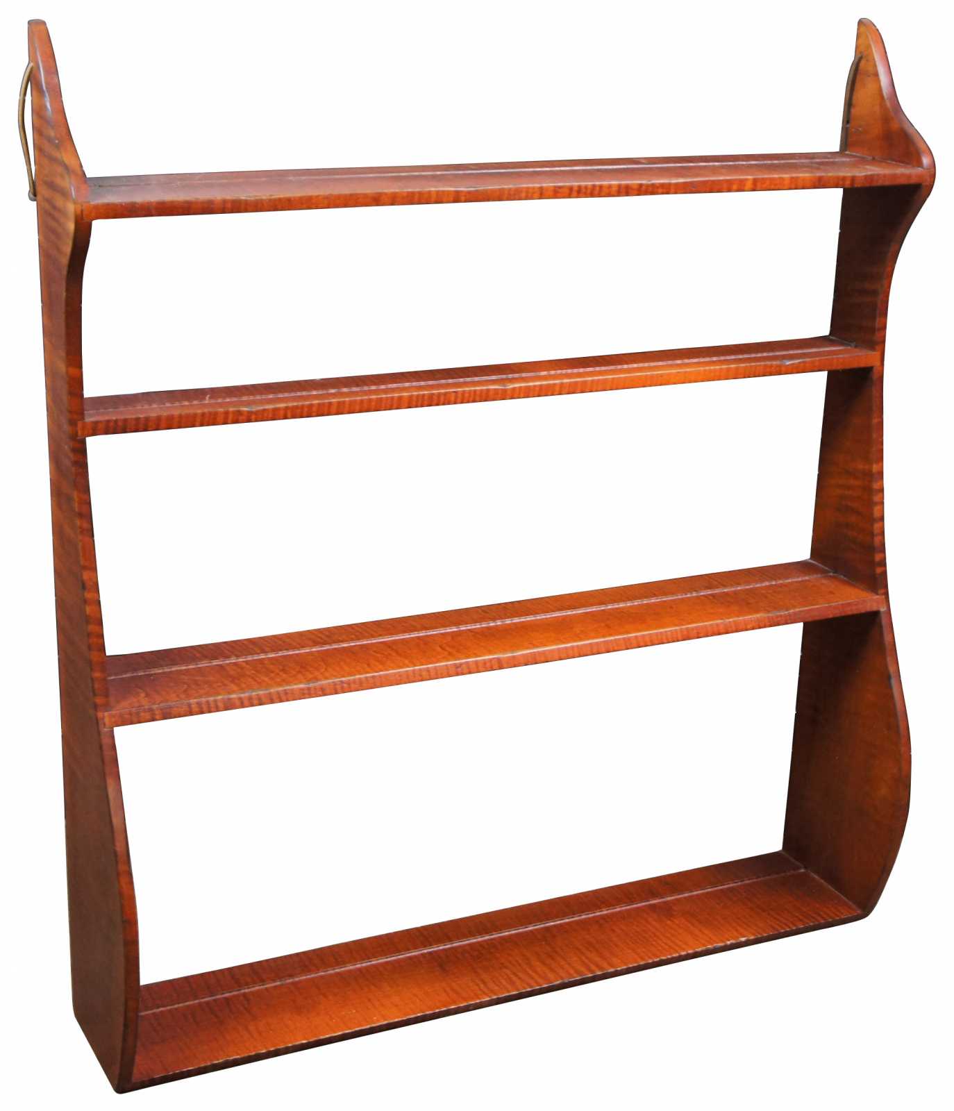 Vintage curley maple Whale Shelf display with plate grooves by David T Smith. Features four shelves, serpentine shape and leather loops for hanging.