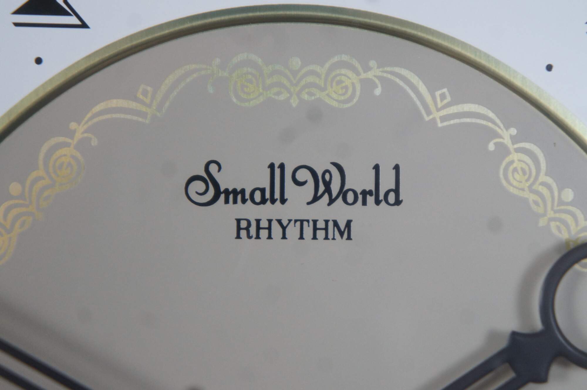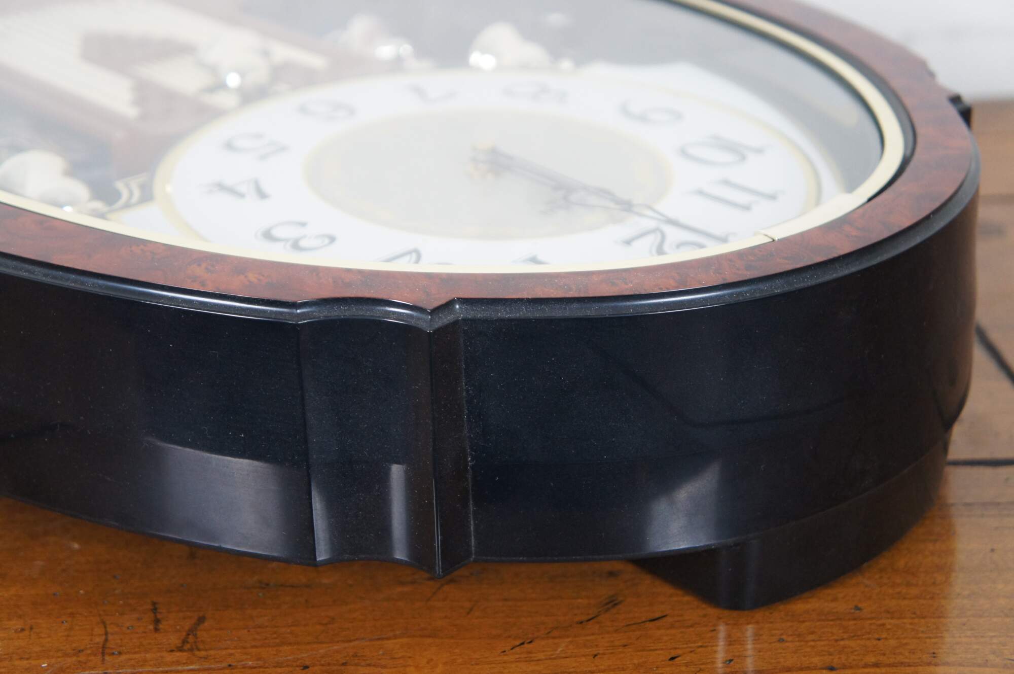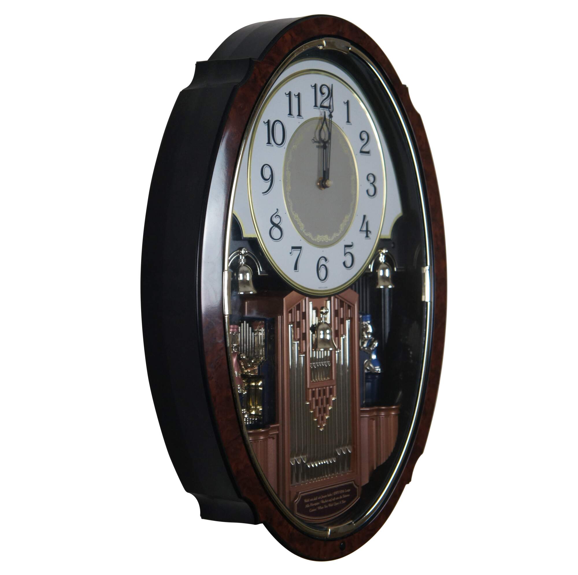 Late 20th century Rhythm Small World, battery operated, musical animated wall clock. Made in Japan. Features an oval plastic case finished with a burl wood veneer, with a white and gold face over a gold, copper and blue painted pipe organ and bells, flanked by a pair of organists.