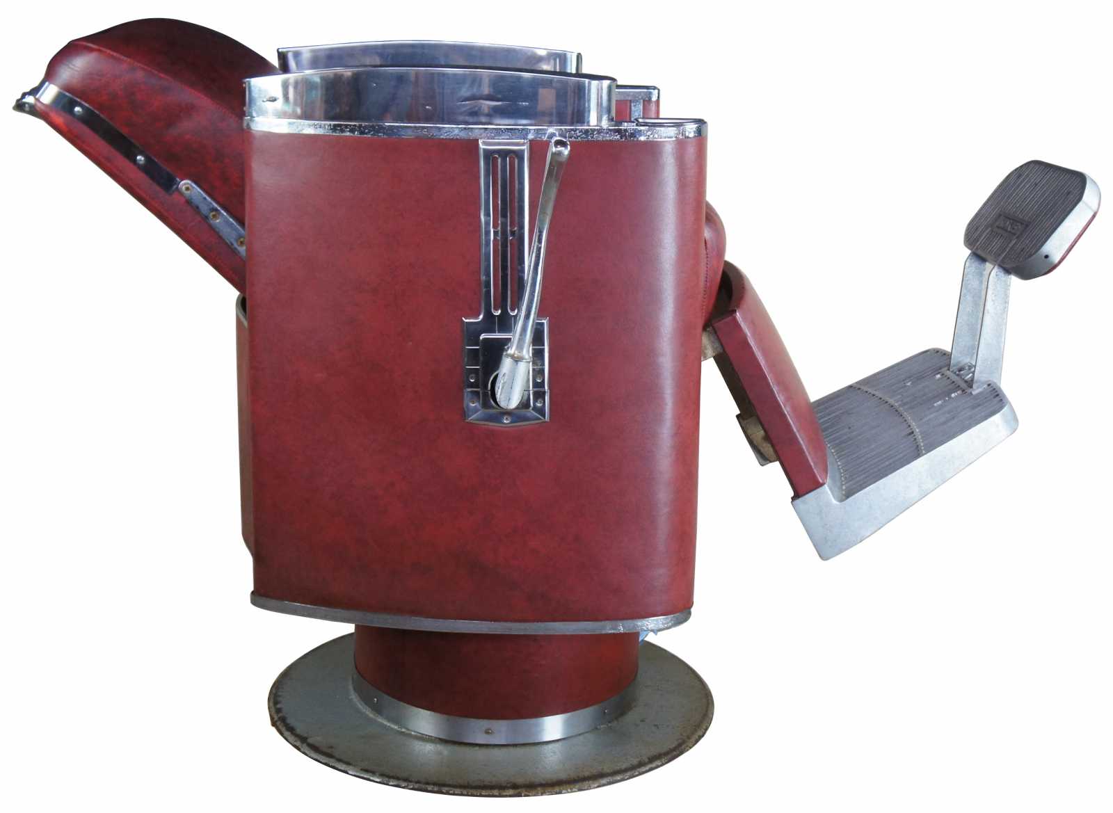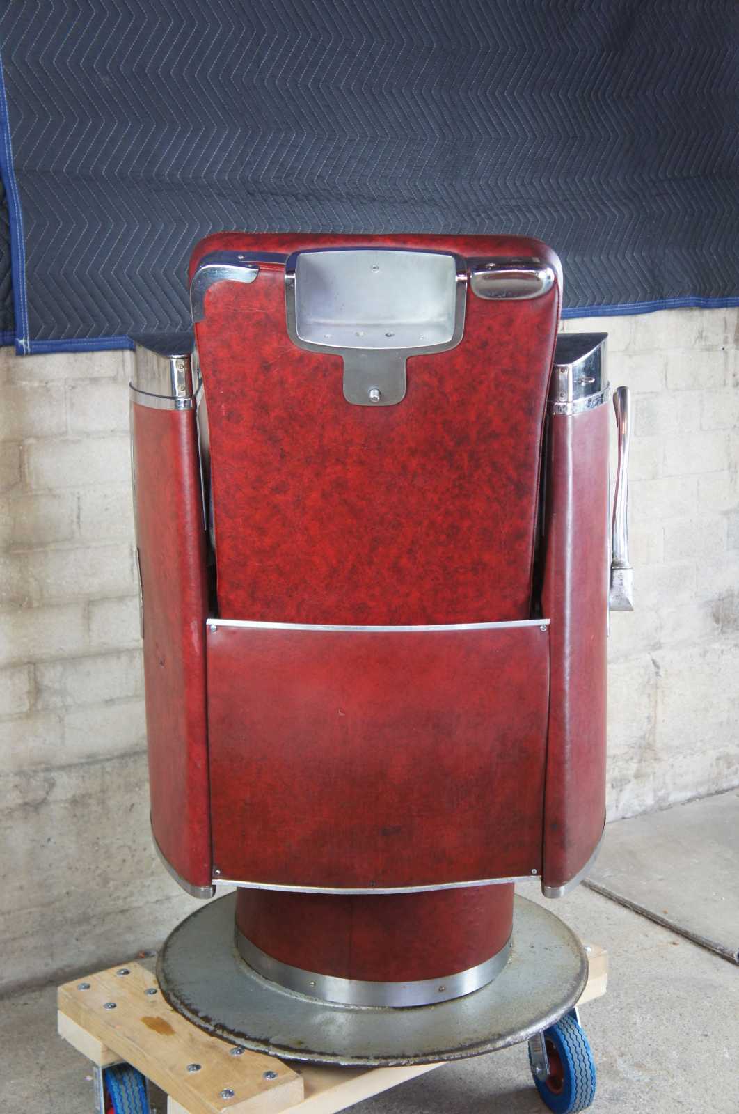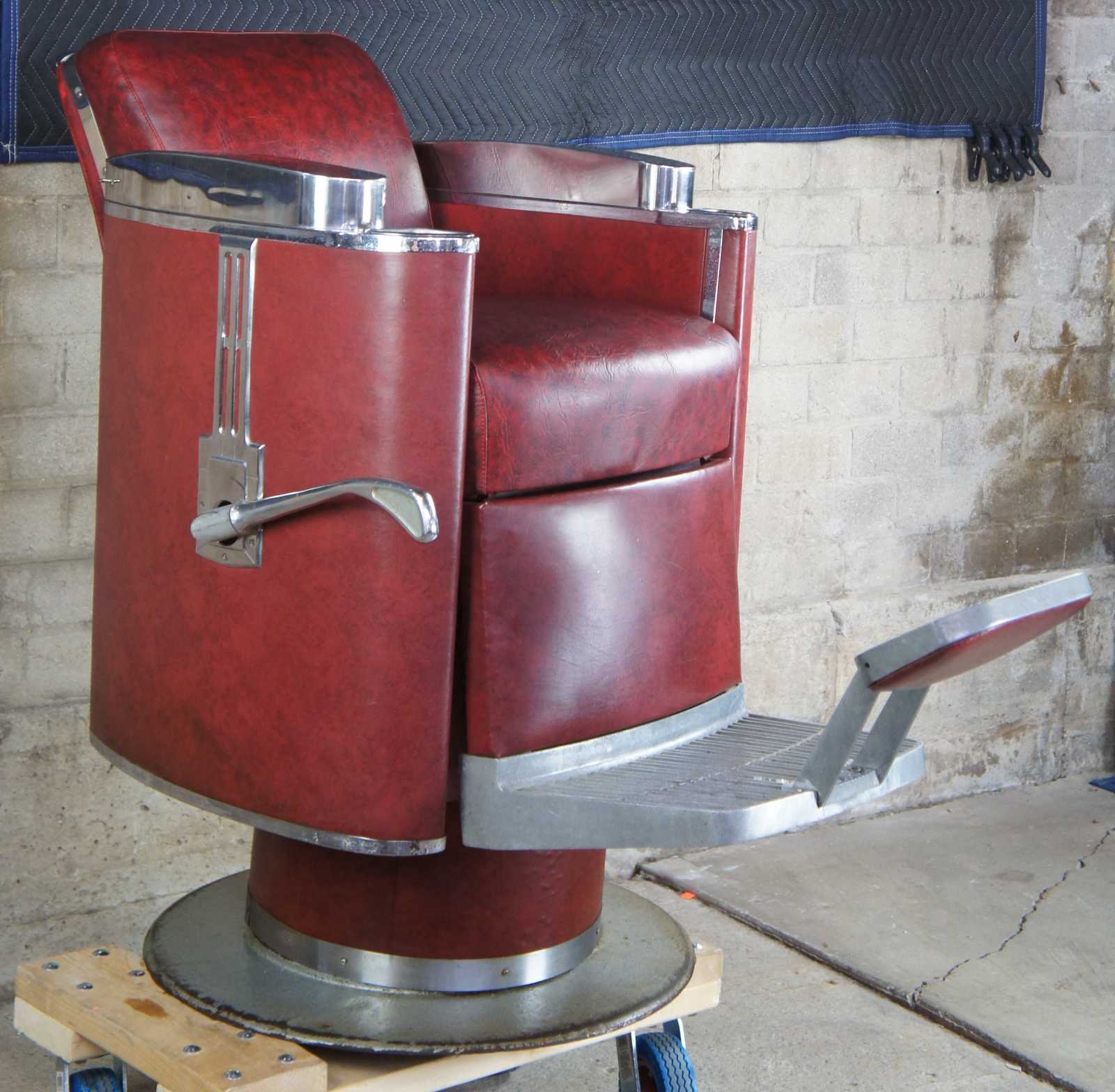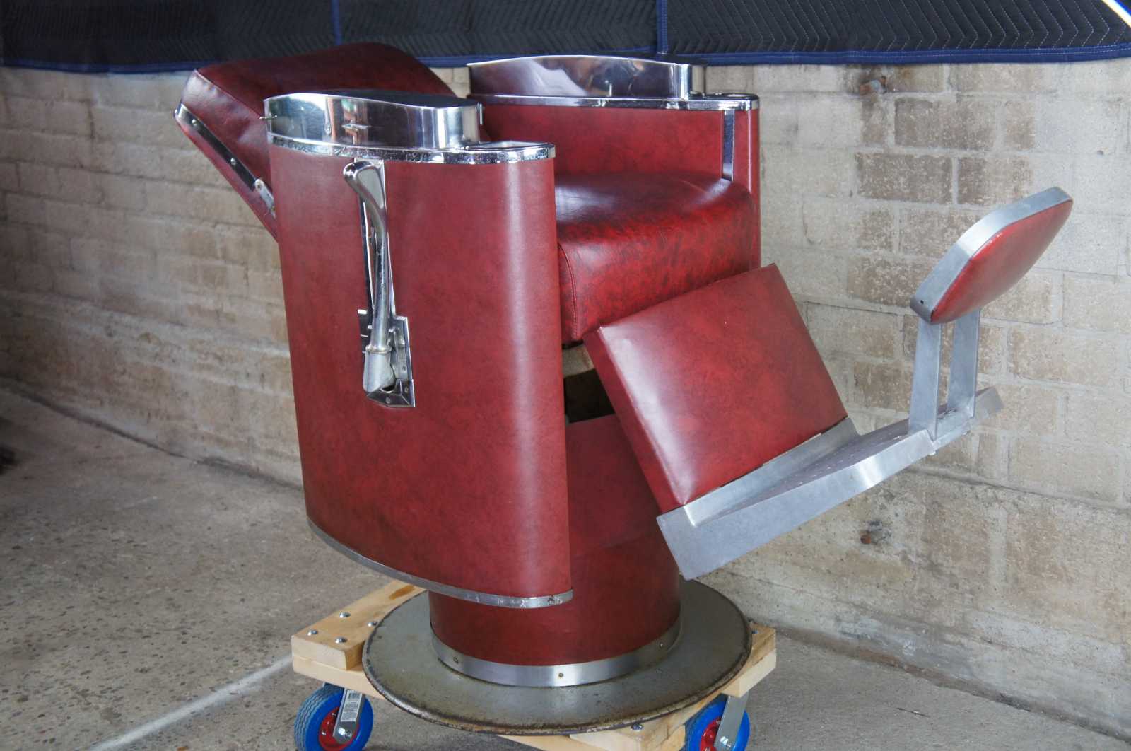 Koken's presidentail barbers chair was a modern day advancement from the chairs of the early 20th century. Made from leather, stainless steel and chrome. Features a 10" range hydraulic lift and twist of the wrist reclining.