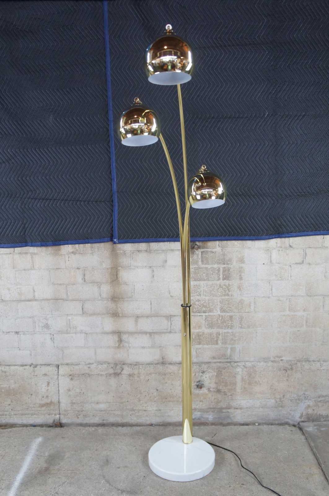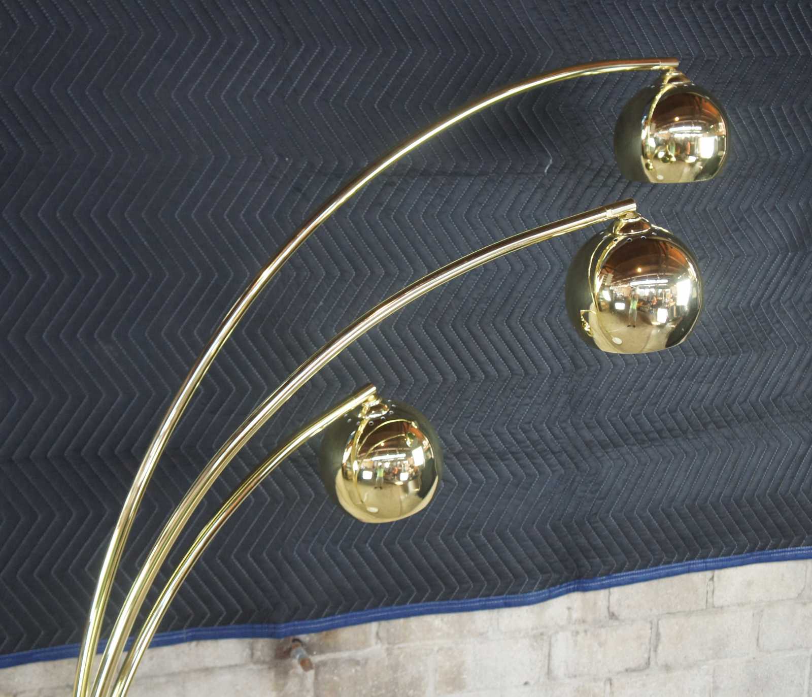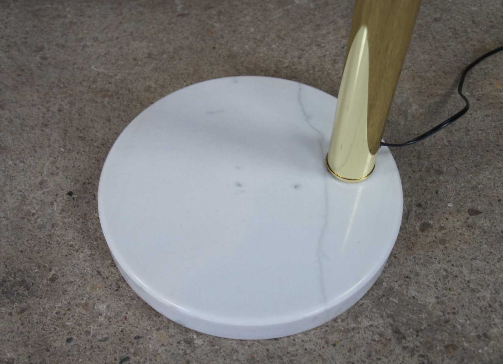 1960s 3 arm adjustable arc floor lamp. Polished brass over a white marble base. In the manner of Robert Sonneman