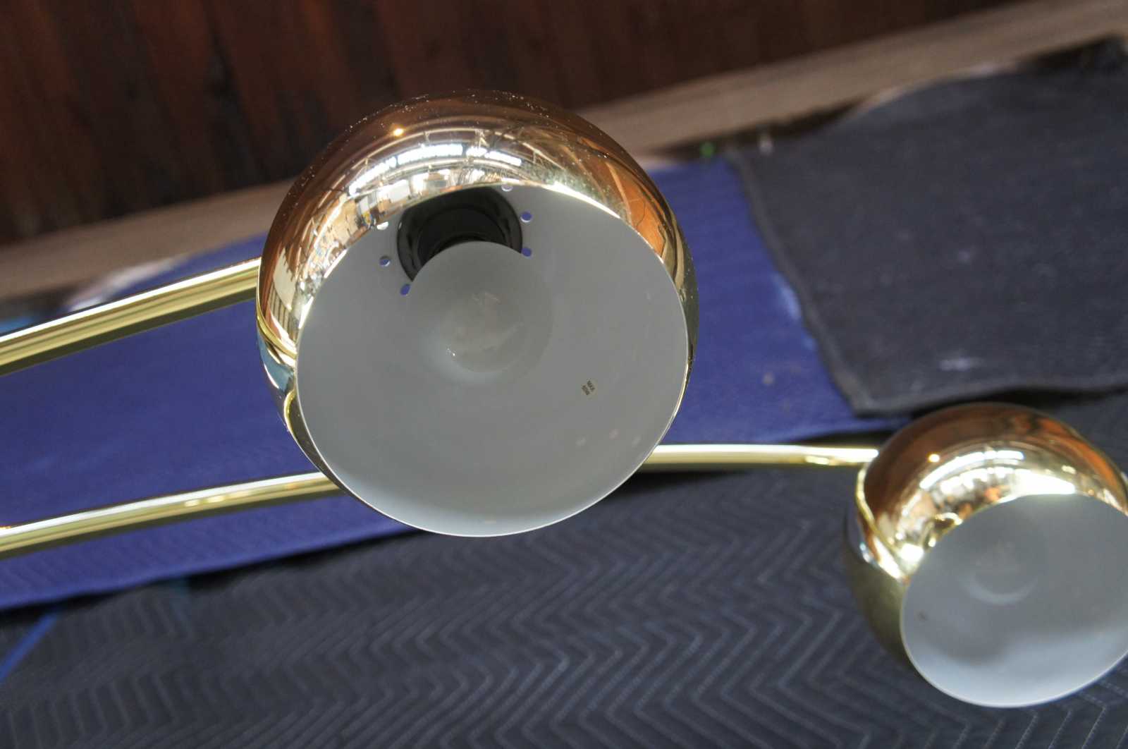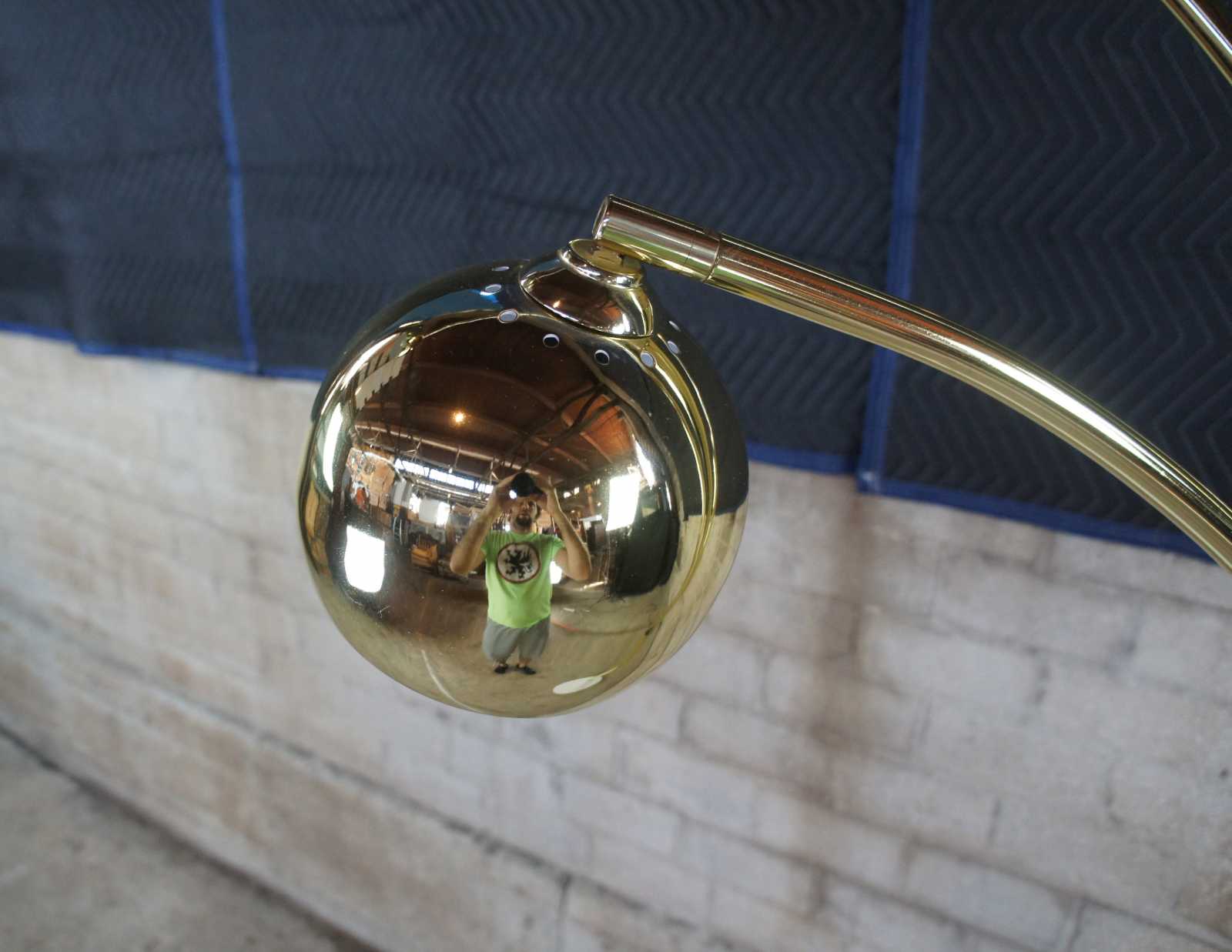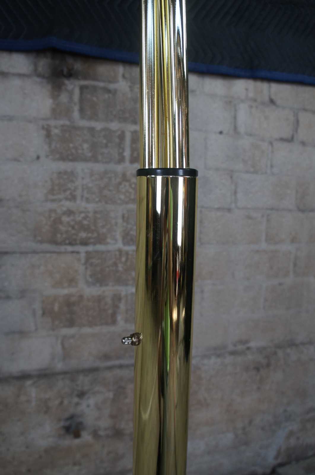 1960s 3 arm adjustable arc floor lamp. Polished brass over a white marble base. In the manner of Robert Sonneman