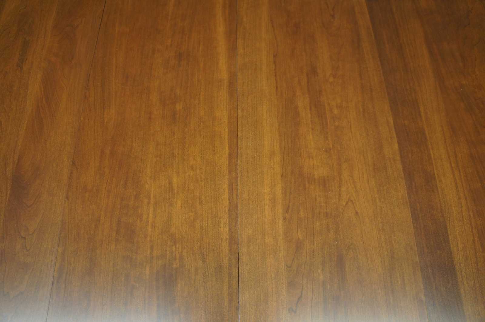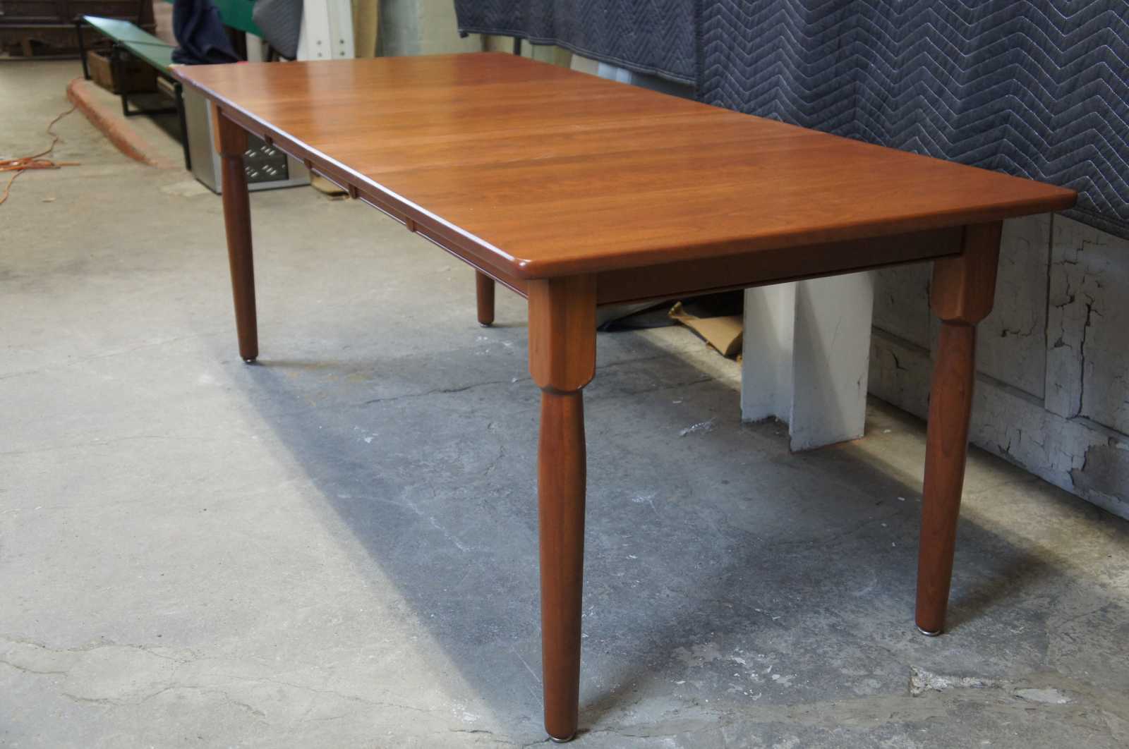 Amish made handcrafted cherry dining table. Rectangular form with turned legs. Features (3) 11" leafs for extension and table pads.