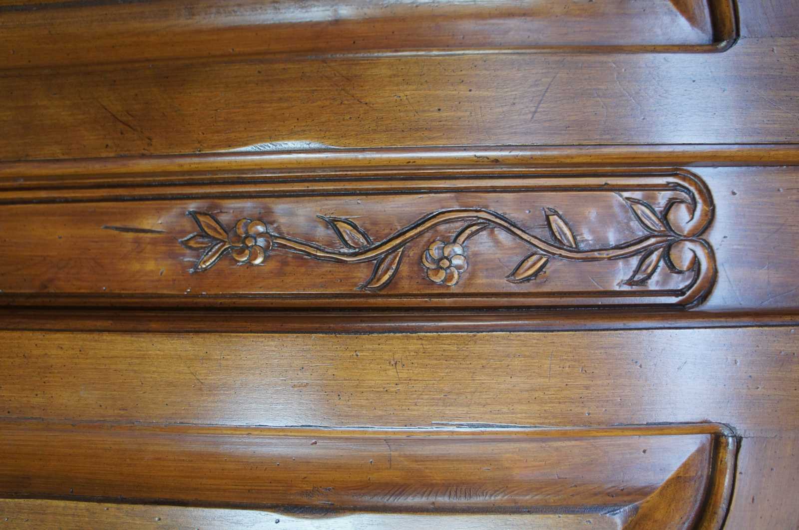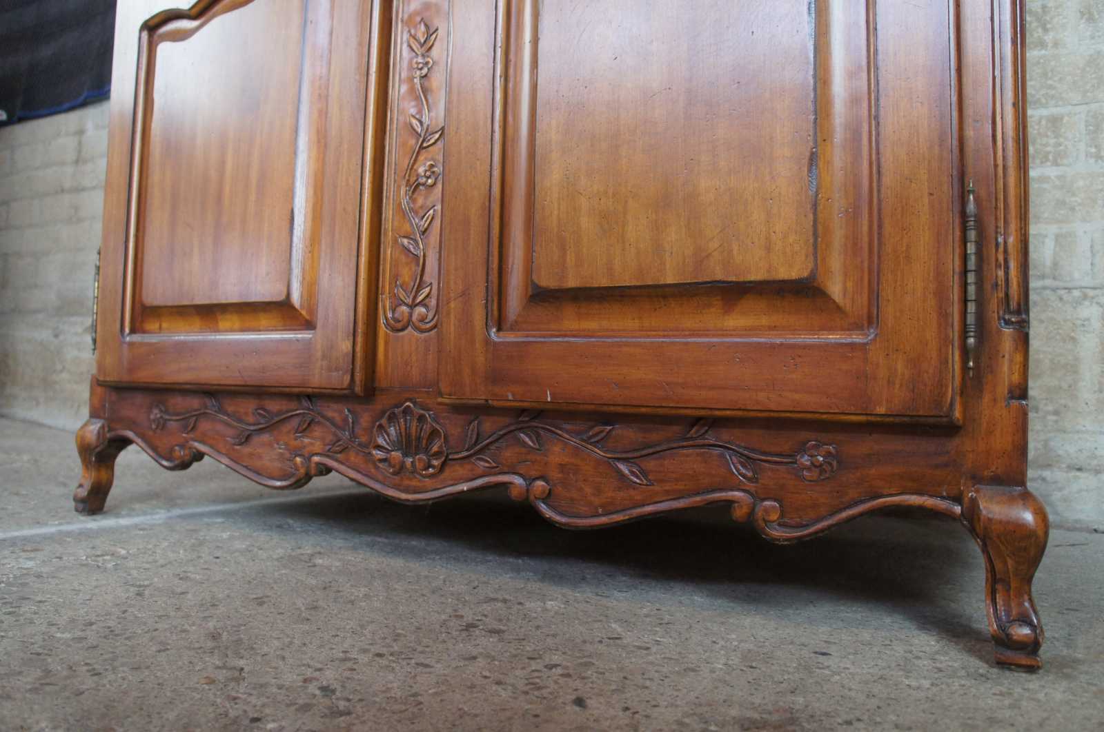 Vintage French Country armoire or wardrobe. Made of walnut with French styling with carved florals, shells, leaves with a central floral medallion and serpentine accents. Made in Mexico.