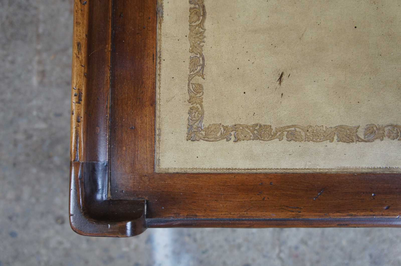Circa 1980s John Widdicomb Coffee Table. Made from walnut with carved accents and a tooled leather inset top. Features a rectangular form over cabriole legs. Draws inspiration from Louis XV and Provincial Styling. John Widdicomb of Grand Rapids, Michigan operated from 1897-2002.