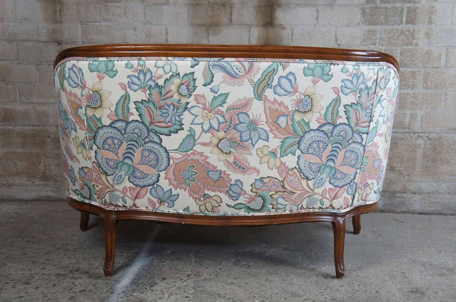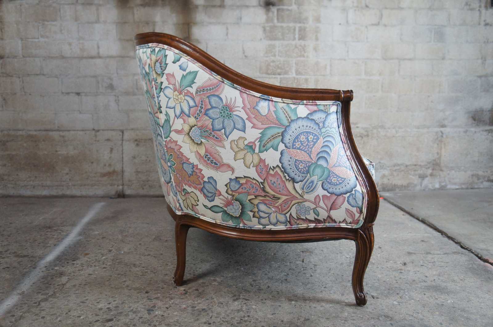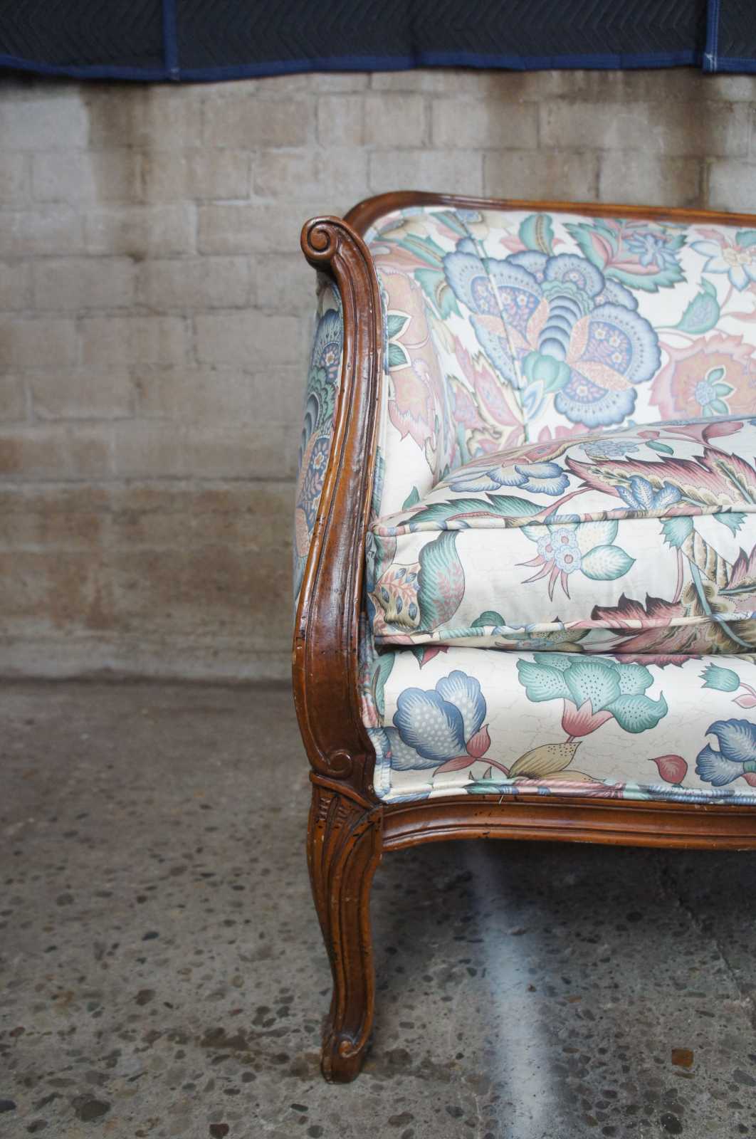 Circa 1980s John Widdicomb loveseat. Made from walnut with scrolled and flared arms over shell carved cabriole legs. Features a floral fabric with goose down and feather pillow by Betfara Corp. Draws inspiration from Louis XV and French Country / Provincial Styling. John Widdicomb of Grand Rapids, Michigan operated from 1897-2002.