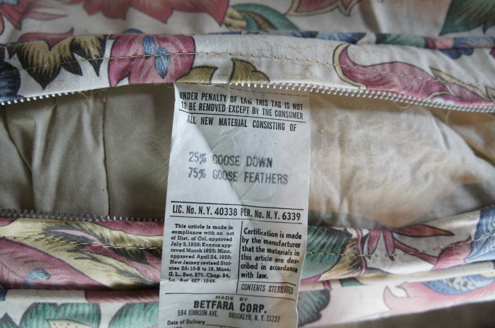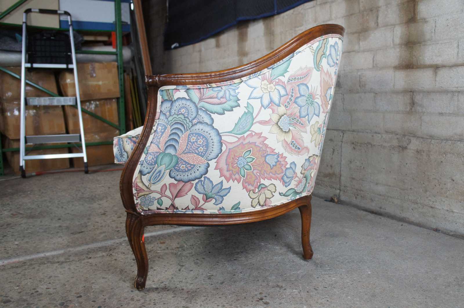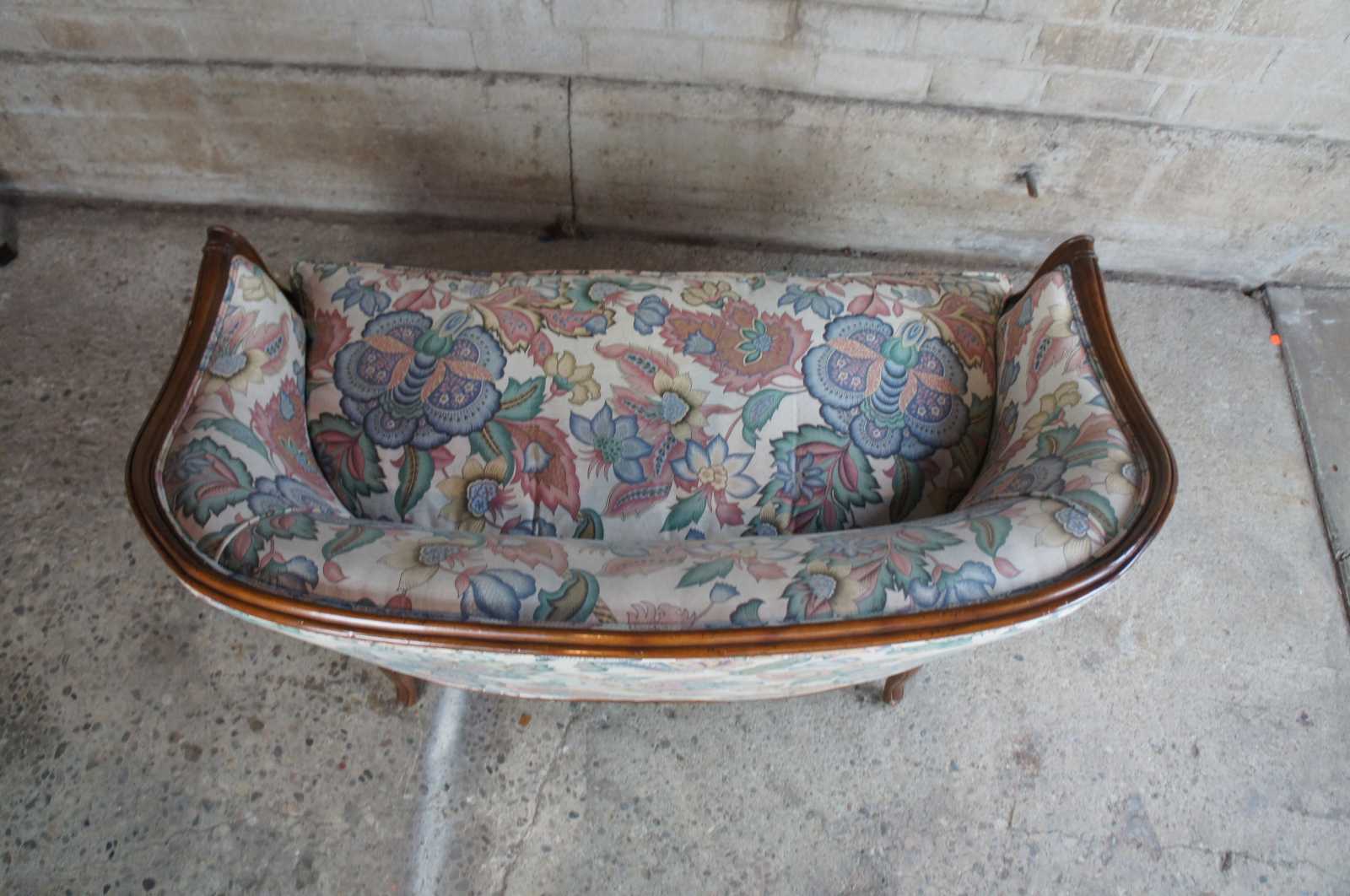 Circa 1980s John Widdicomb loveseat. Made from walnut with scrolled and flared arms over shell carved cabriole legs. Features a floral fabric with goose down and feather pillow by Betfara Corp. Draws inspiration from Louis XV and French Country / Provincial Styling. John Widdicomb of Grand Rapids, Michigan operated from 1897-2002.