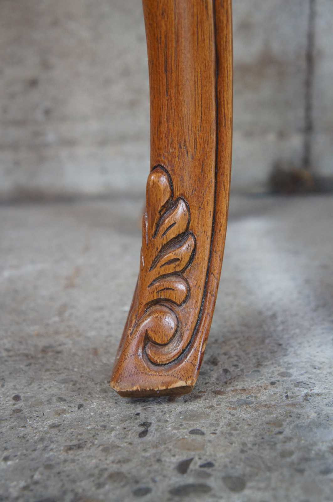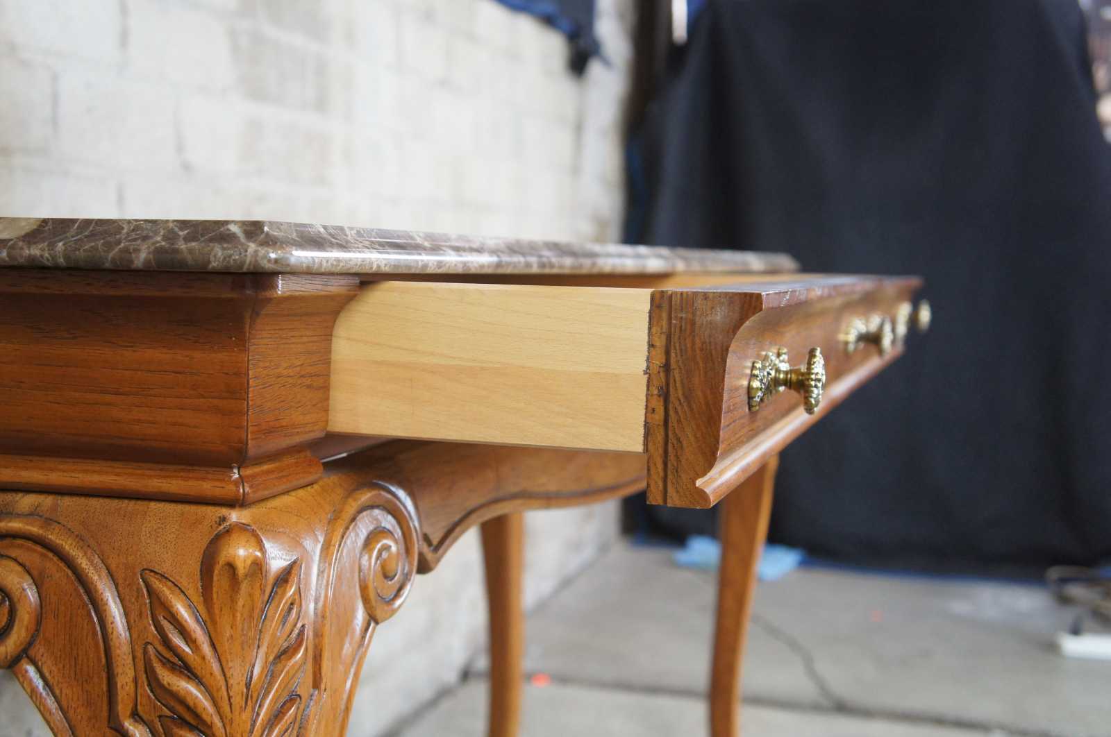 Thomasville Furniture French Country sofa table, 27131-722. Circa 1990s. Made of oak with serpentine form and cabriole legs. Features two drawers and a brown / tan / white marble top.