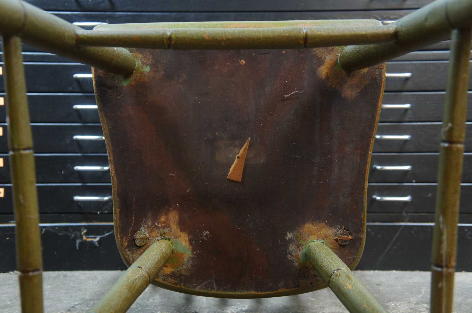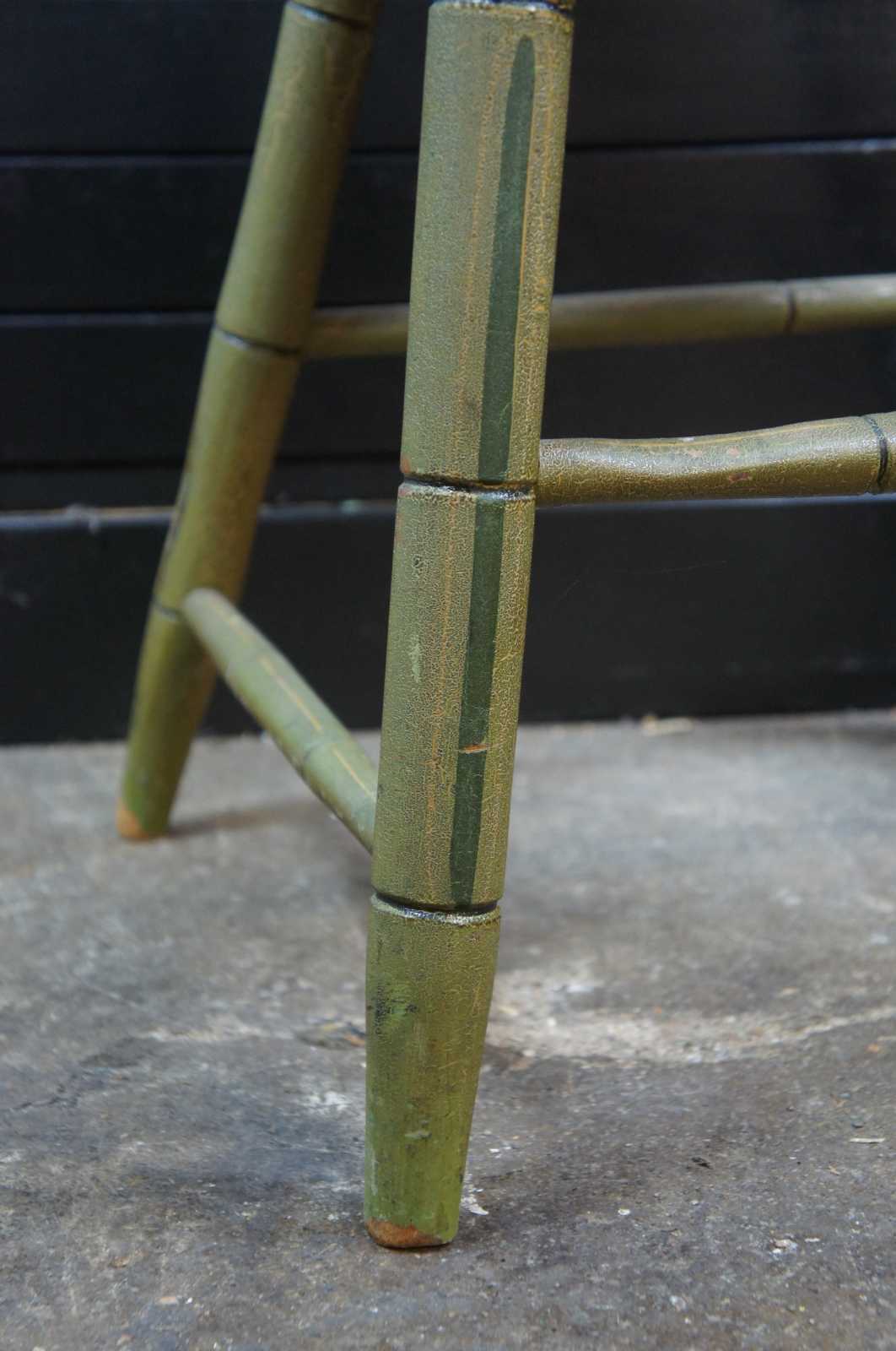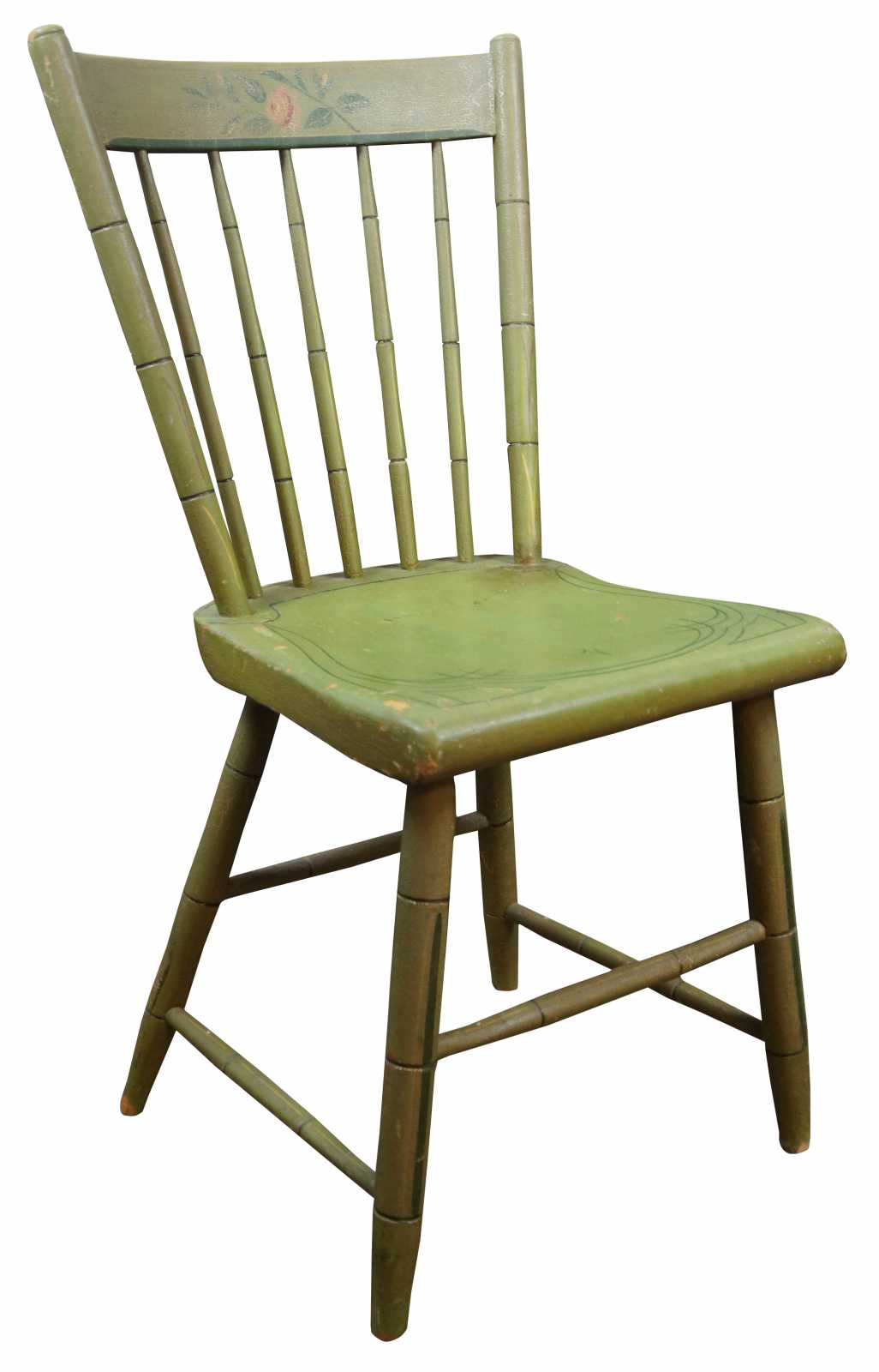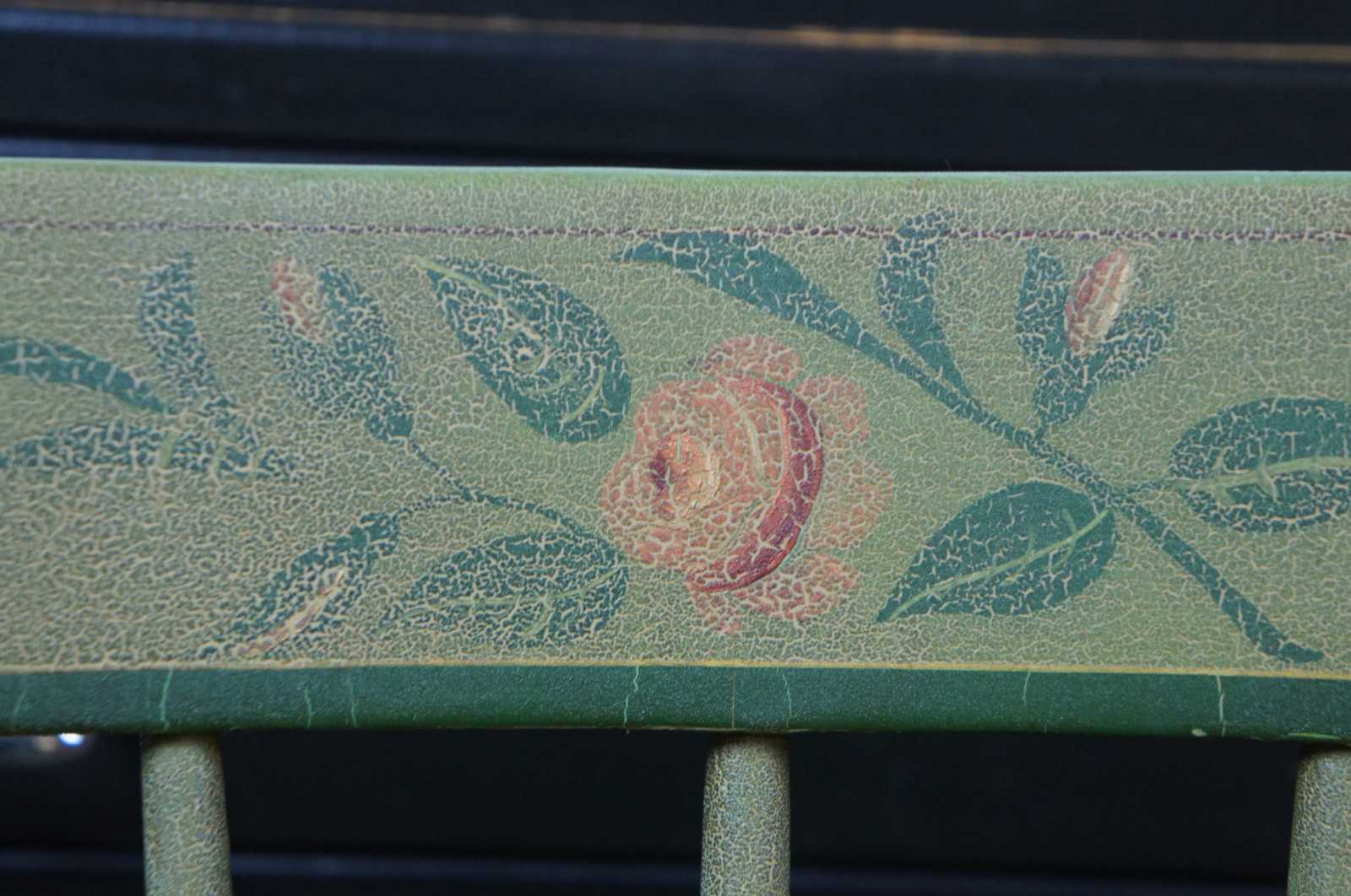Antique Hitchcock style Windsor spindle back side chair painted green with a pink rose accent.