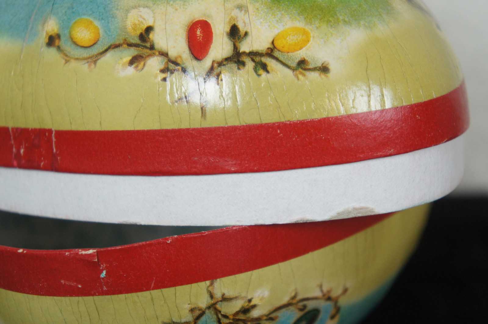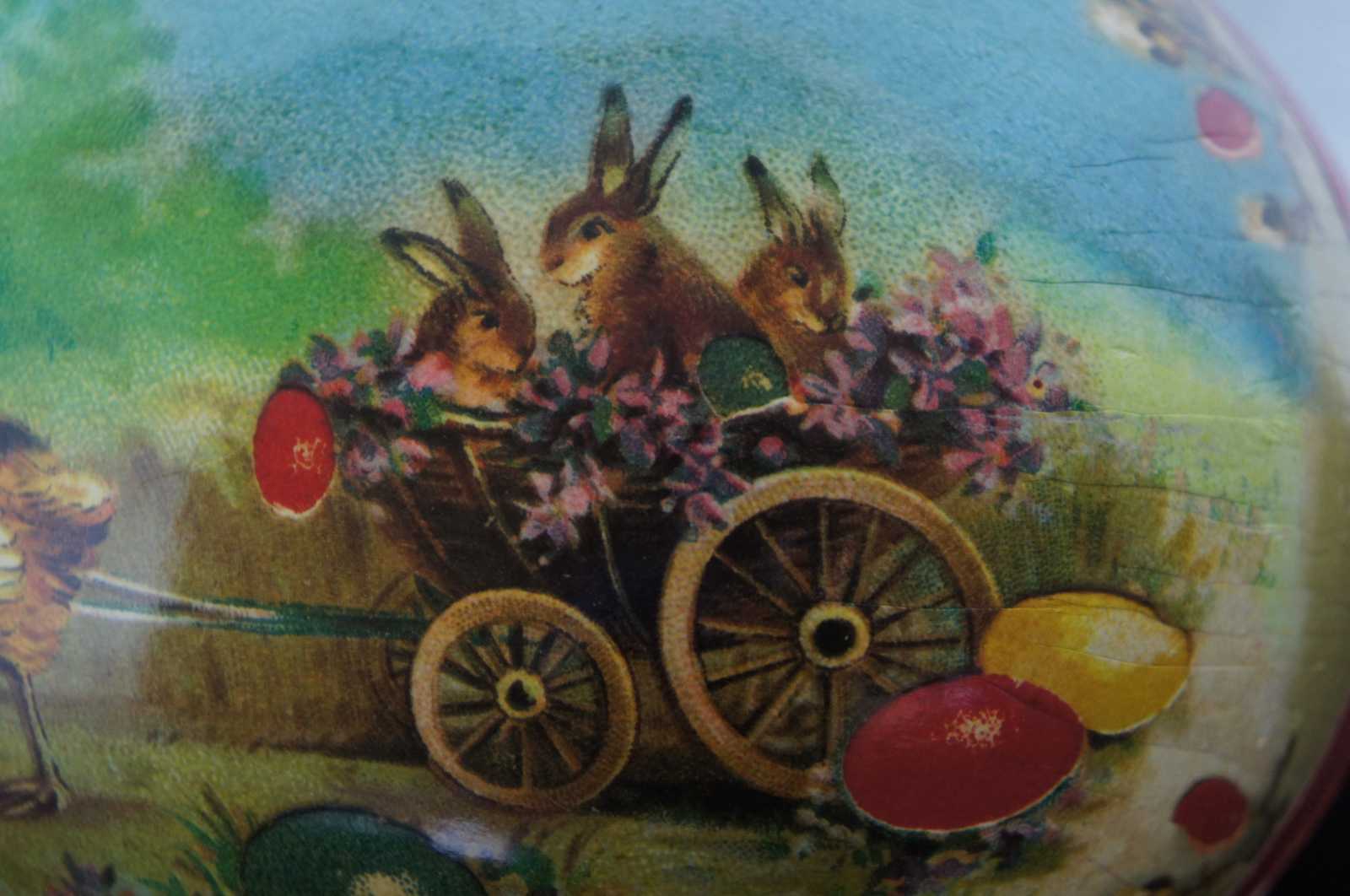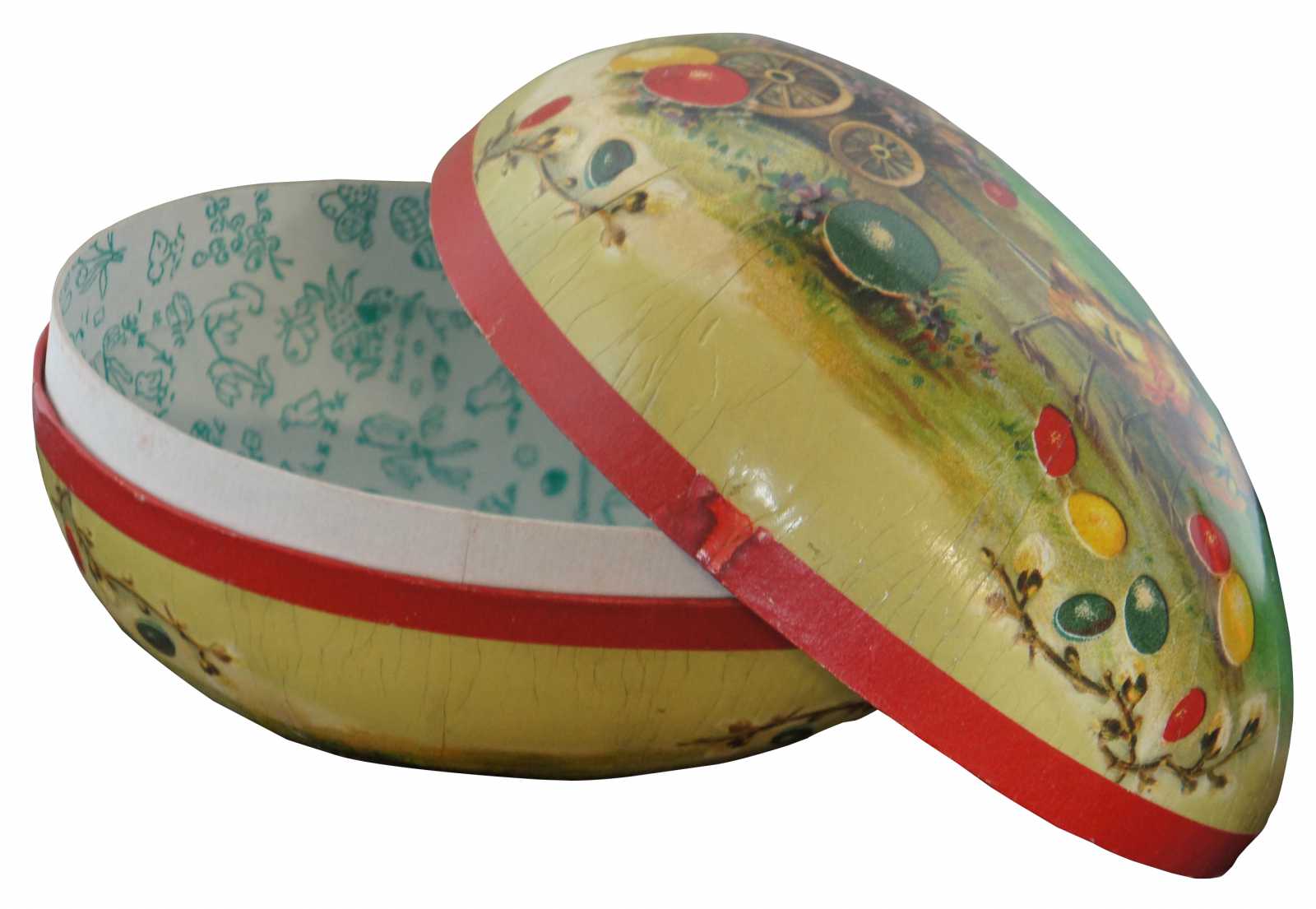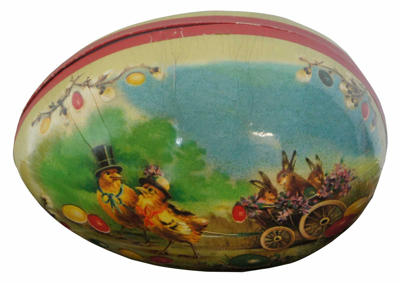 Antique German paper mache Easter egg candy container, featuring a lithograph landscape with Easter eggs and pair of chicks in their Sunday best hats pulling a small cart containing flowers and three bunnies.