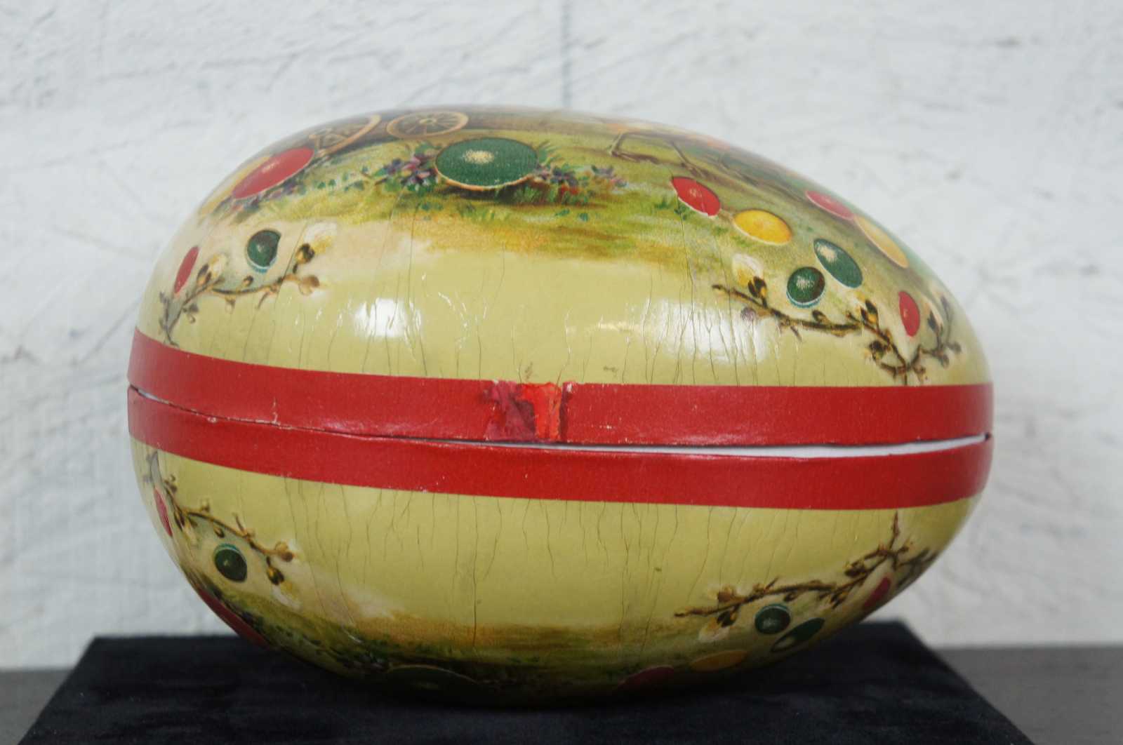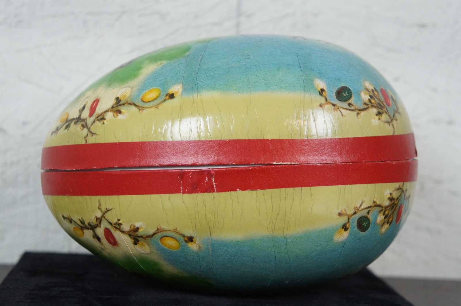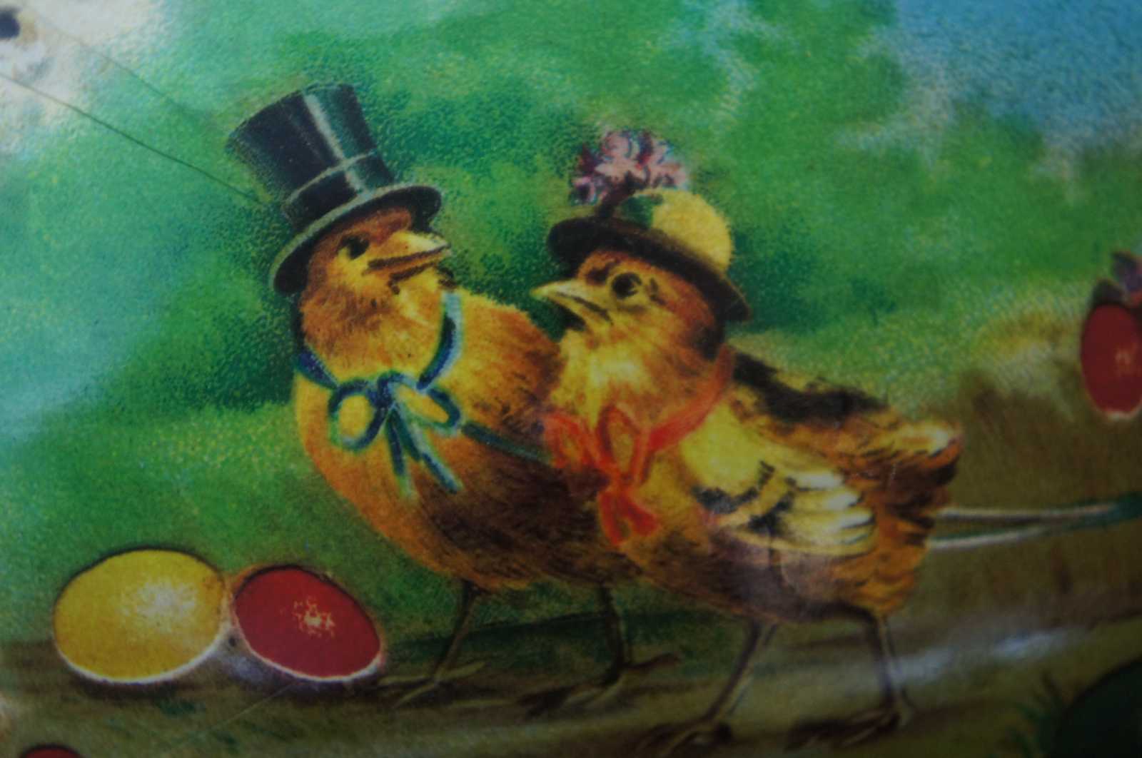 Antique German paper mache Easter egg candy container, featuring a lithograph landscape with Easter eggs and pair of chicks in their Sunday best hats pulling a small cart containing flowers and three bunnies.