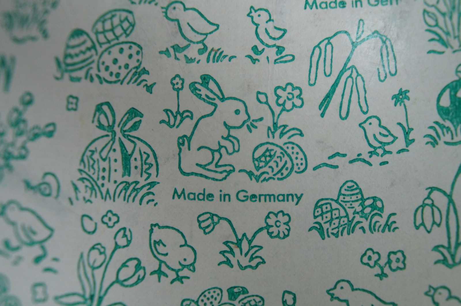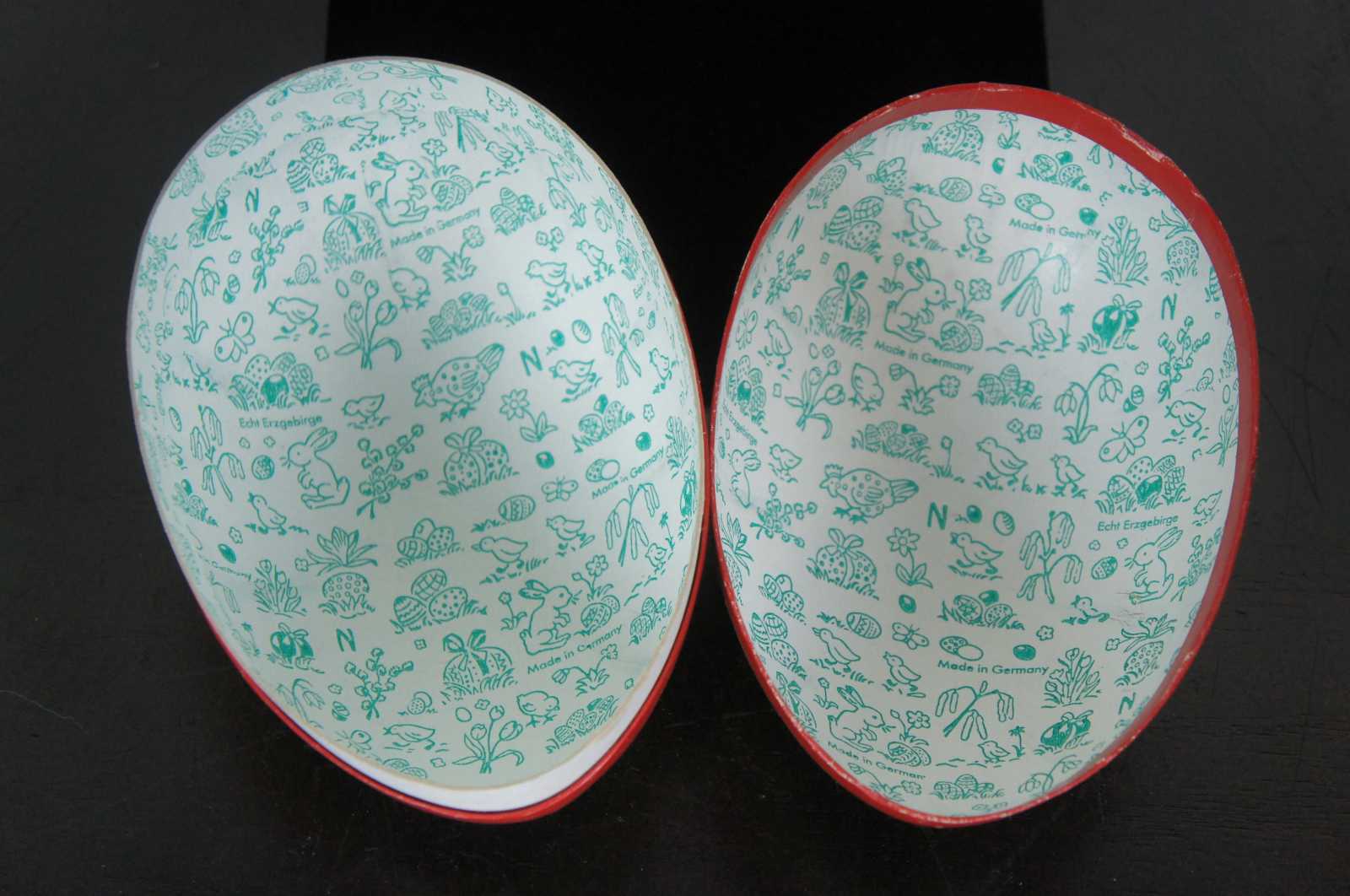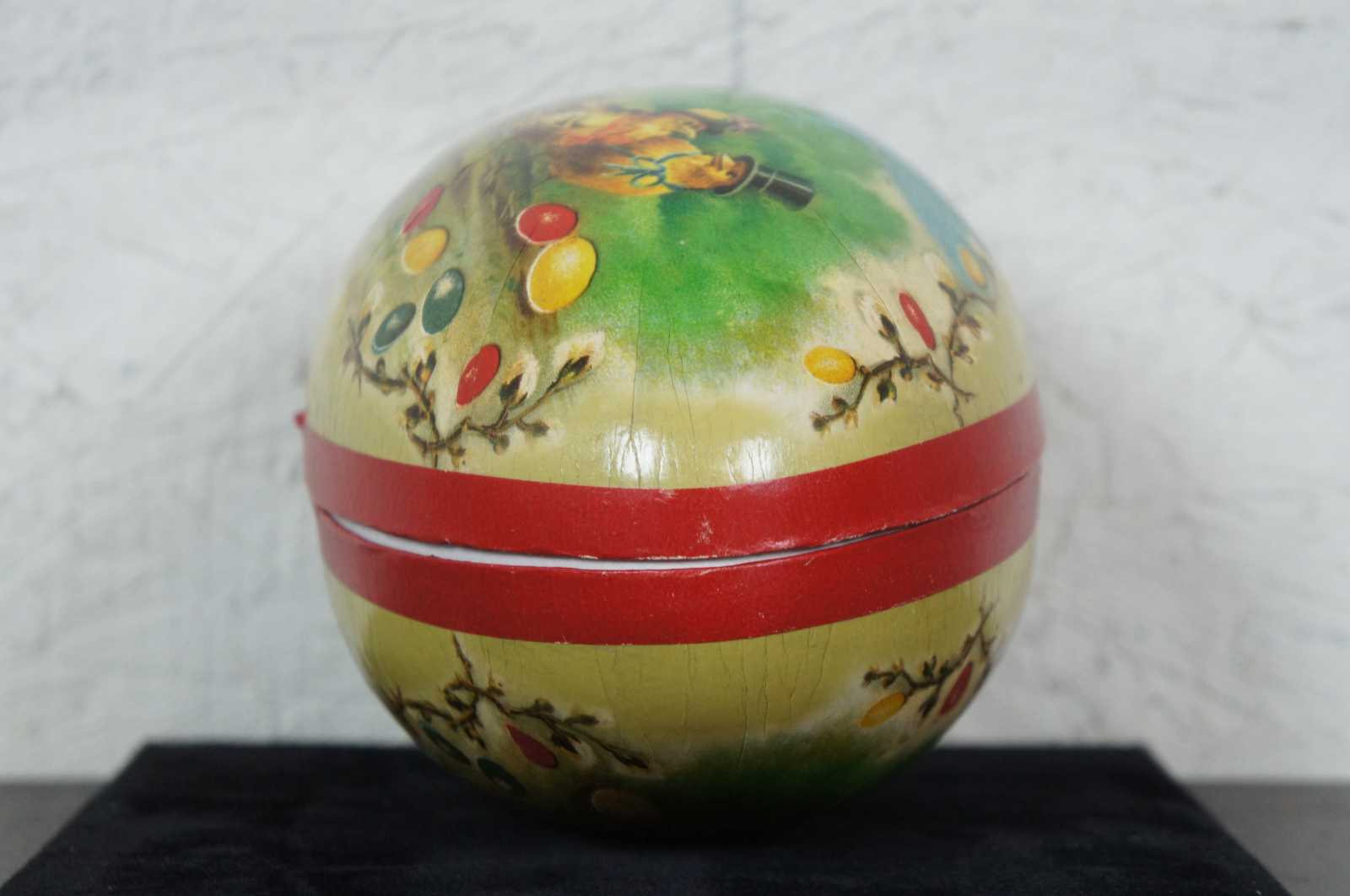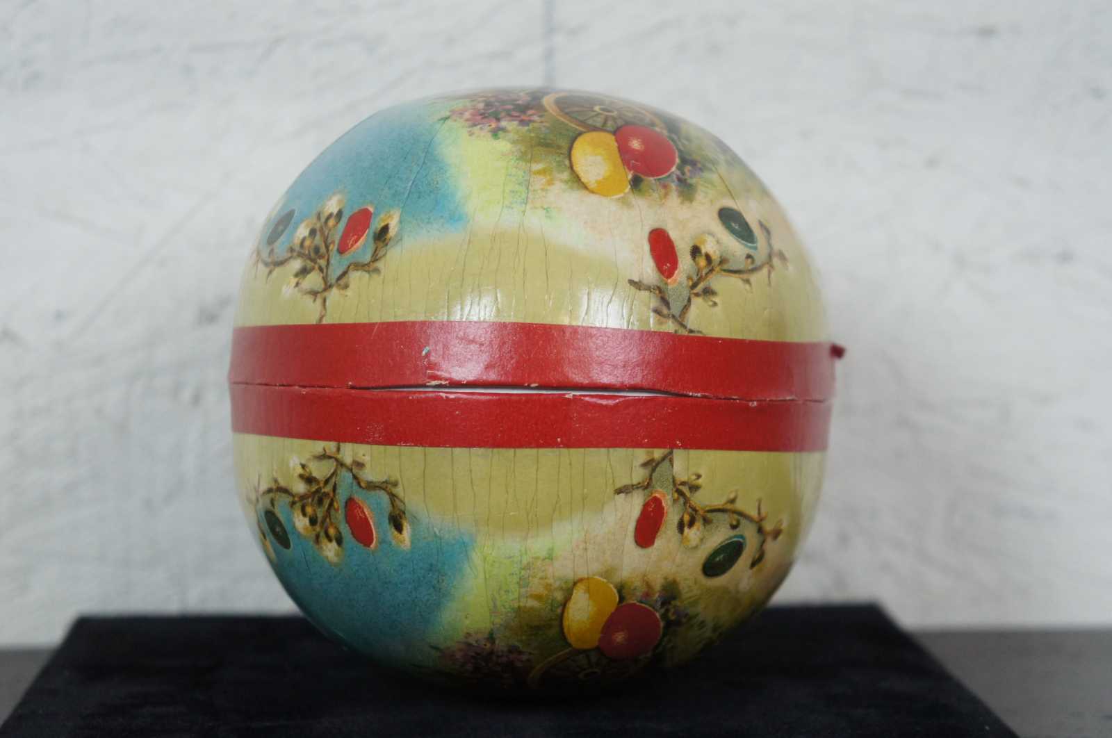 Antique German paper mache Easter egg candy container, featuring a lithograph landscape with Easter eggs and pair of chicks in their Sunday best hats pulling a small cart containing flowers and three bunnies.