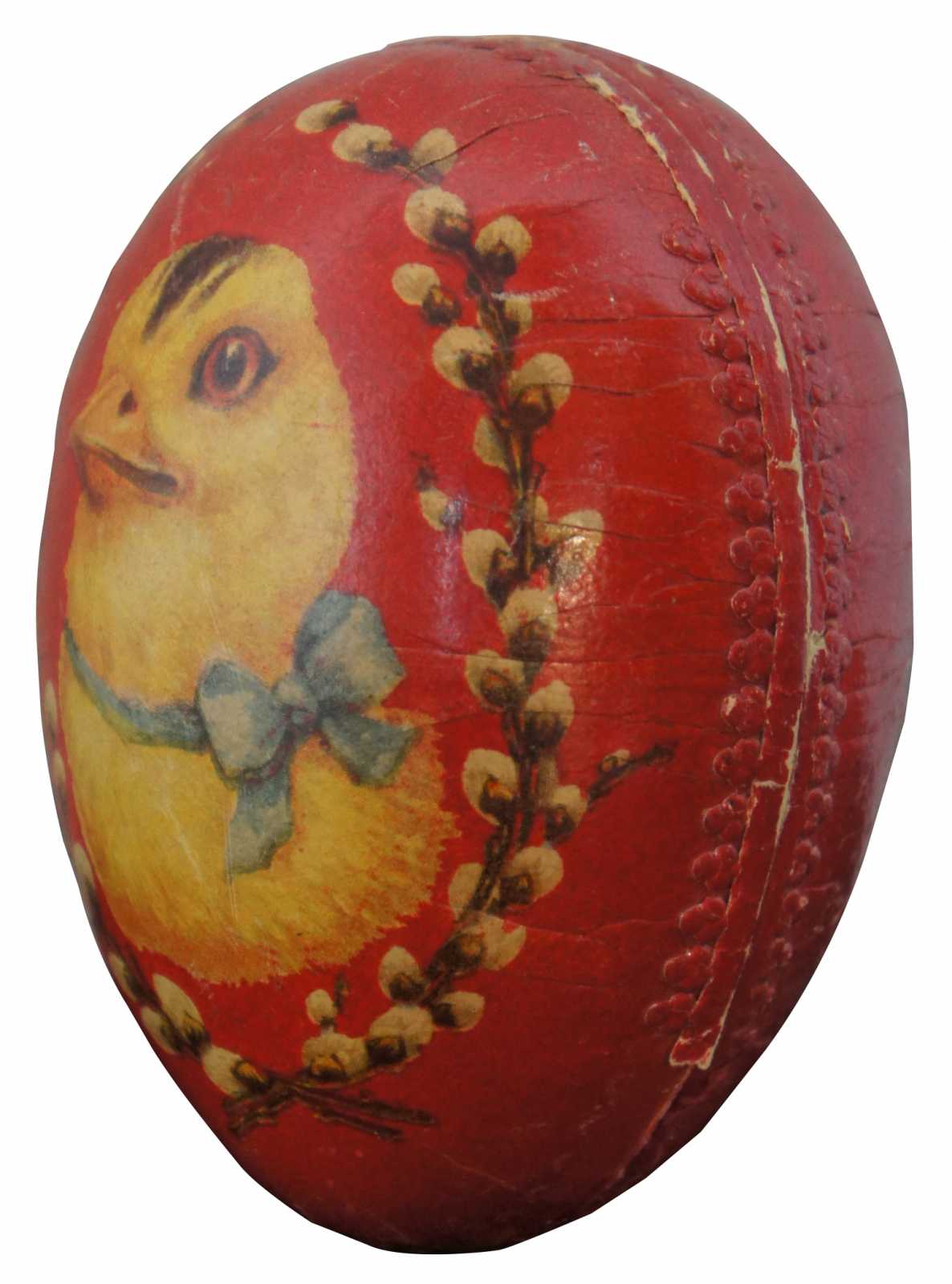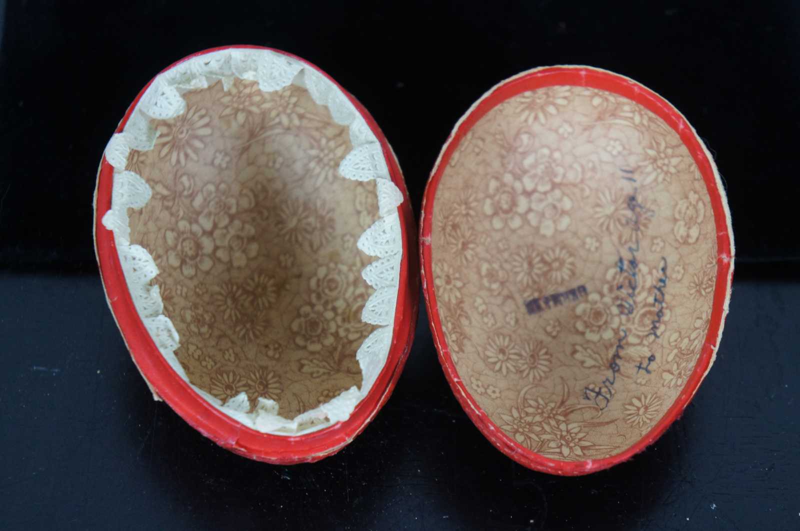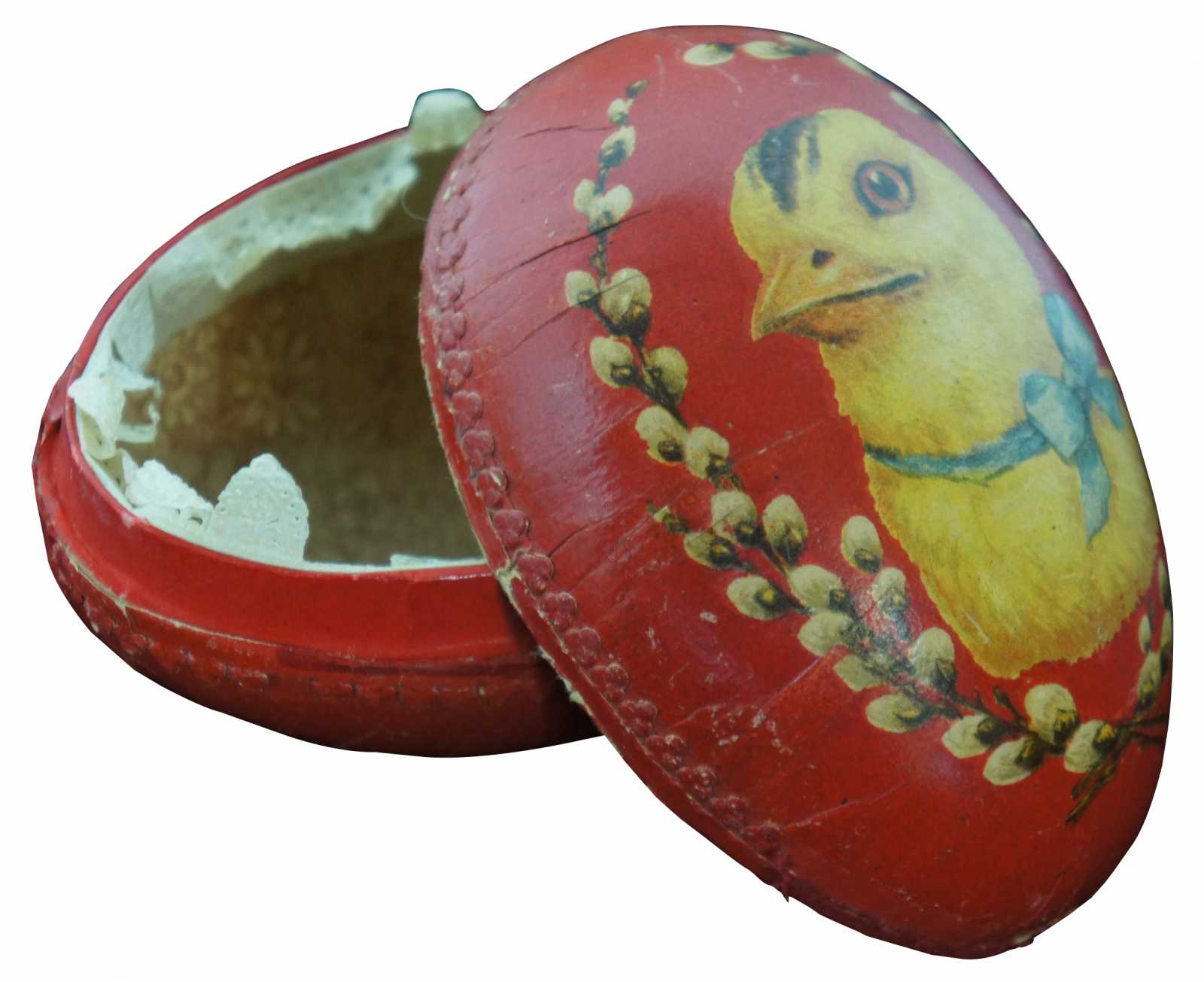 Antique German red paper mache Easter egg candy container, featuring a lithograph of a chick wearing a blue bow surrounded by pussy willows, with paper lace trim around the inside edge. “From Victor Age 11 to Mother” is written in pen inside.