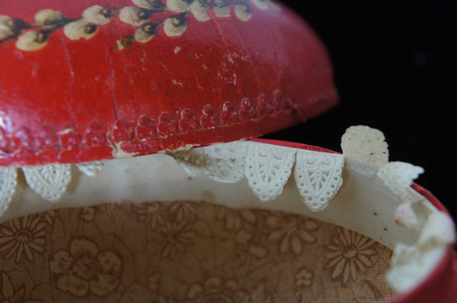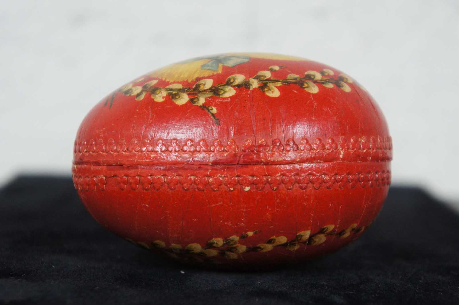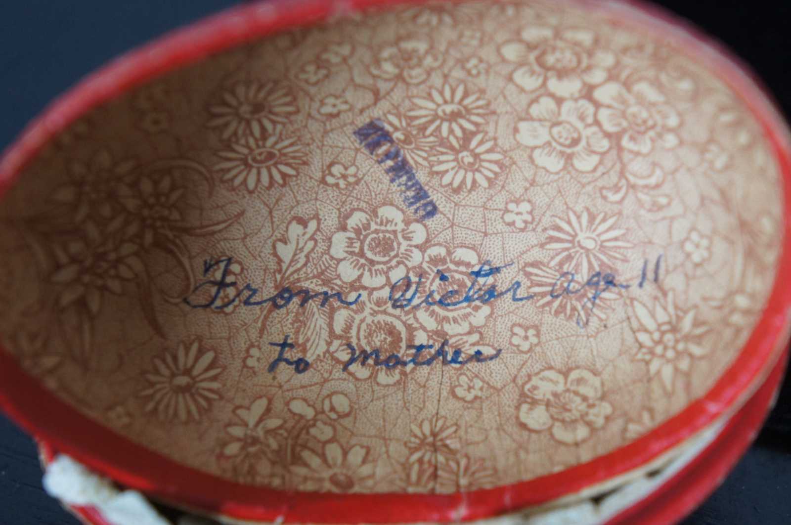 Antique German red paper mache Easter egg candy container, featuring a lithograph of a chick wearing a blue bow surrounded by pussy willows, with paper lace trim around the inside edge. “From Victor Age 11 to Mother” is written in pen inside.