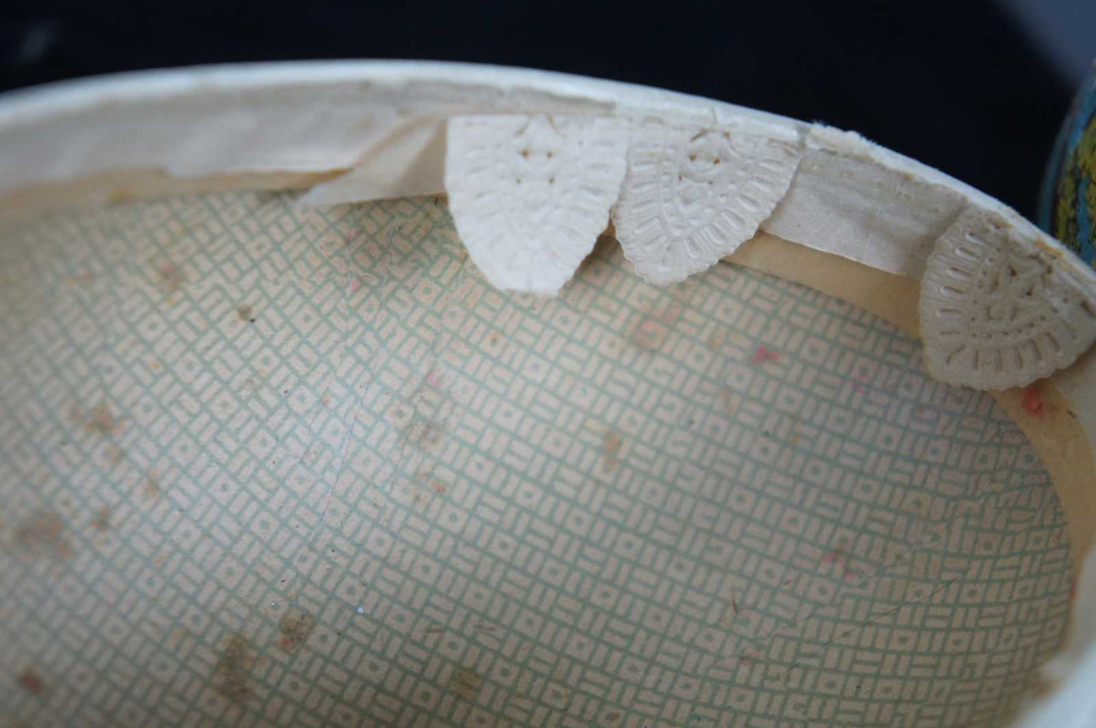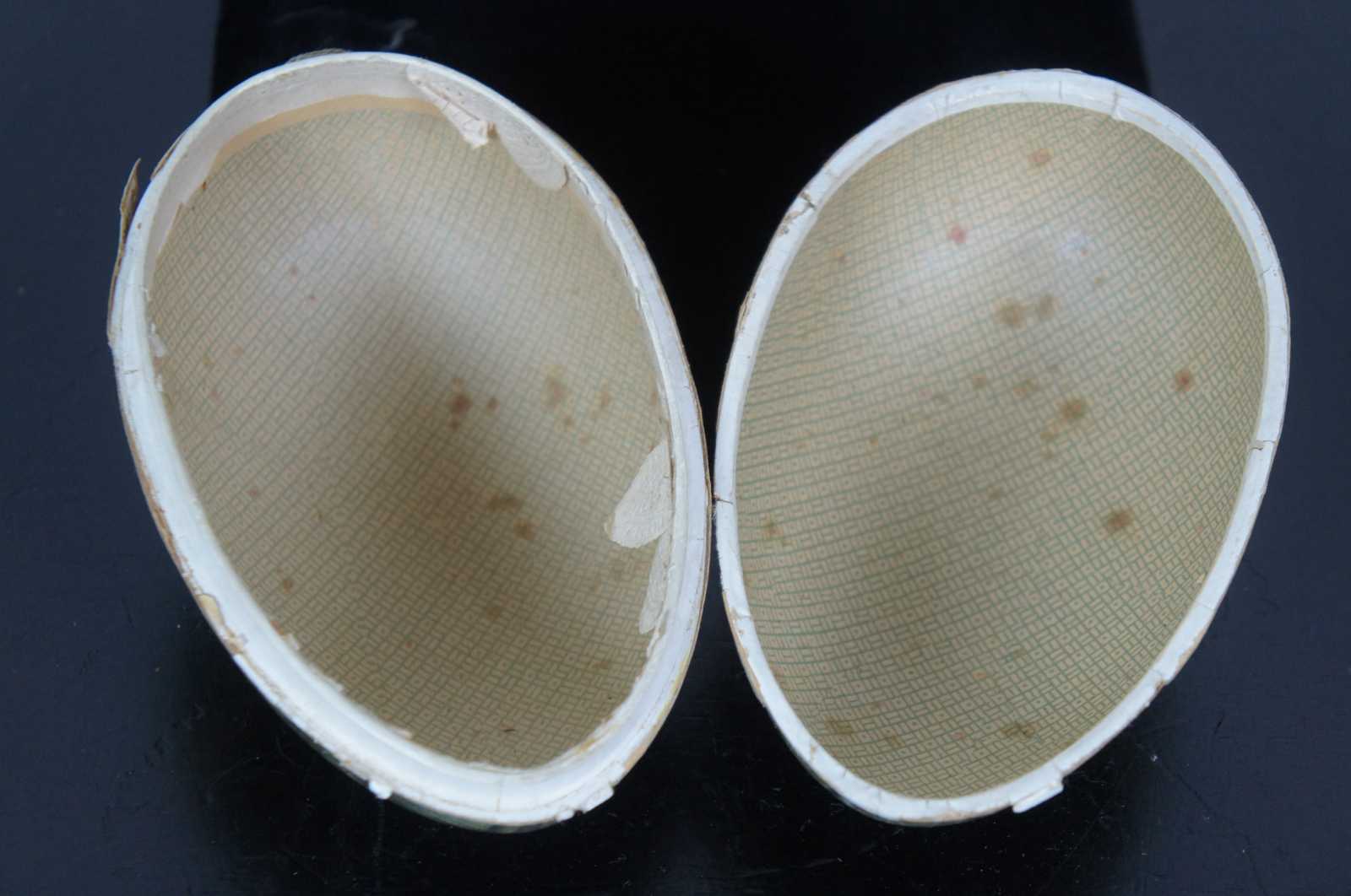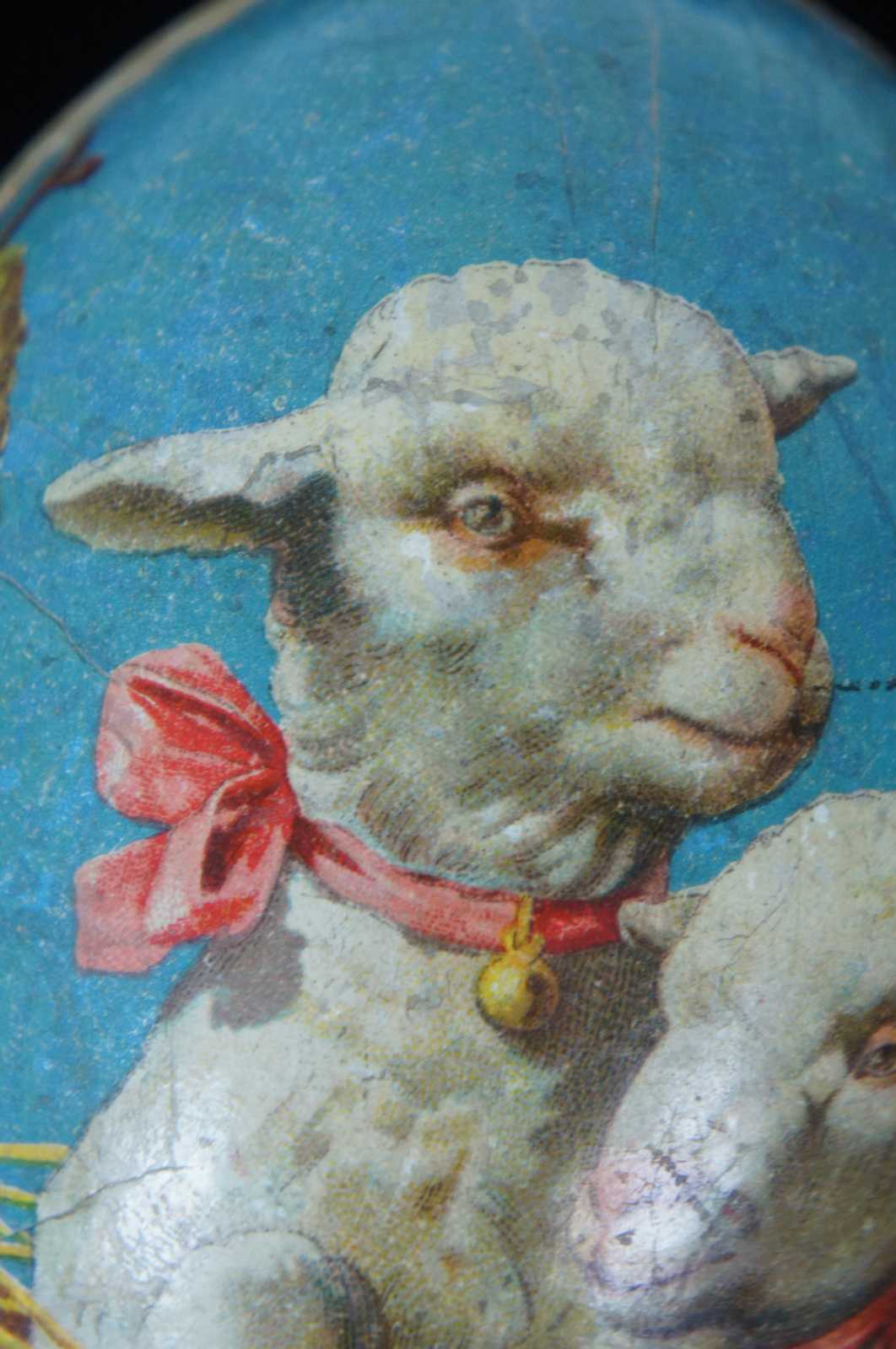 Antique German paper mache Easter egg candy container, featuring lithographs of baskets containing two sheeps / lambs on one side and three rabbits / bunnies on the other, with paper lace trim along the inside edge.