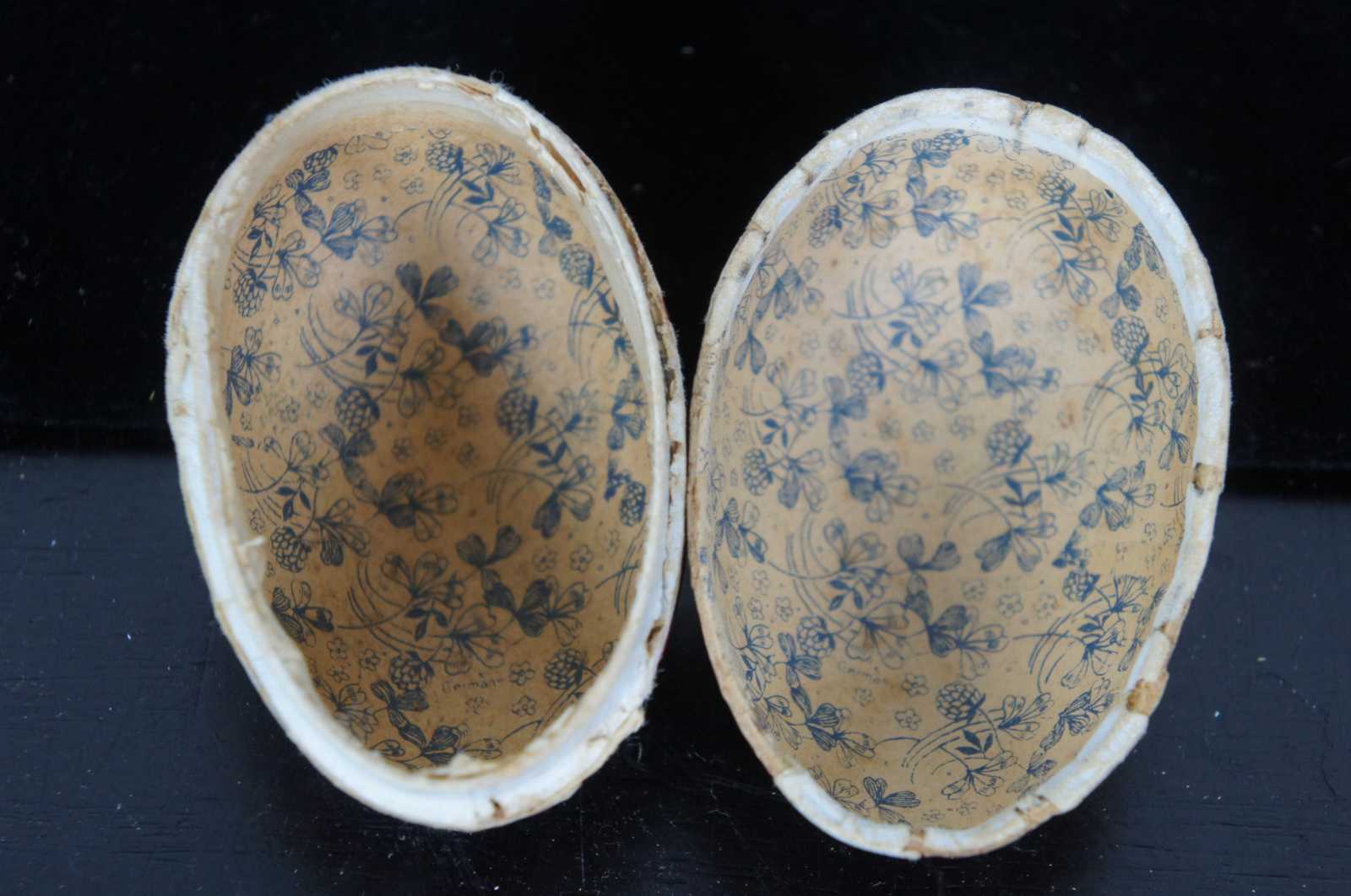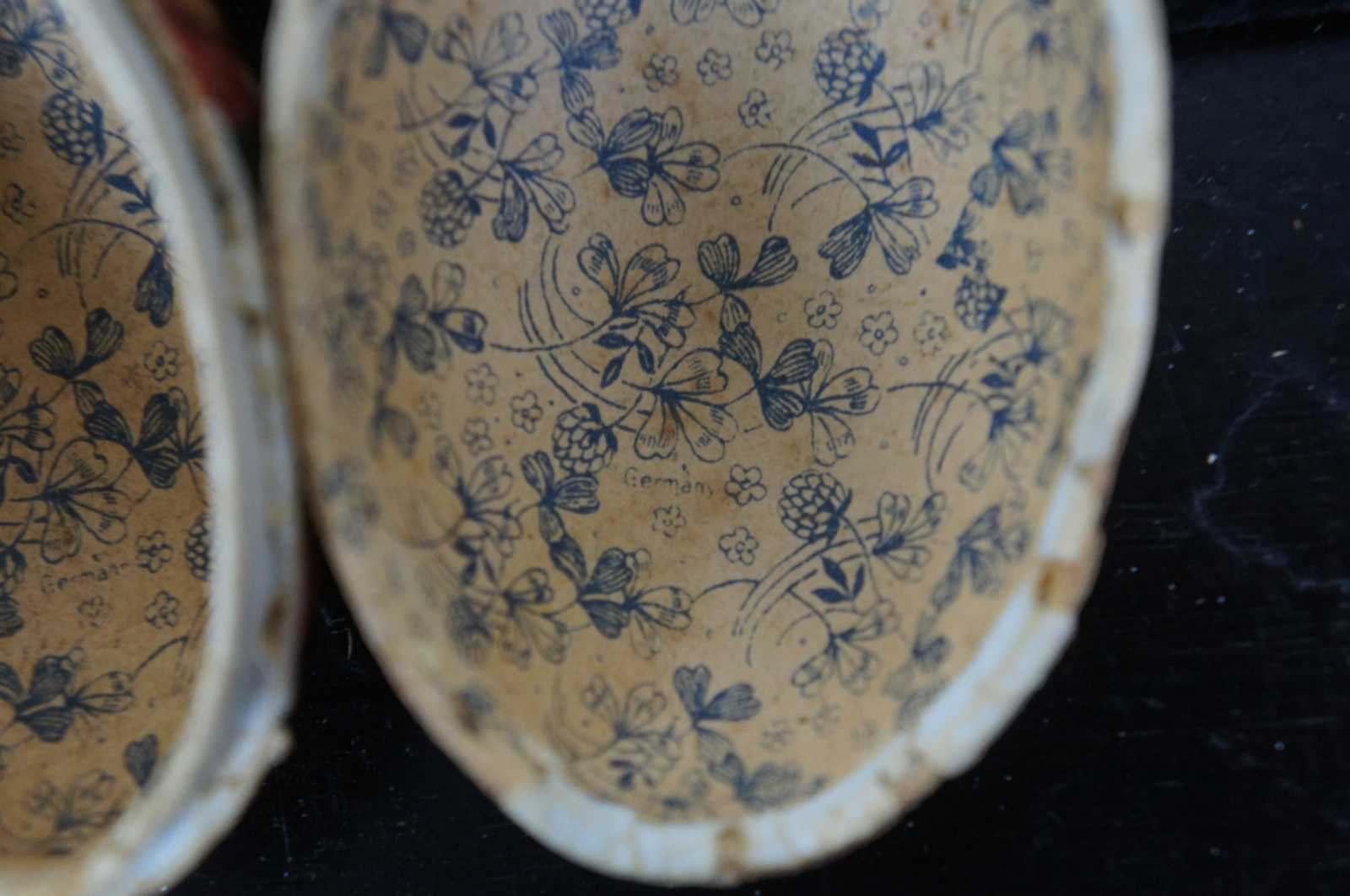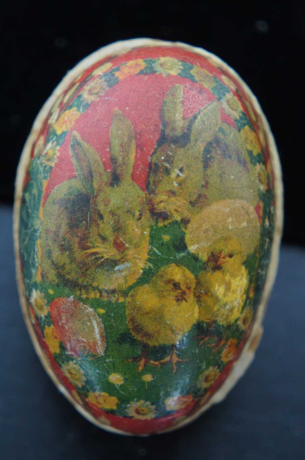 Antique German paper mache Easter egg candy container, featuring a lithograph landscape of rabbits and chicks in a frame of flowers.