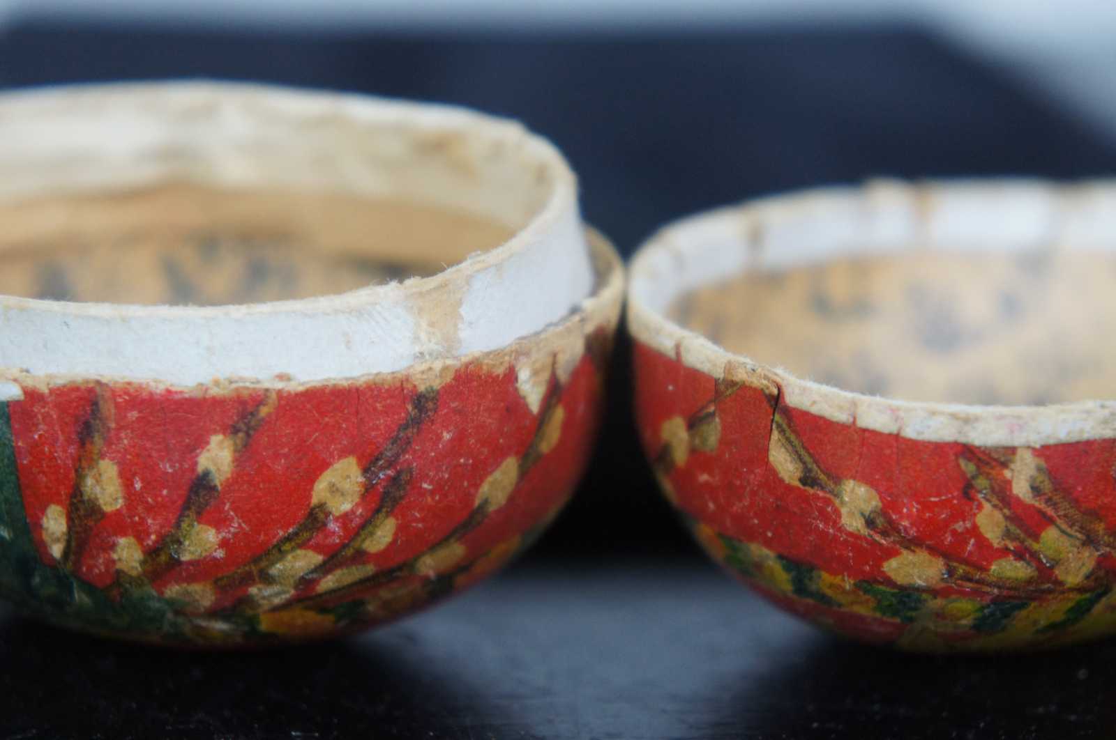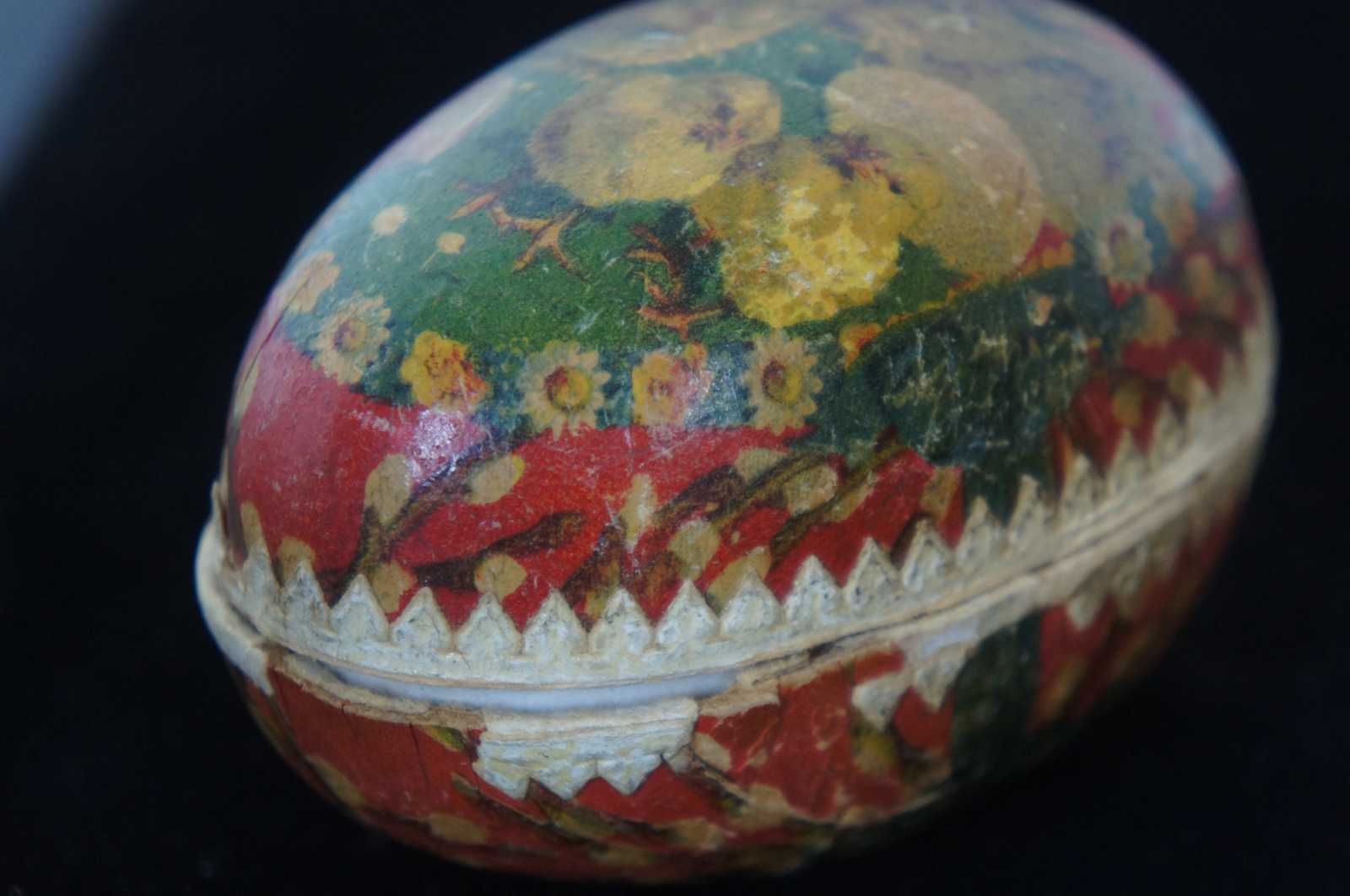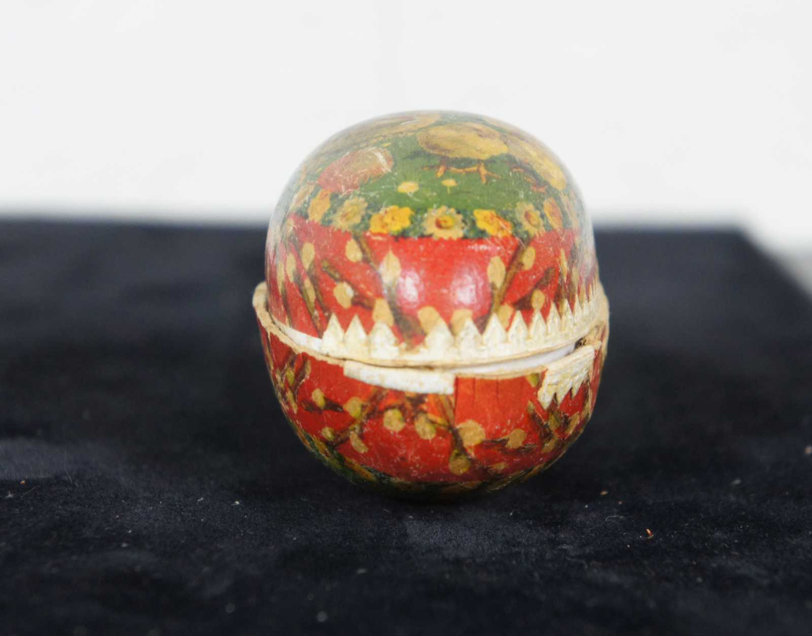 Antique German paper mache Easter egg candy container, featuring a lithograph landscape of rabbits and chicks in a frame of flowers.