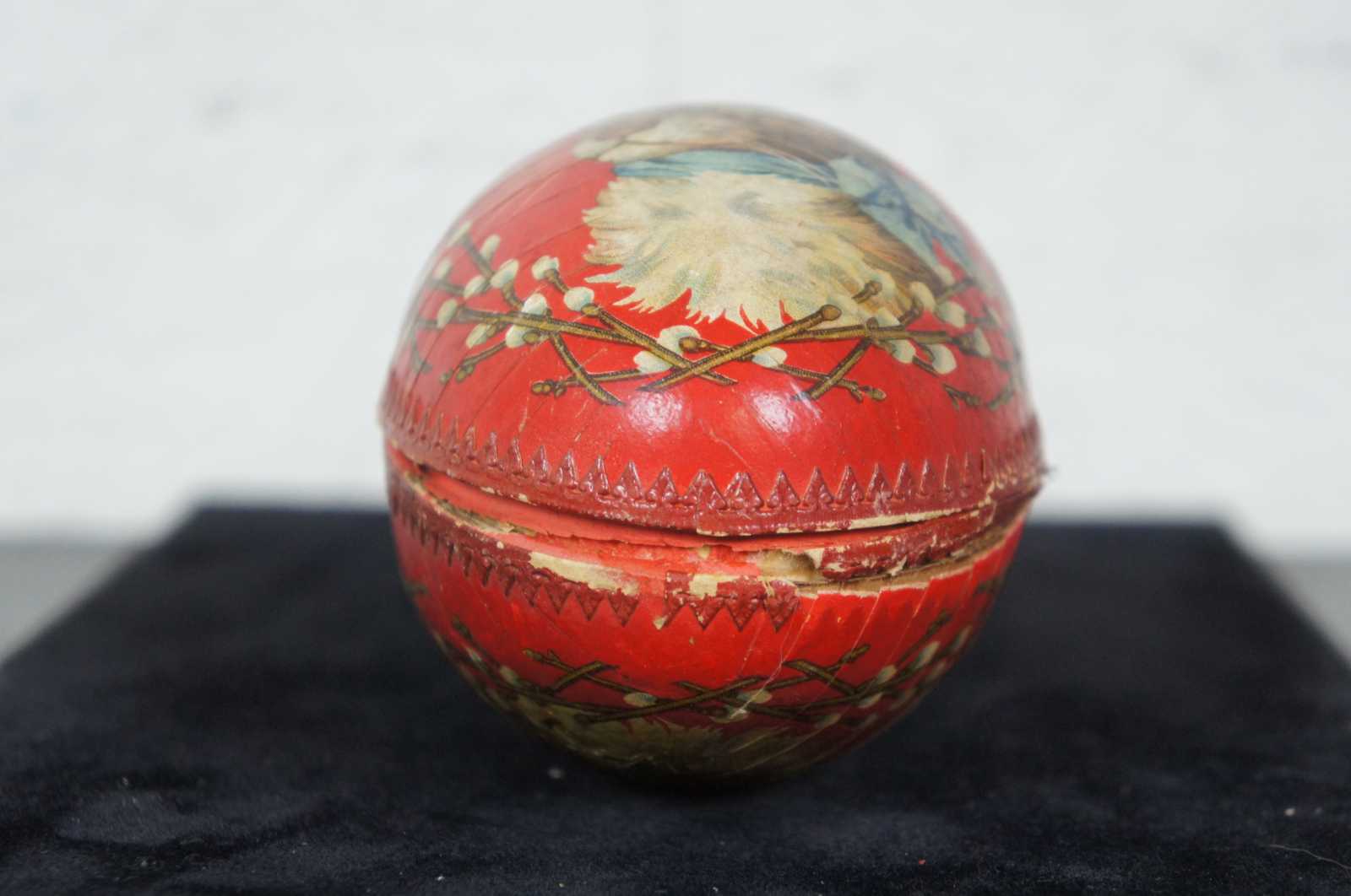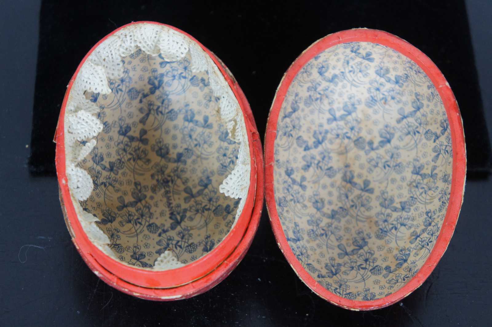 Antique German paper mache Easter egg candy container, featuring a lithograph of a rabbit wearing a blue bow, framed by pussy willows, with paper lace trim around the inside edge.
