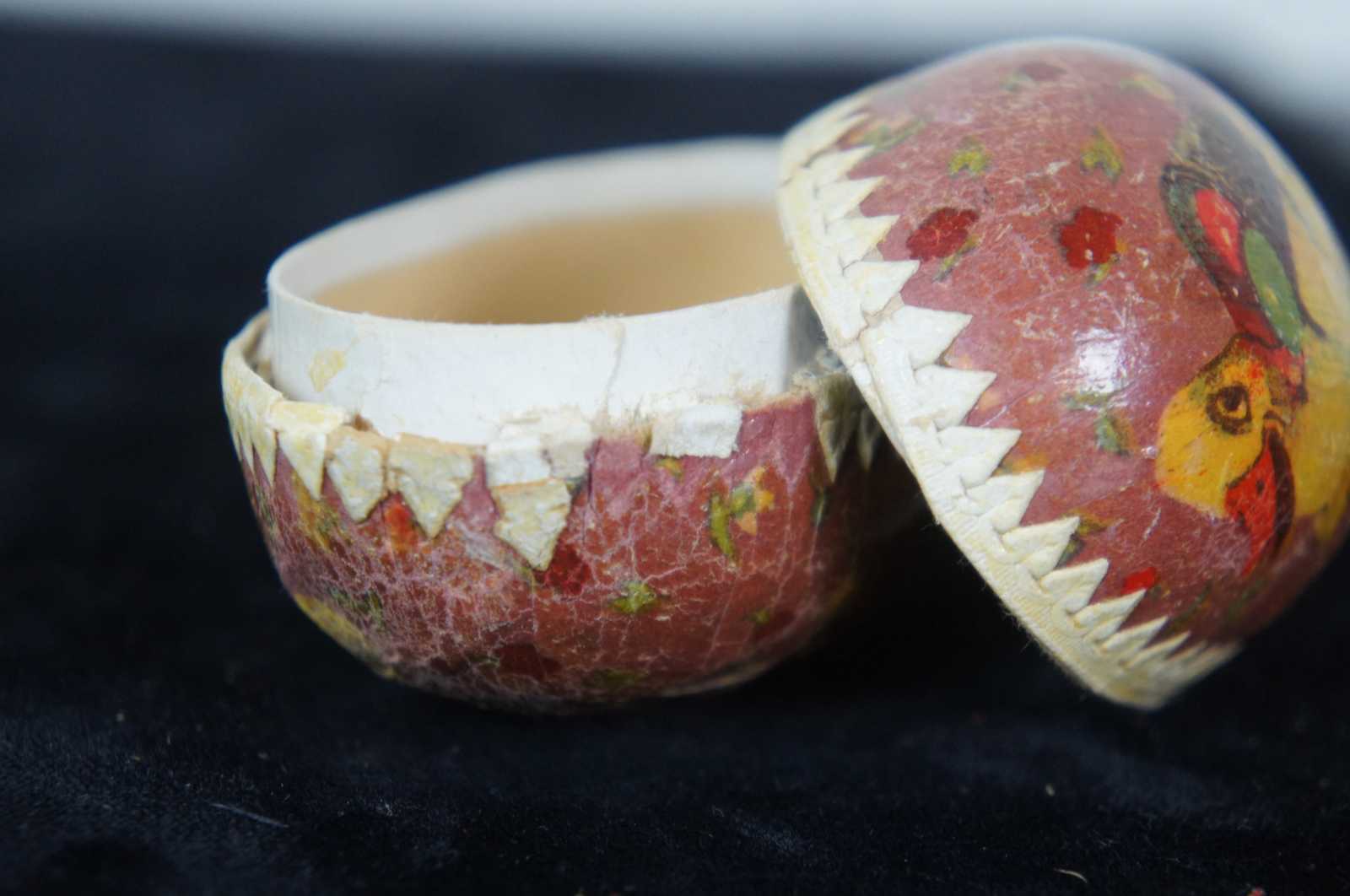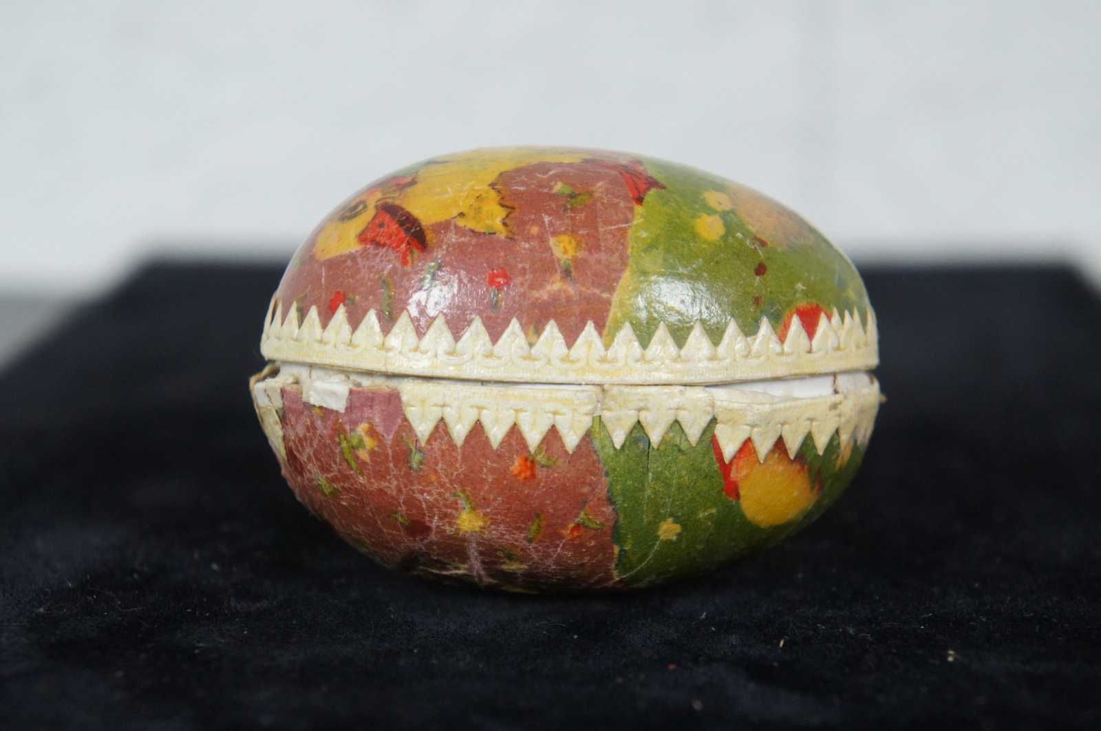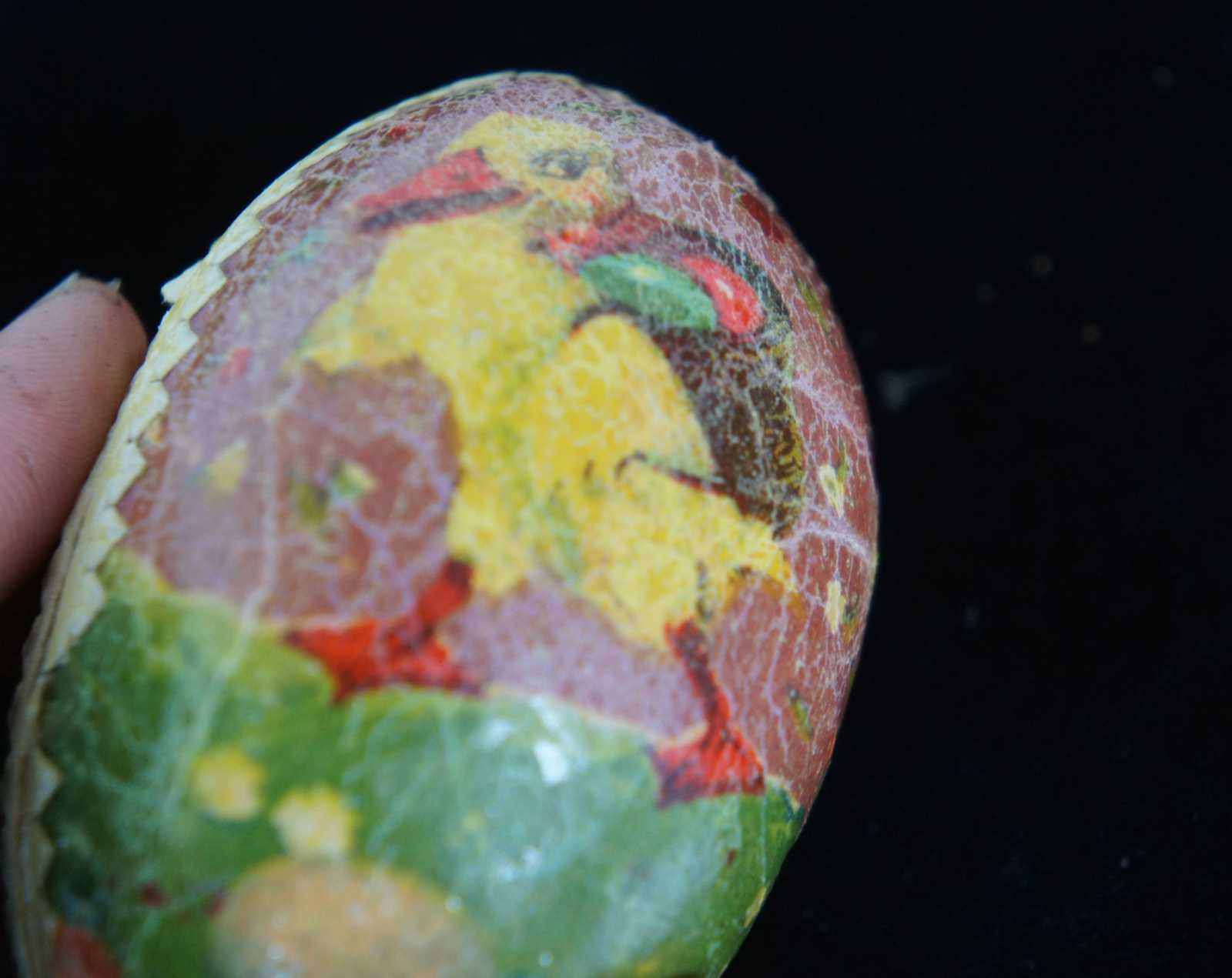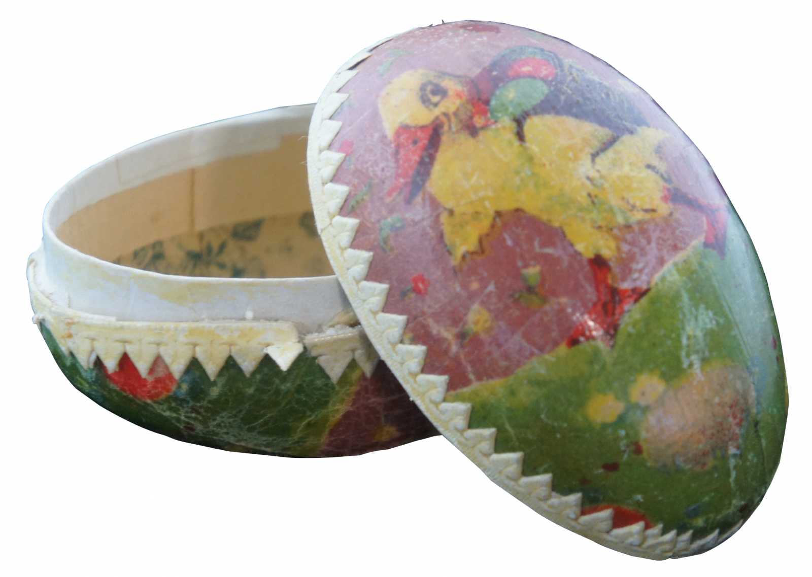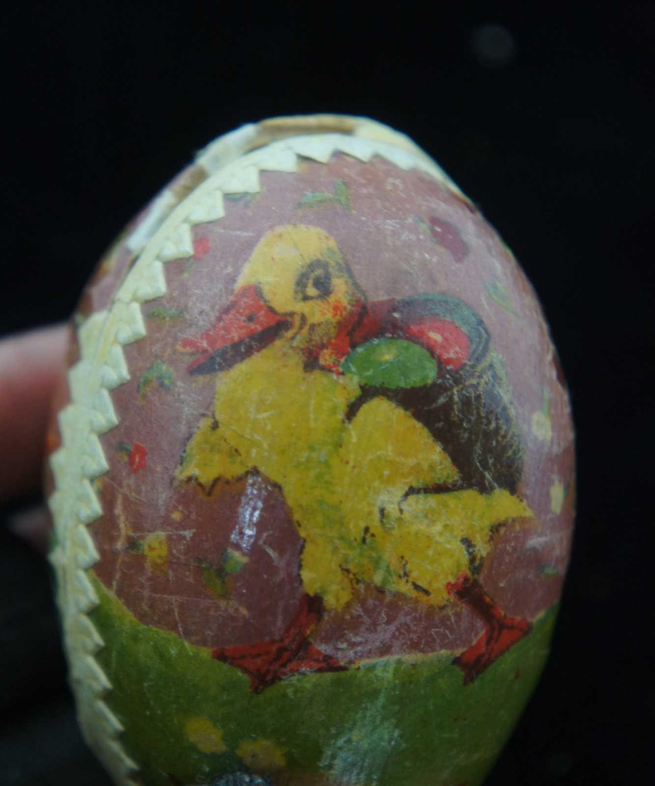 Antique German paper mache Easter egg candy container, featuring a lithograph of a duck walking with a basket of eggs.