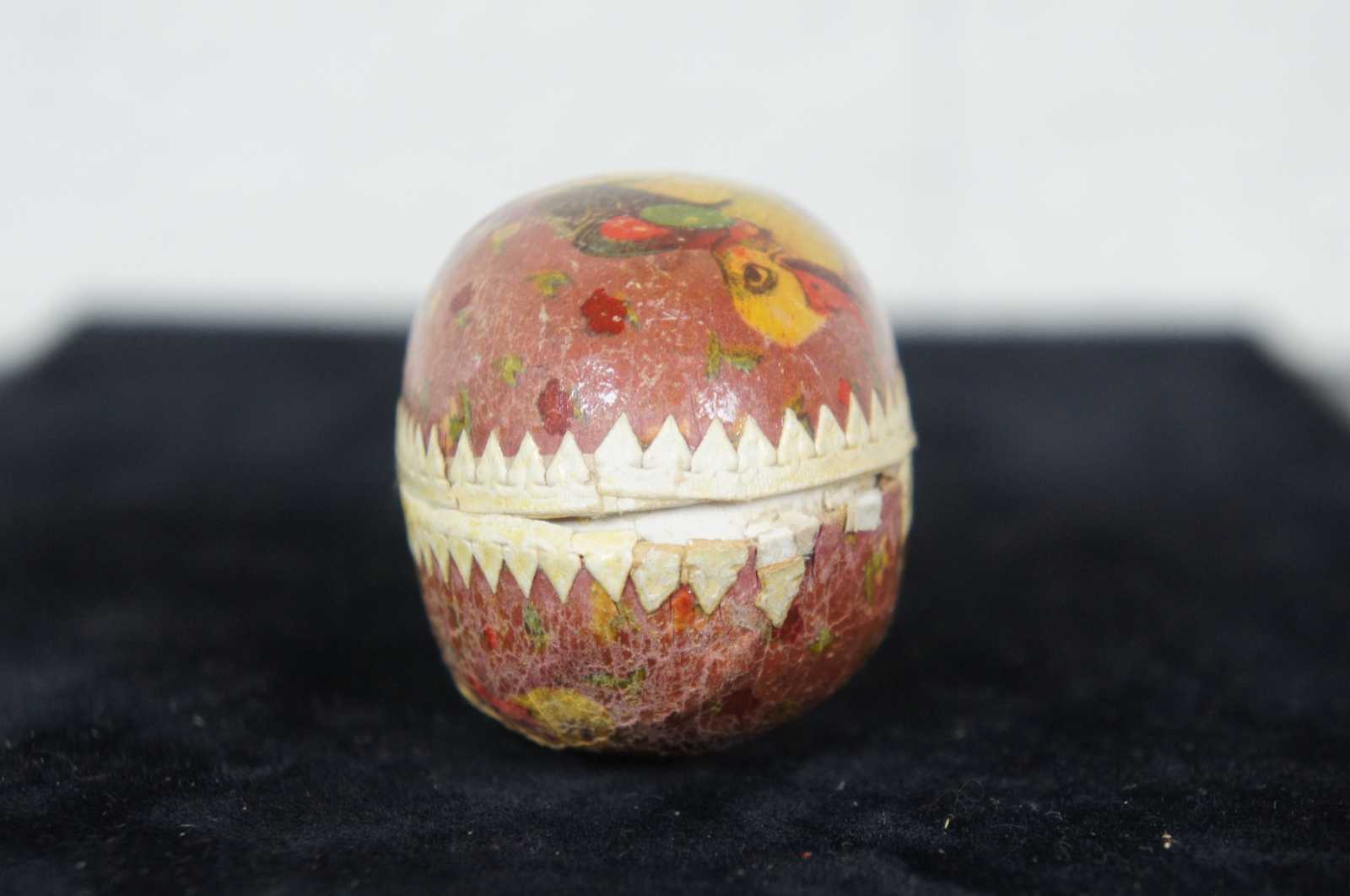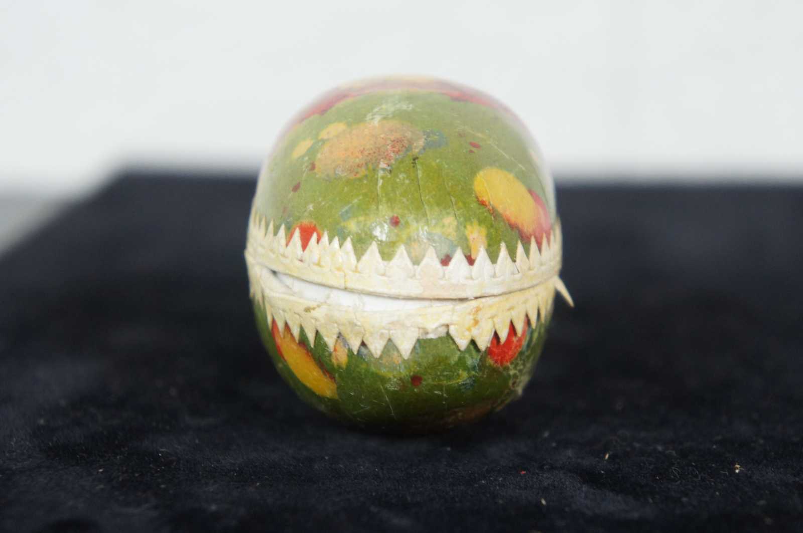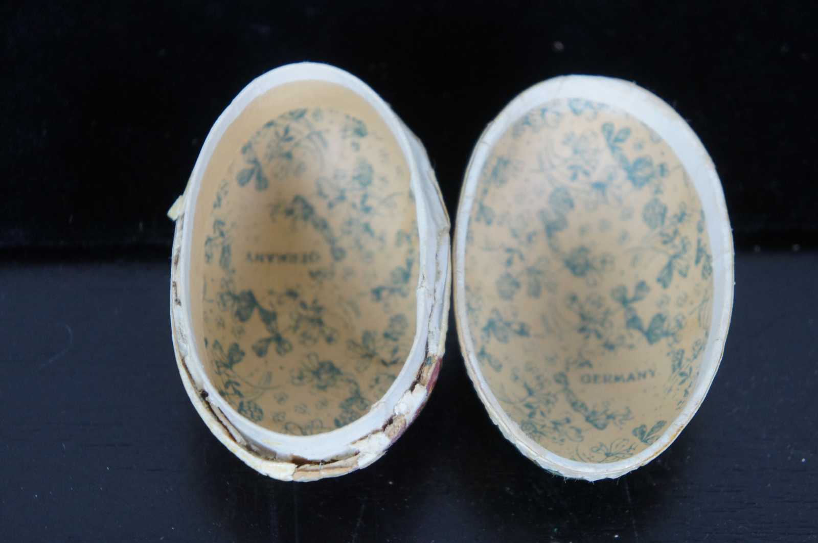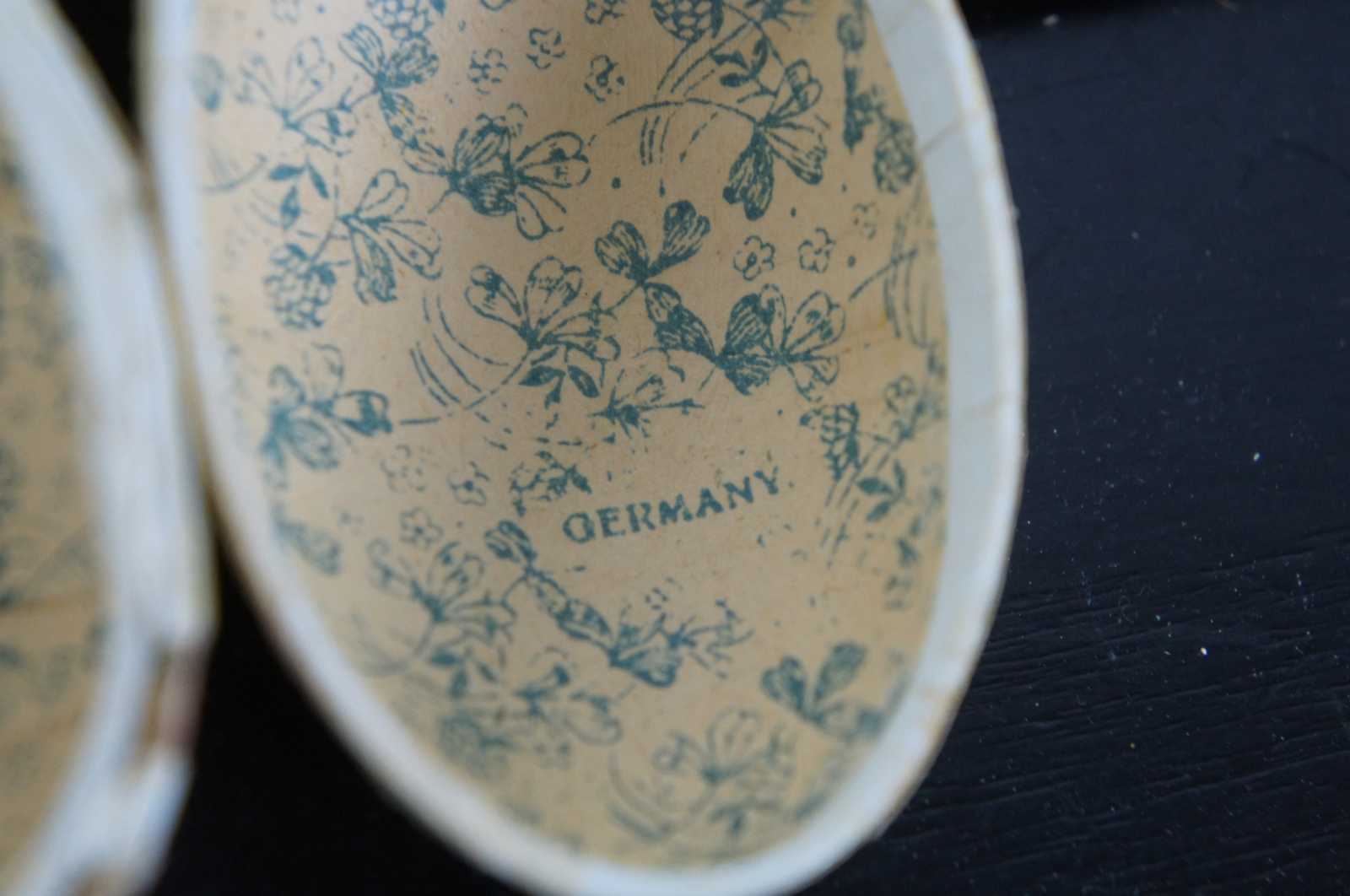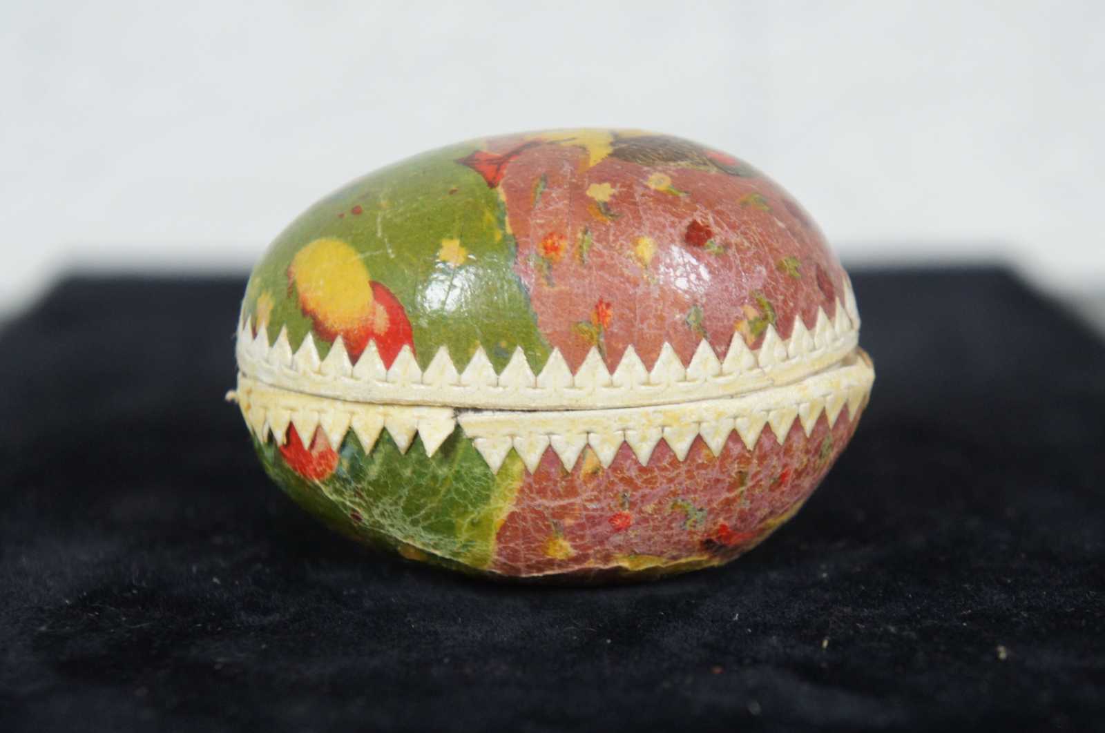 Antique German paper mache Easter egg candy container, featuring a lithograph of a duck walking with a basket of eggs.