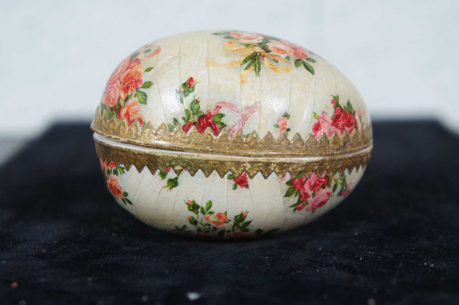 Antique German paper mache Easter egg candy container, featuring a lithograph pattern of pink and peach roses, with paper lace trim around the inside edge.