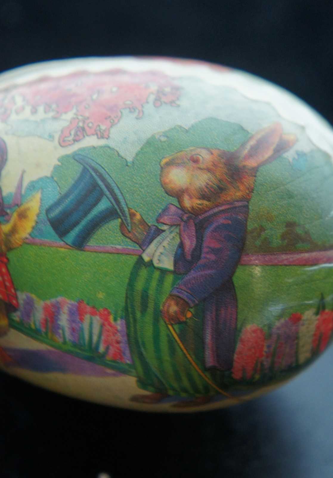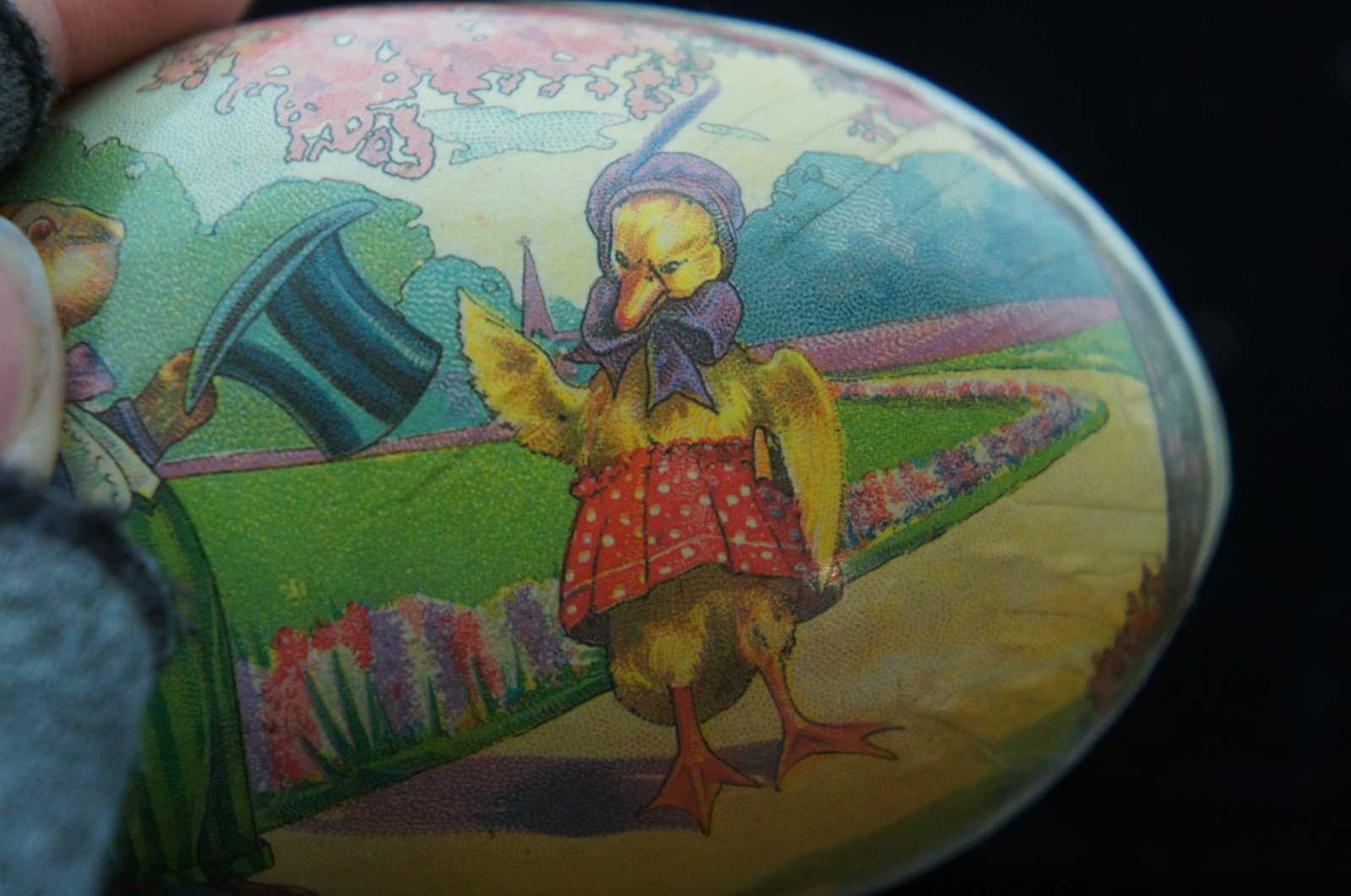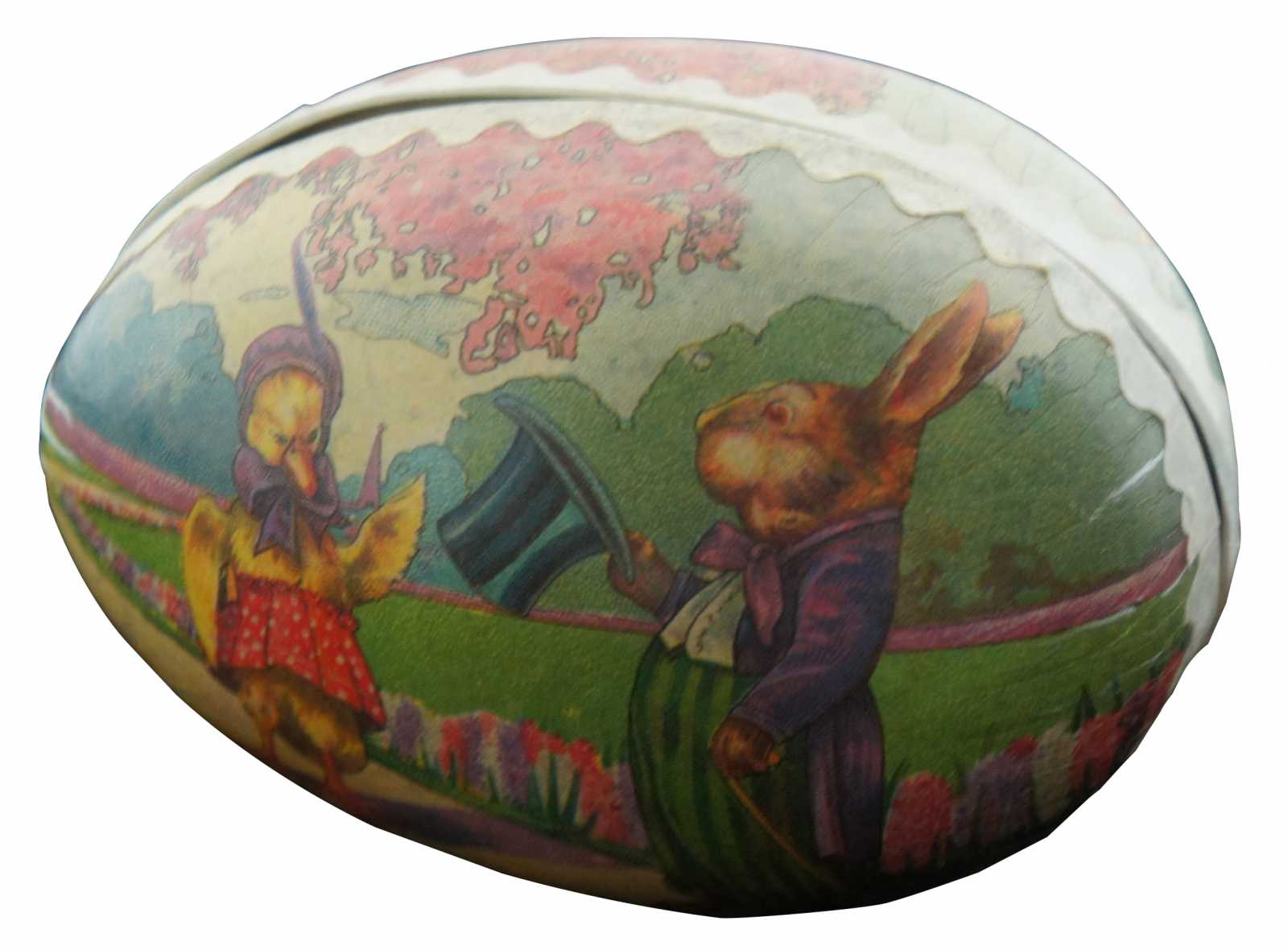 Antique German paper mache Easter egg candy container, featuring a lithograph scene showing an anthropomorphized duck rejecting the advances of a well dressed rabbit in the park.