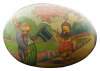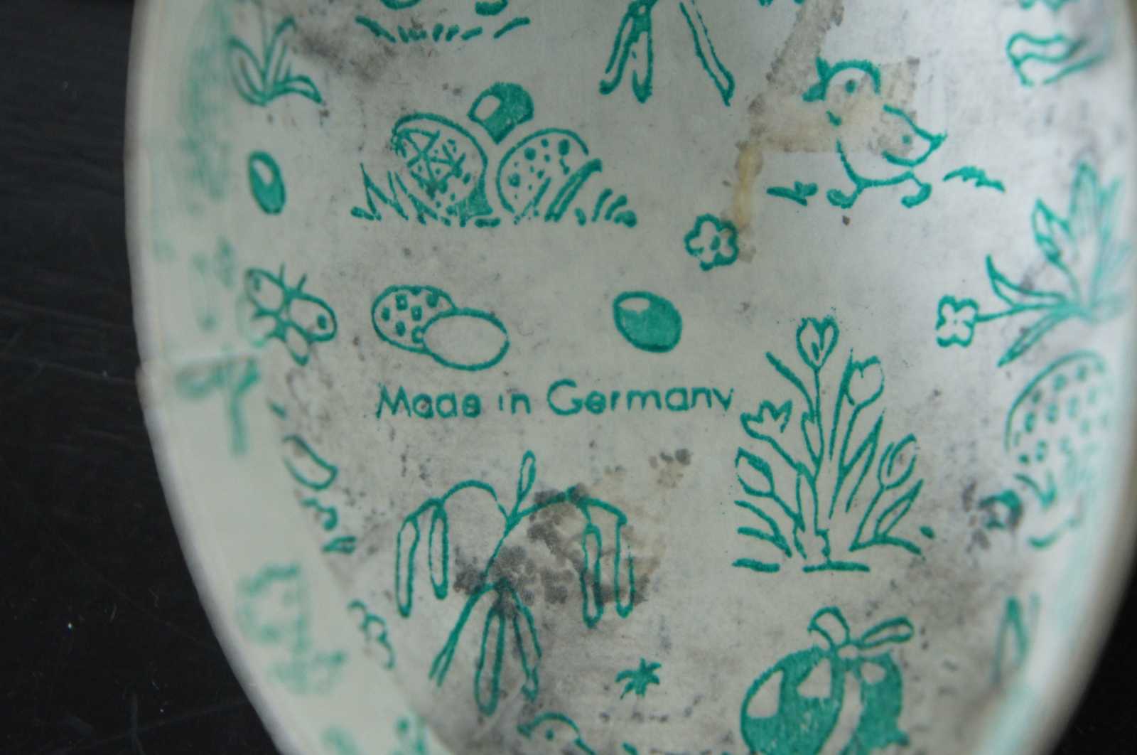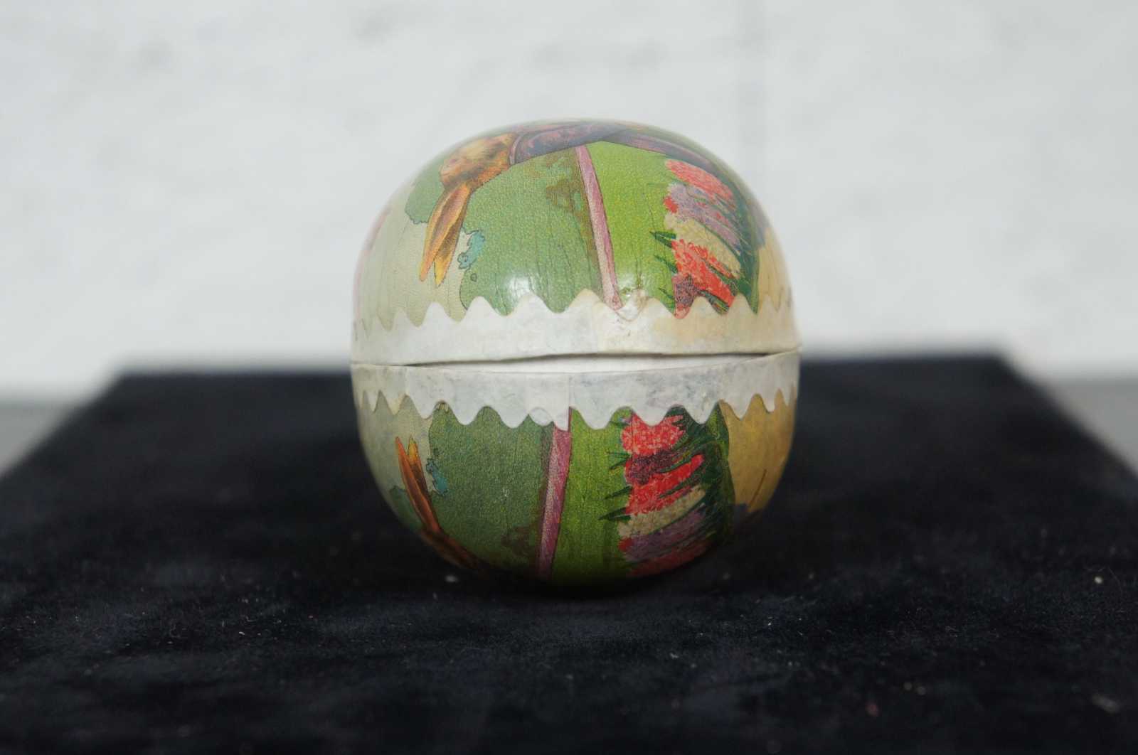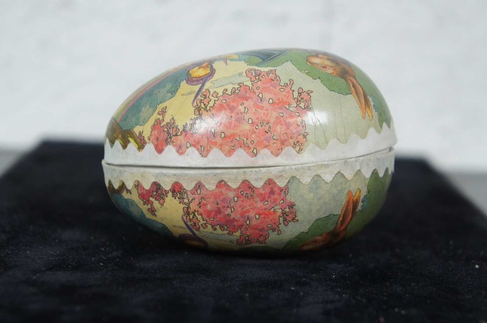 Antique German paper mache Easter egg candy container, featuring a lithograph scene showing an anthropomorphized duck rejecting the advances of a well dressed rabbit in the park.