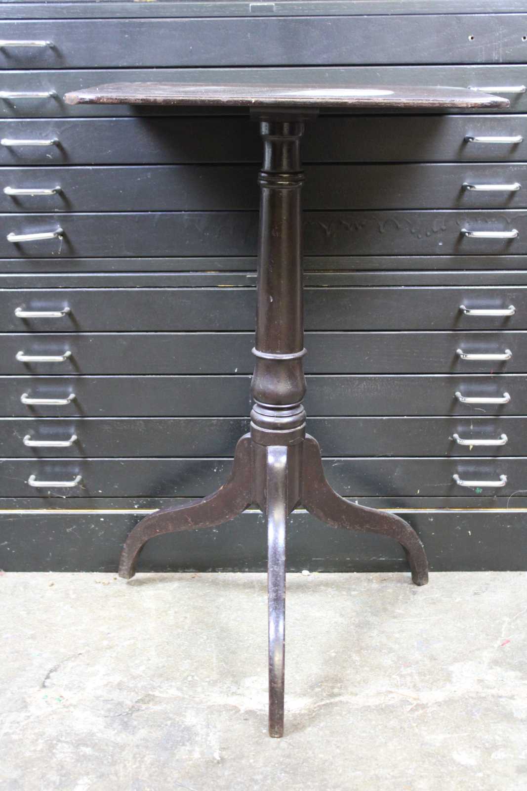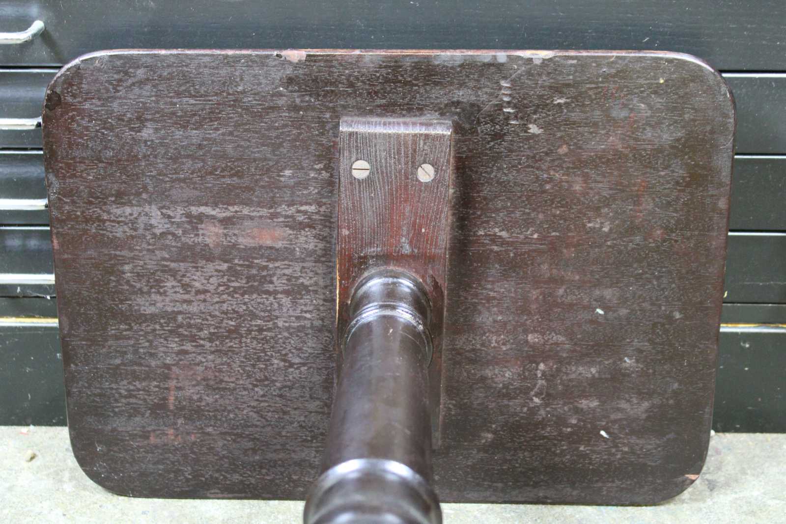 Antique Sheraton mahogany side table or candle stand, with turned pedestal base, tripod feet and a rectangular top.