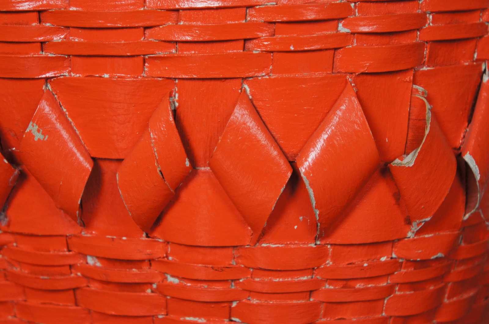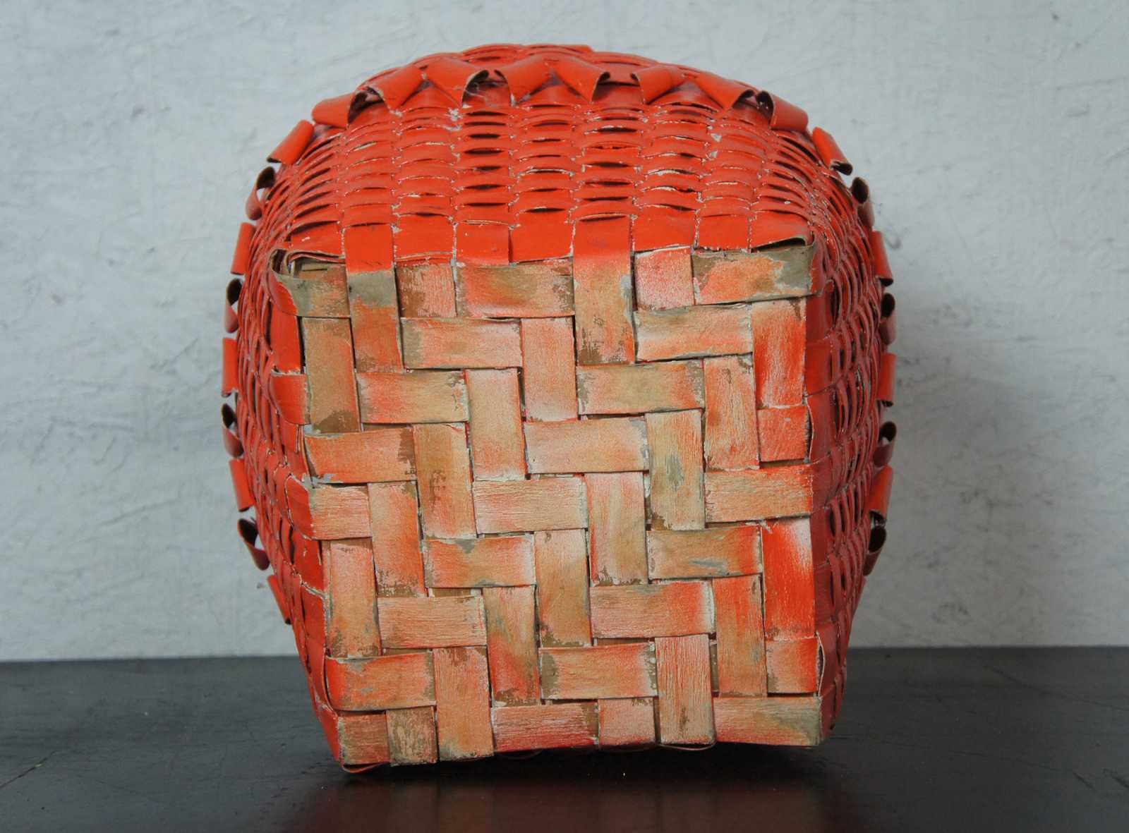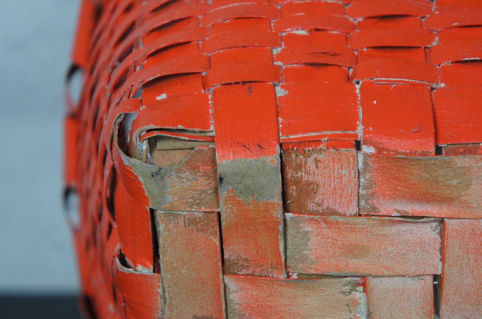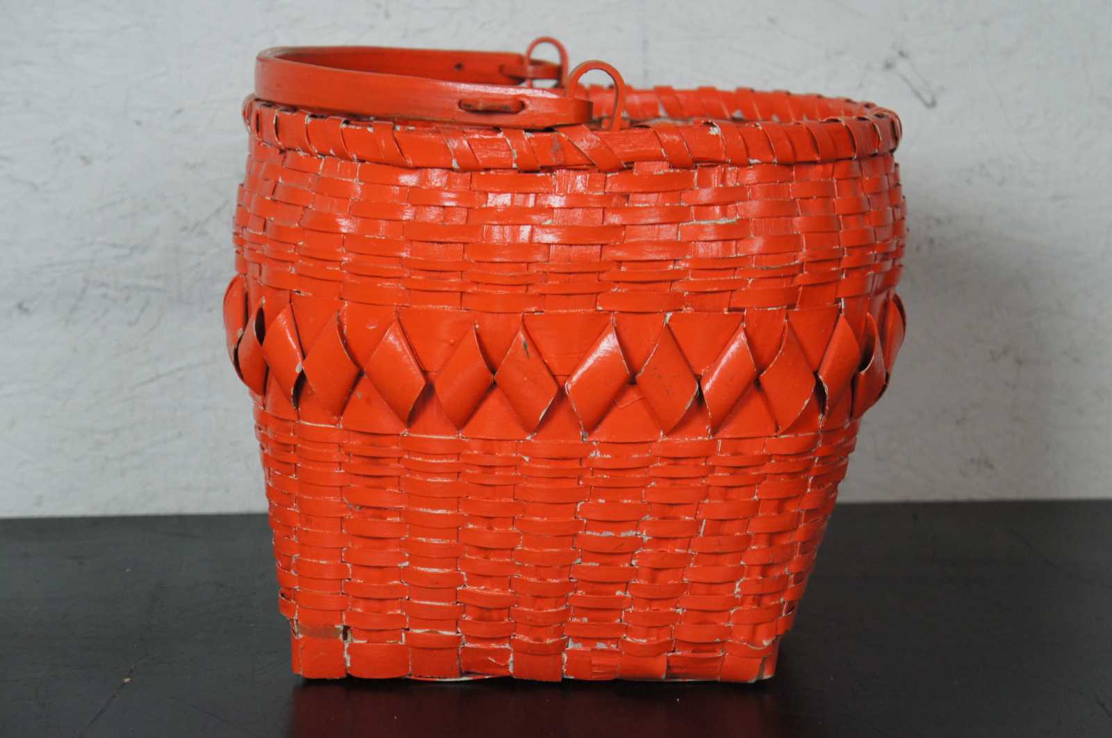 Antique woven wicker burnt orange painted bushel basket with rotating bentwood swing handle.