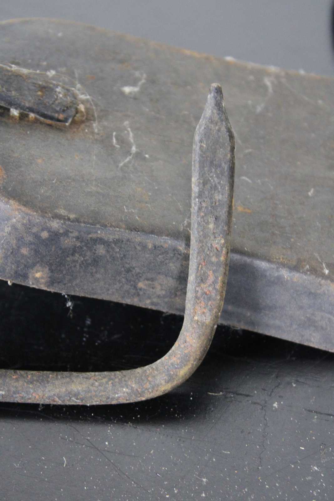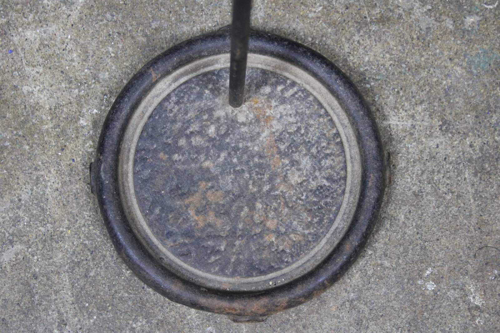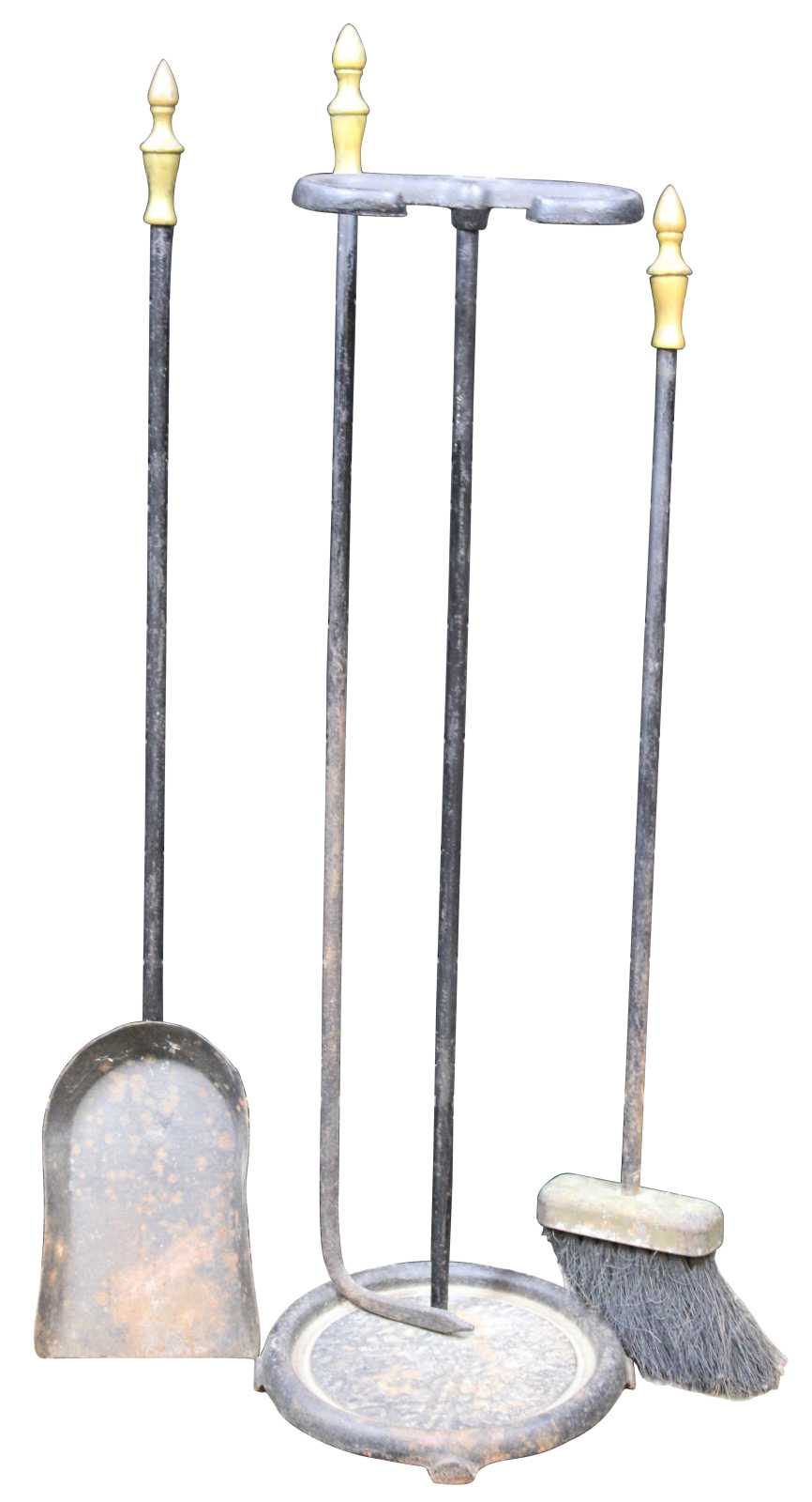 Antique cast iron and brass finial fireplace tool set including a stand, shovel, poker, and broom.