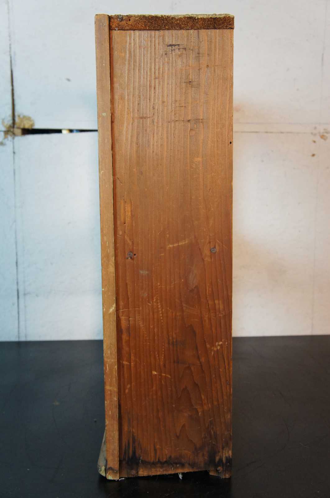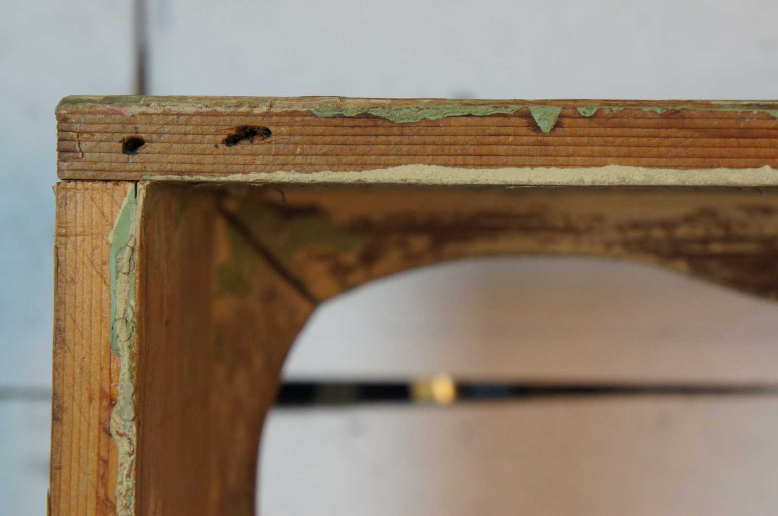 Antique natural pine wooden wall shelf with two tiers and serpentine form with proscenium style framed around the front.