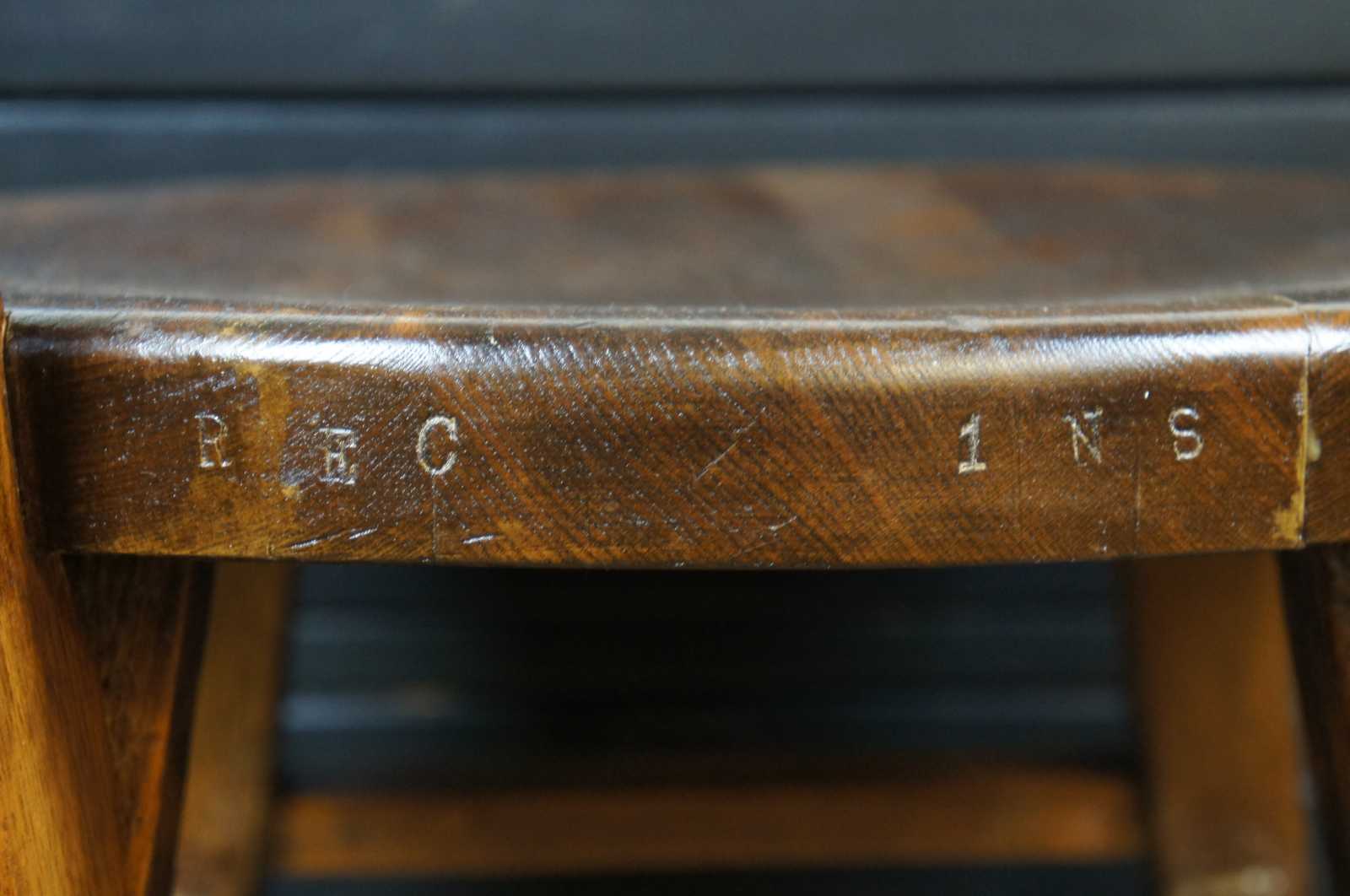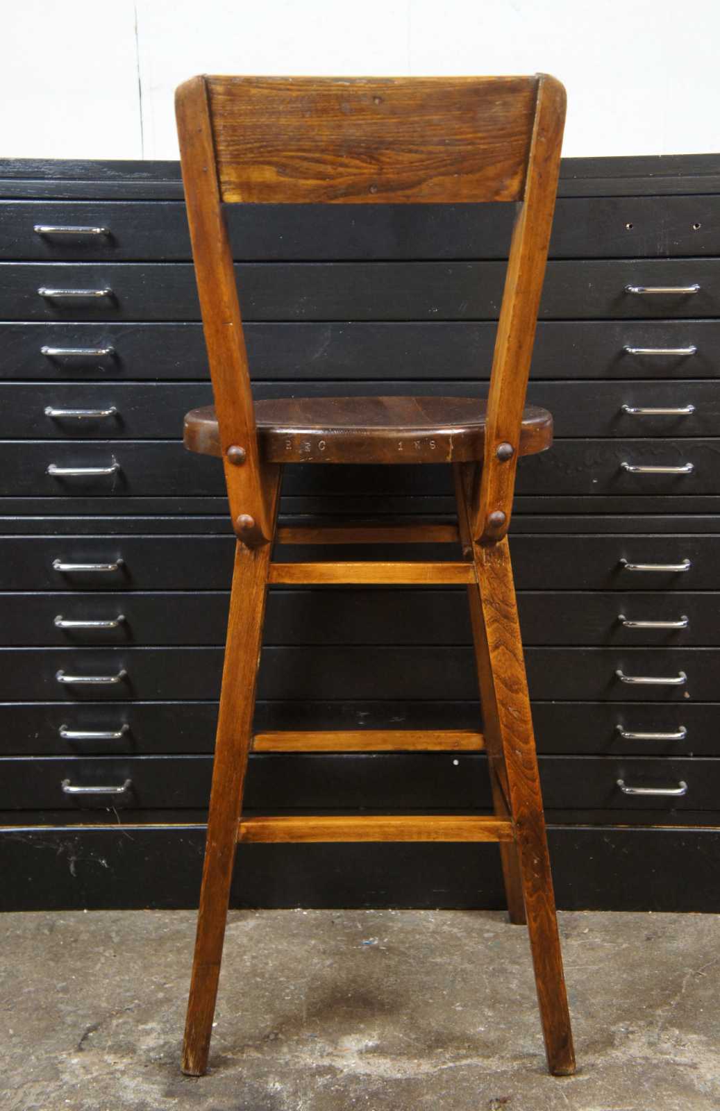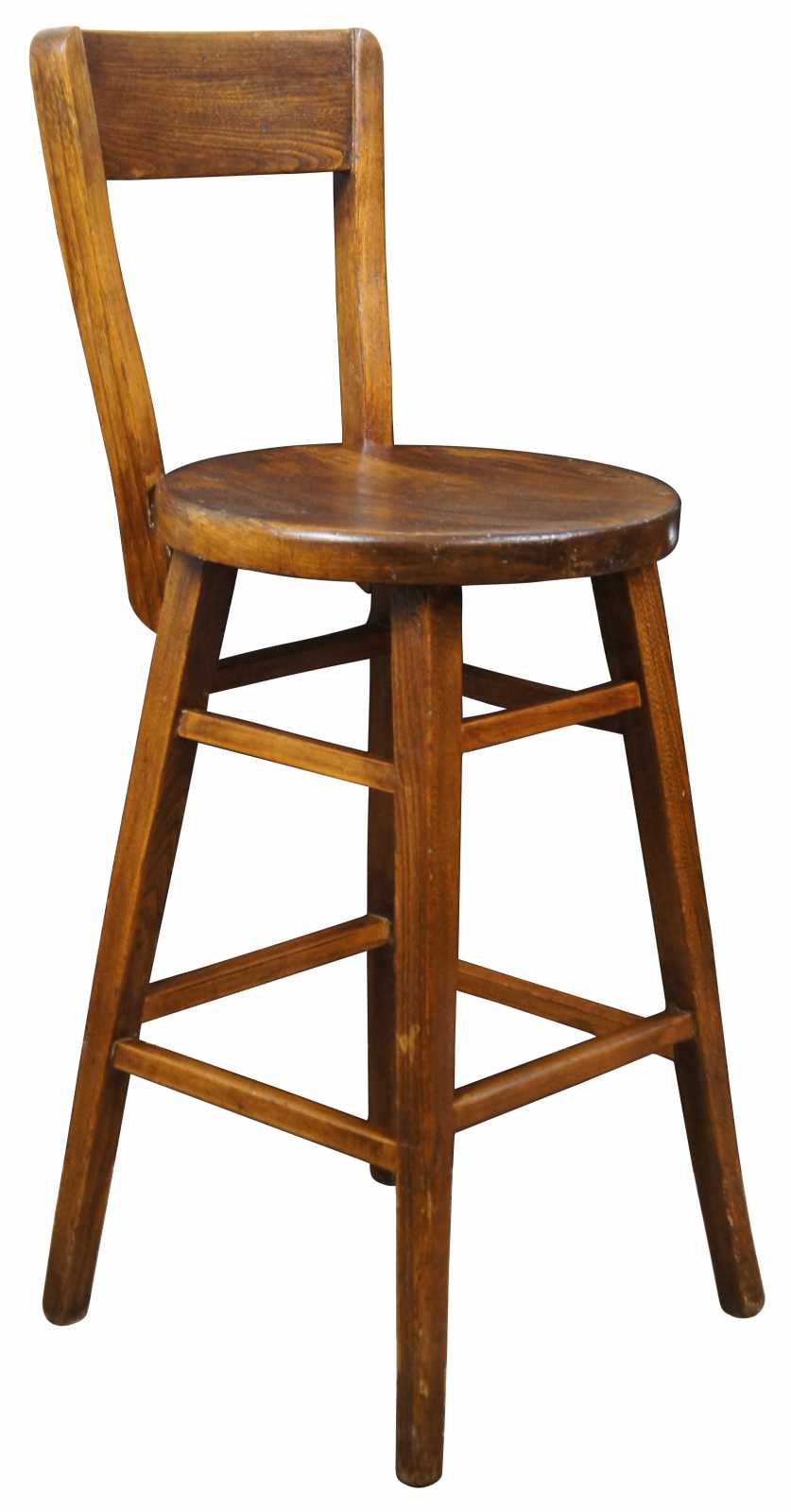 Antique country style oak counter or bar stool. Marked Rec Ins along the back of seat.