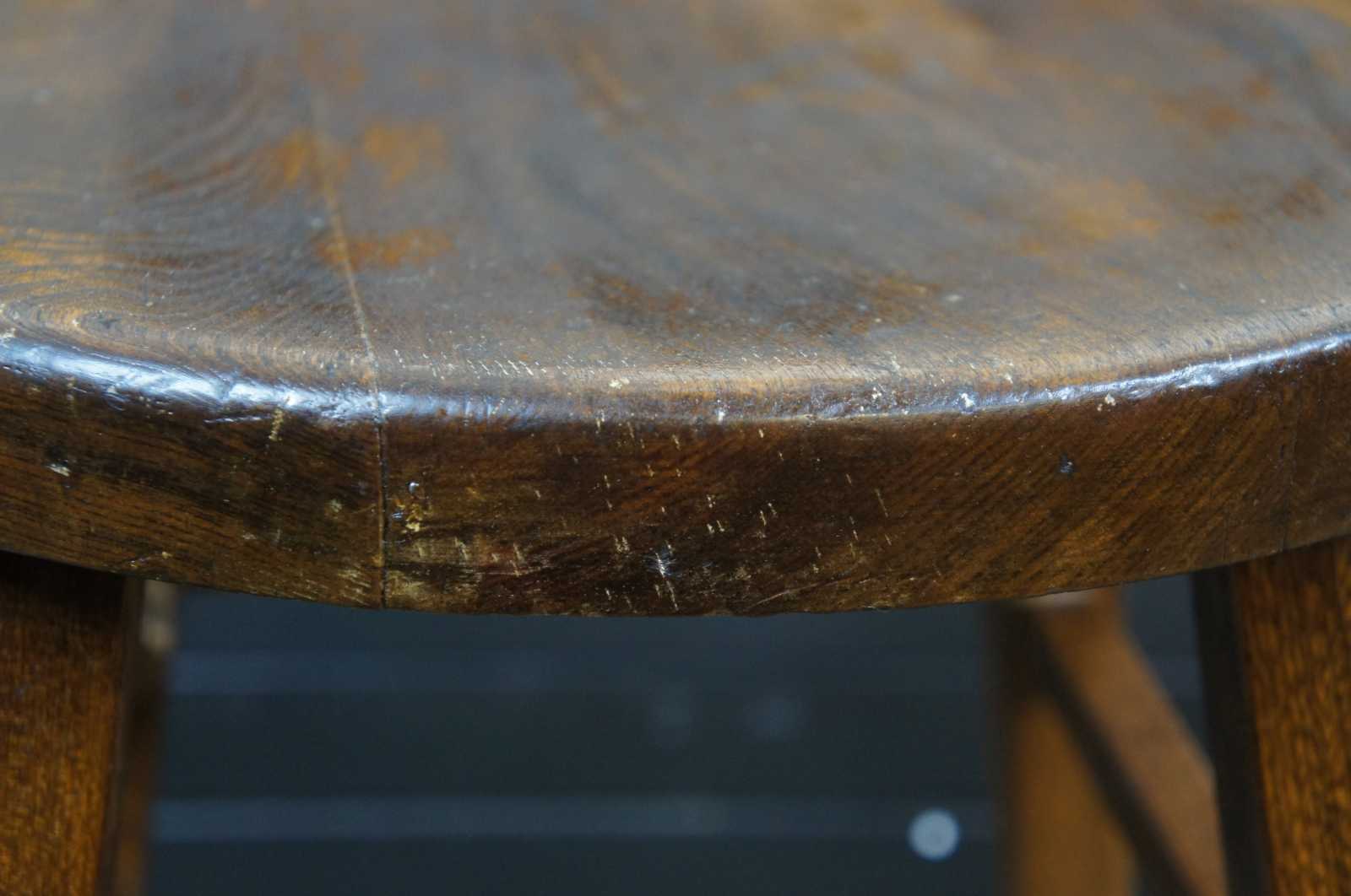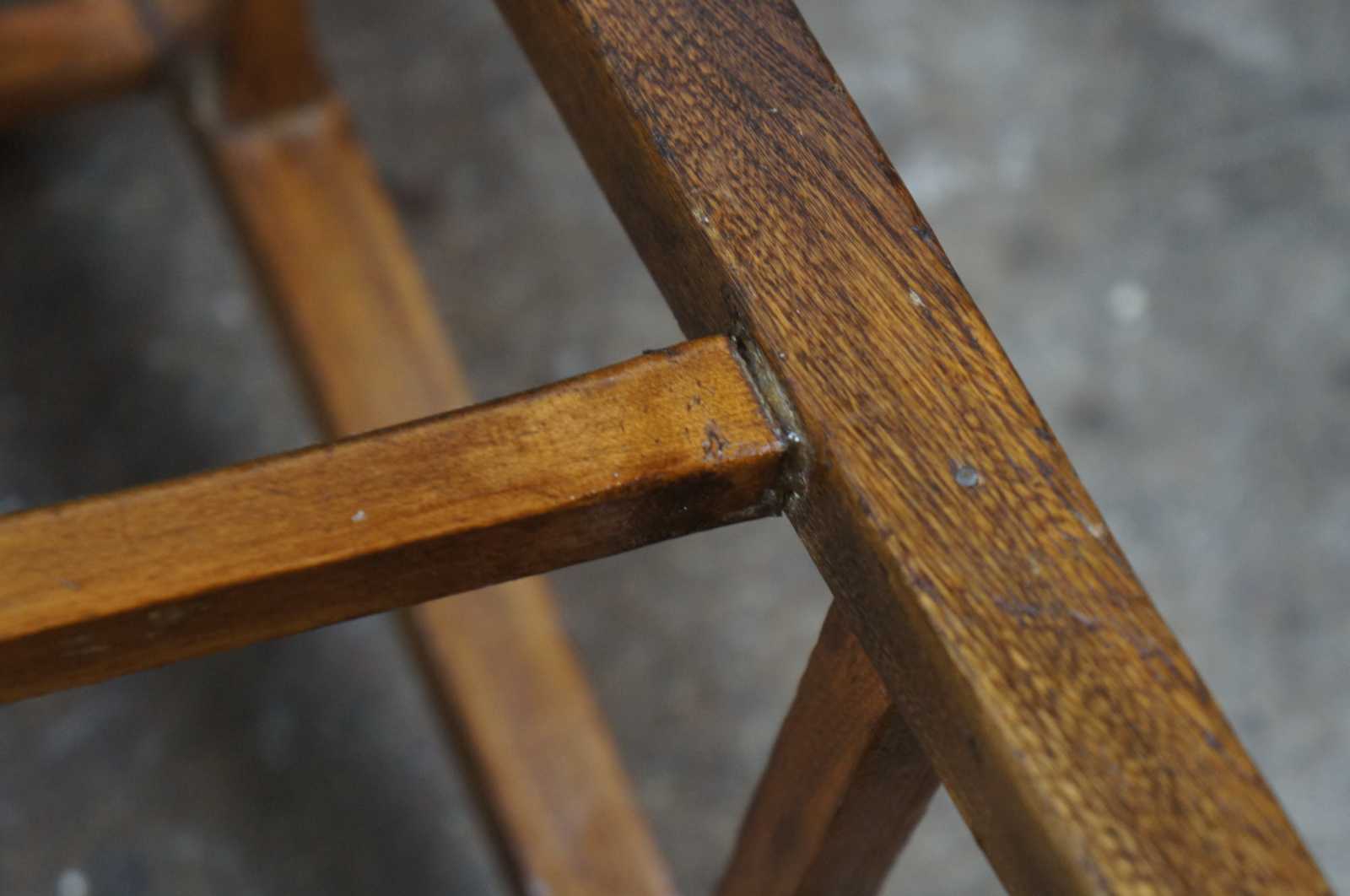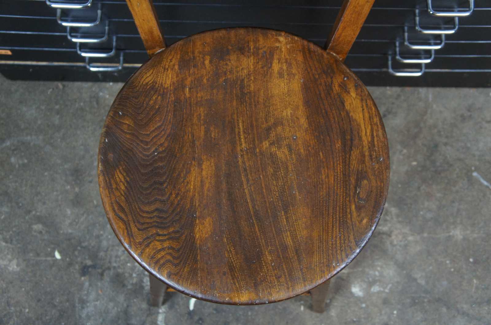 Antique country style oak counter or bar stool. Marked Rec Ins along the back of seat.