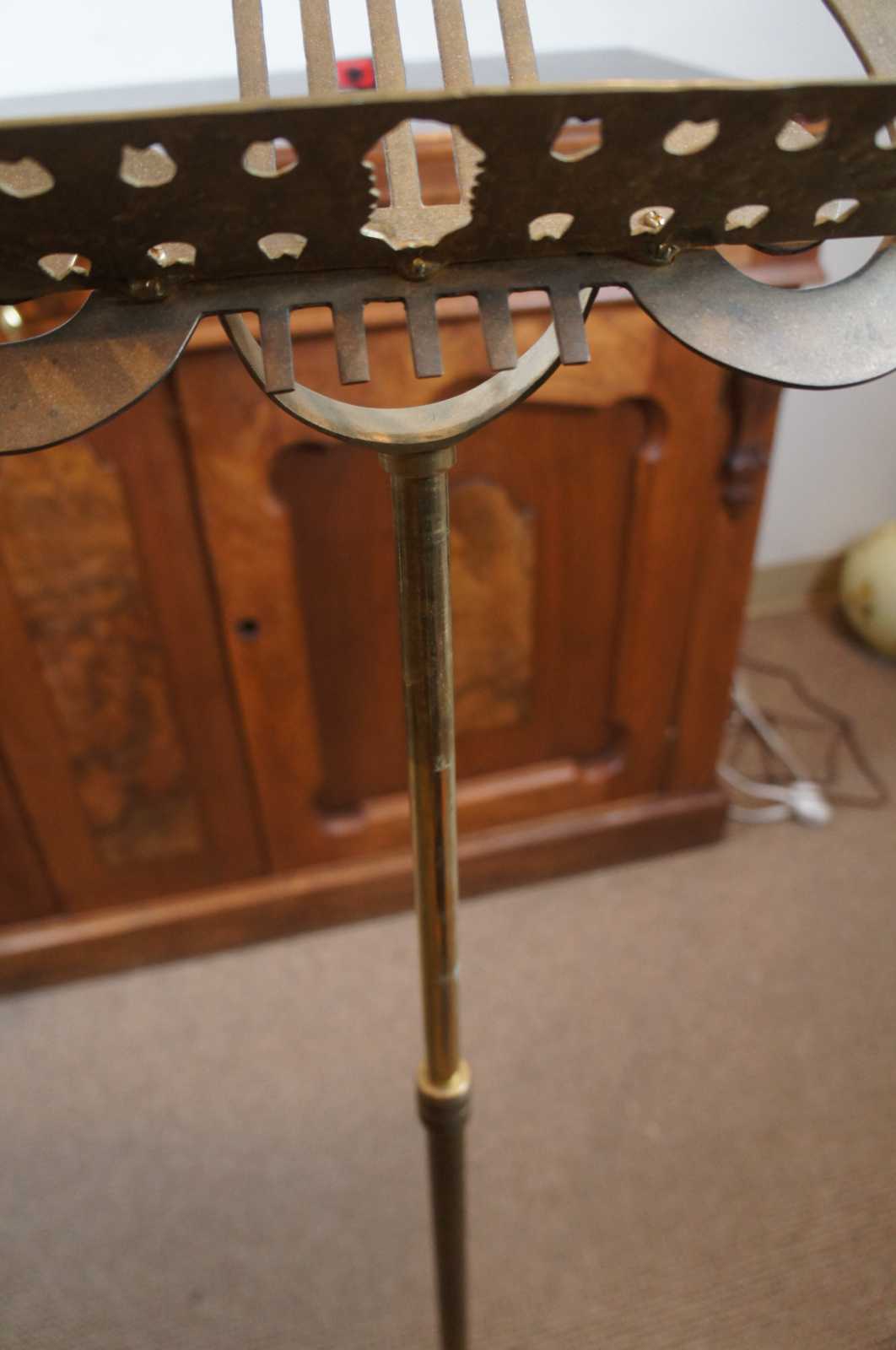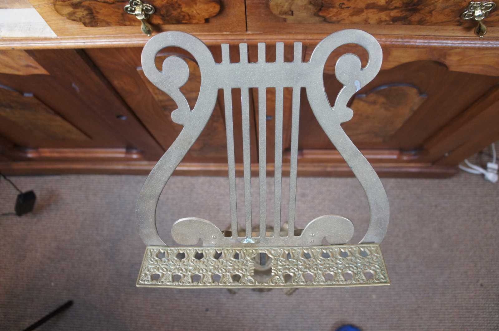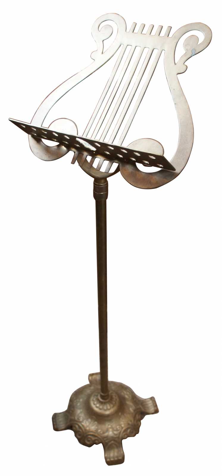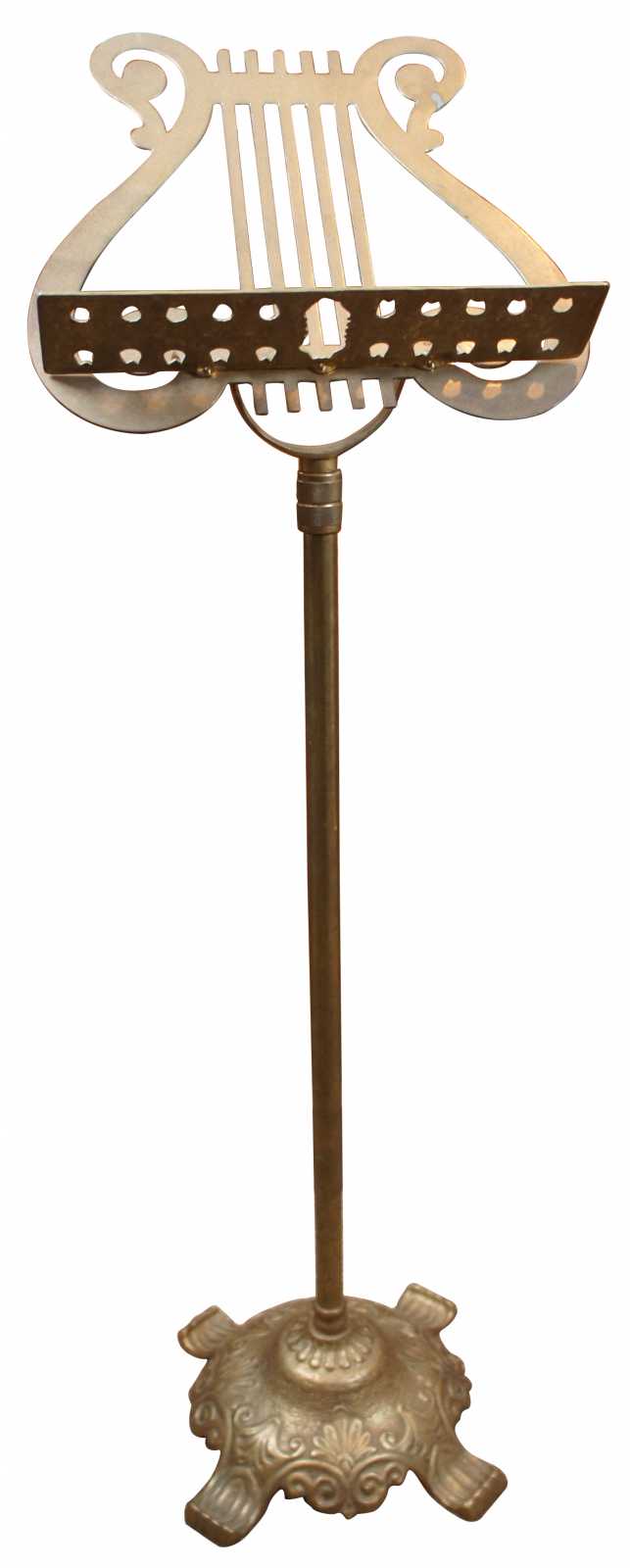 Vintage adjustable brass music sheet holder stand. Features ornate details, with harp / lyre / serpentine design.