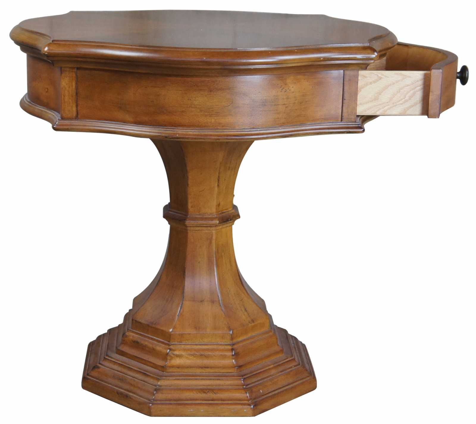 Late 20th century serpentine side table. Made from birch with a two tone matchbook veneered top over octagonal base. Includes a drawer central drawer with oak construction.