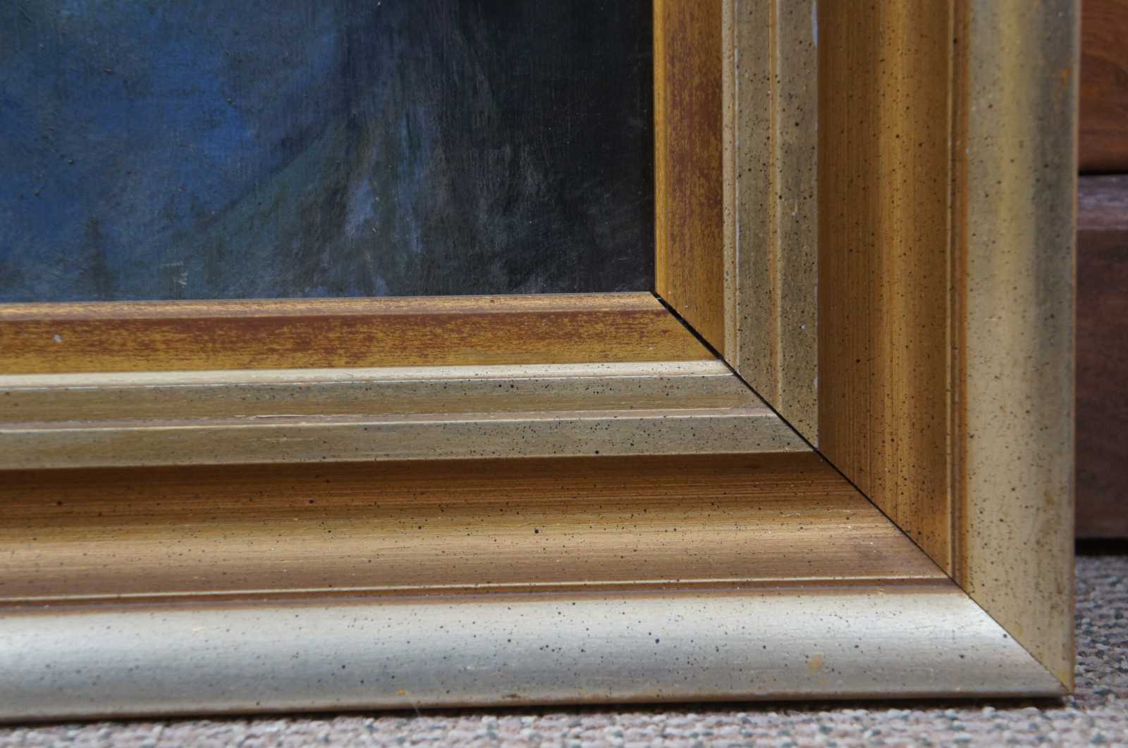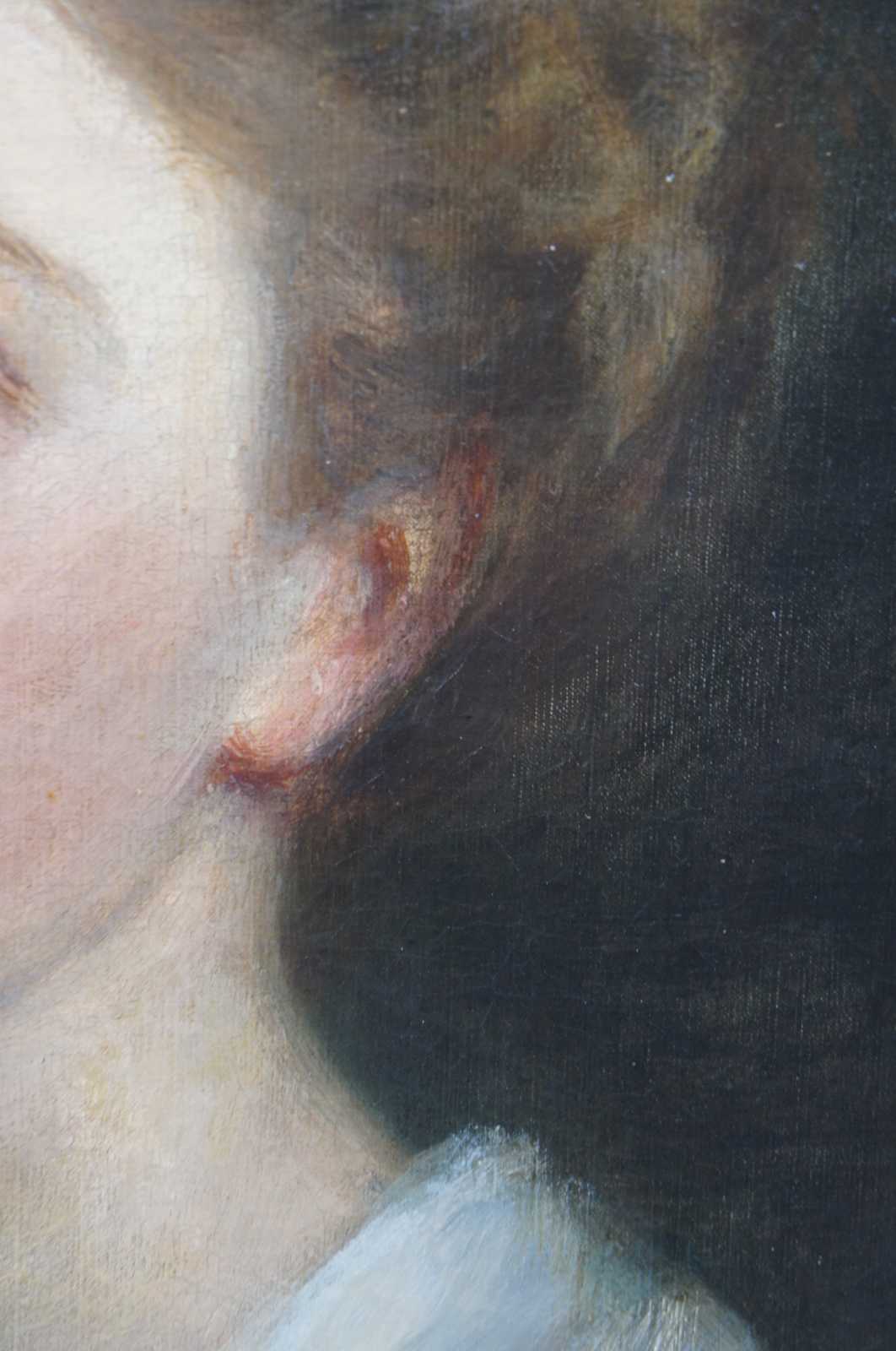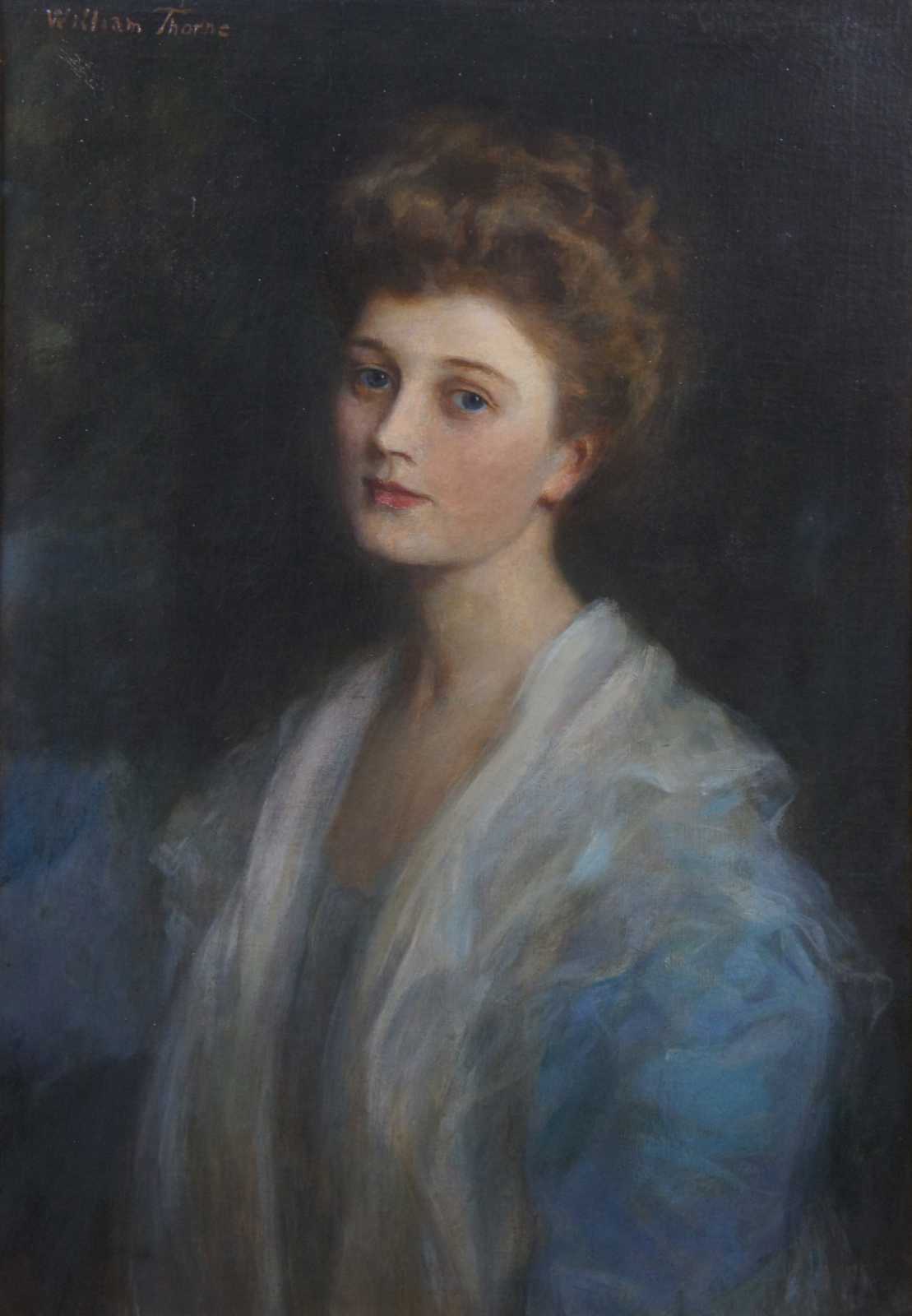 Antique signed oil on canvas portrait of a woman in white and blue by William Thorne, 1907. A painter, William Thorne (1864-1956), was born and died in Delavan, Wisconsin where he became known towards the end of his career as the Dean of Wisconsin portrait painters. However he spent much of his early life away from his home state. In the mid 1880s, he enrolled in evening classes at the School of the Art Institute of Chicago, and in 1887 and 1888, he attended the antique class of the National Academy of Design in New York City.