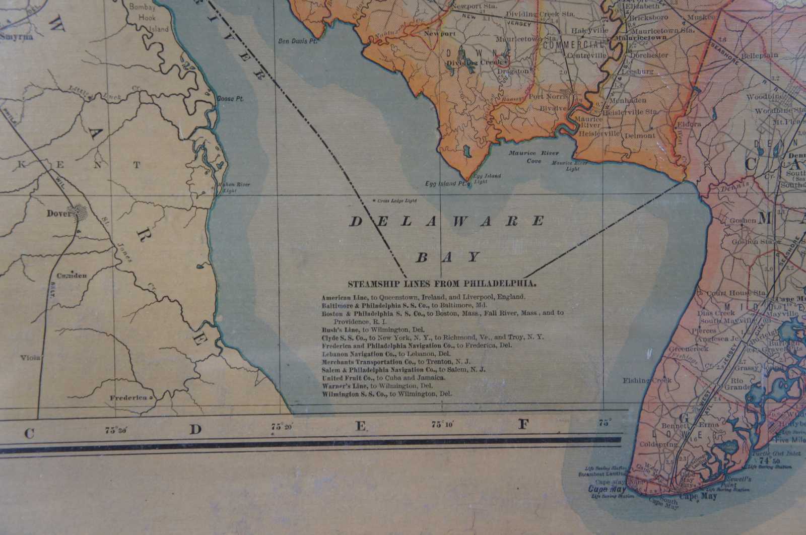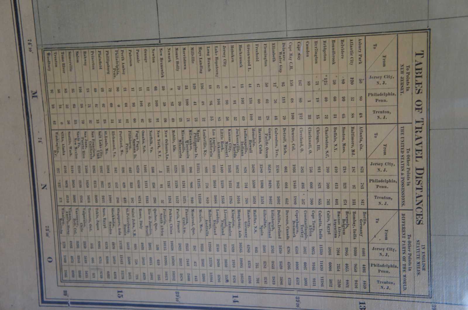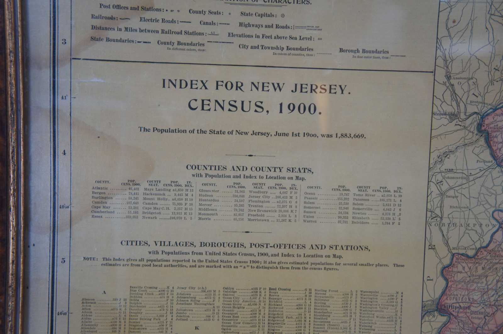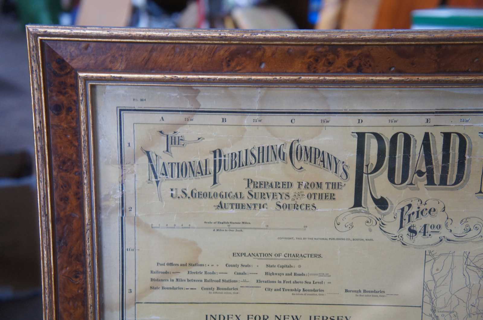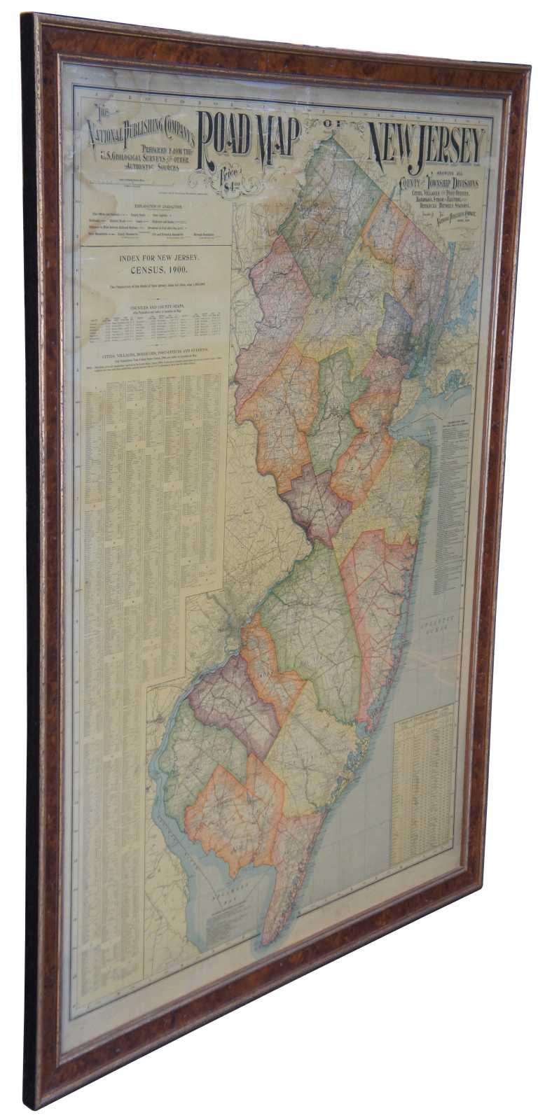 1903 Antique New Jersey Road Map by The National Publishing Company of Boston Massachusettes, No 384. Index for New Jersey Census 1900, Population 1,883,669. Framed in burl wood with gold accent.
