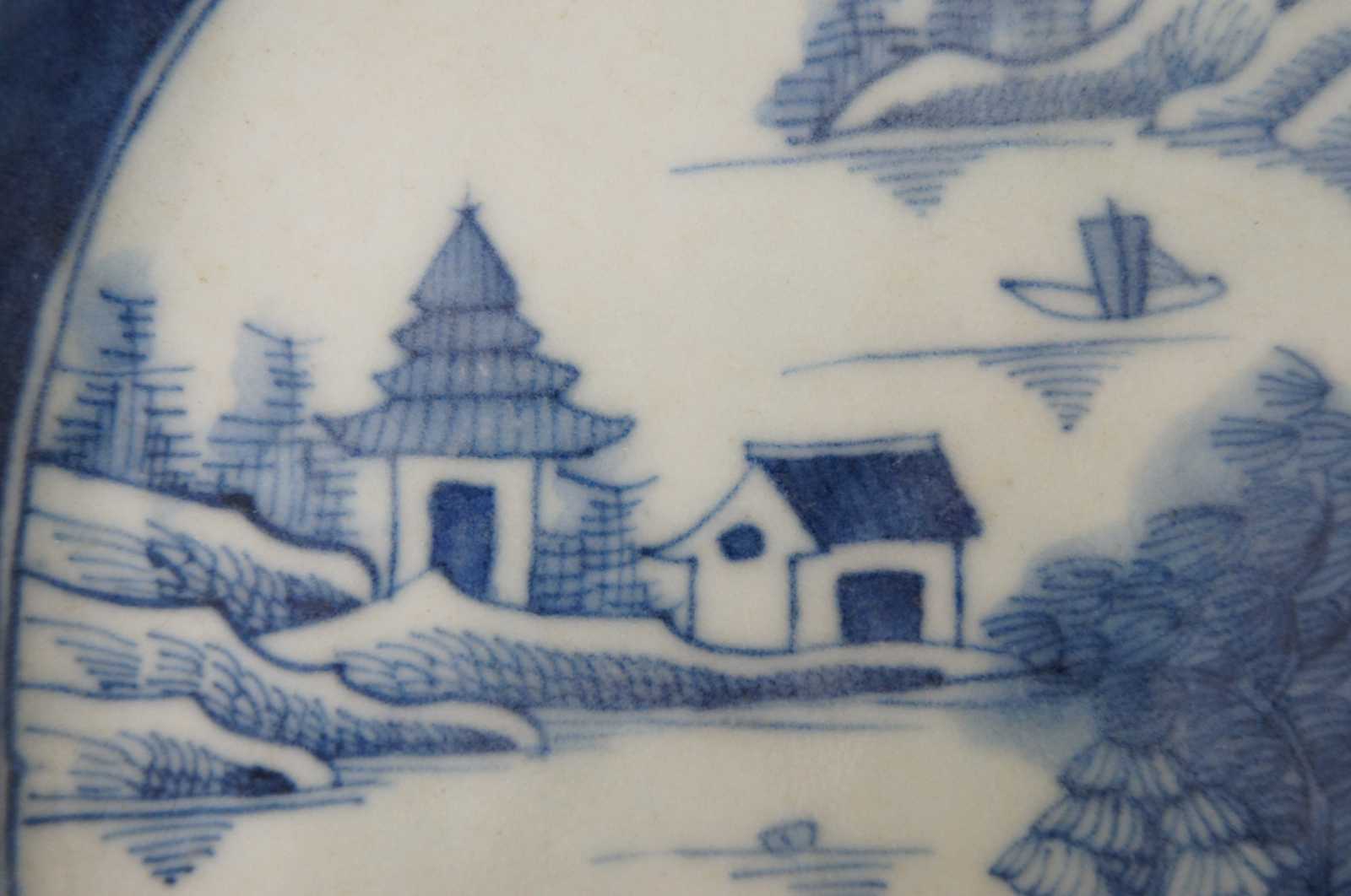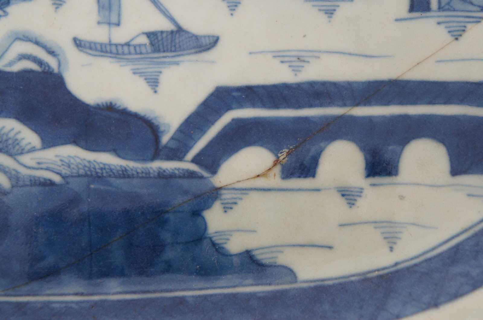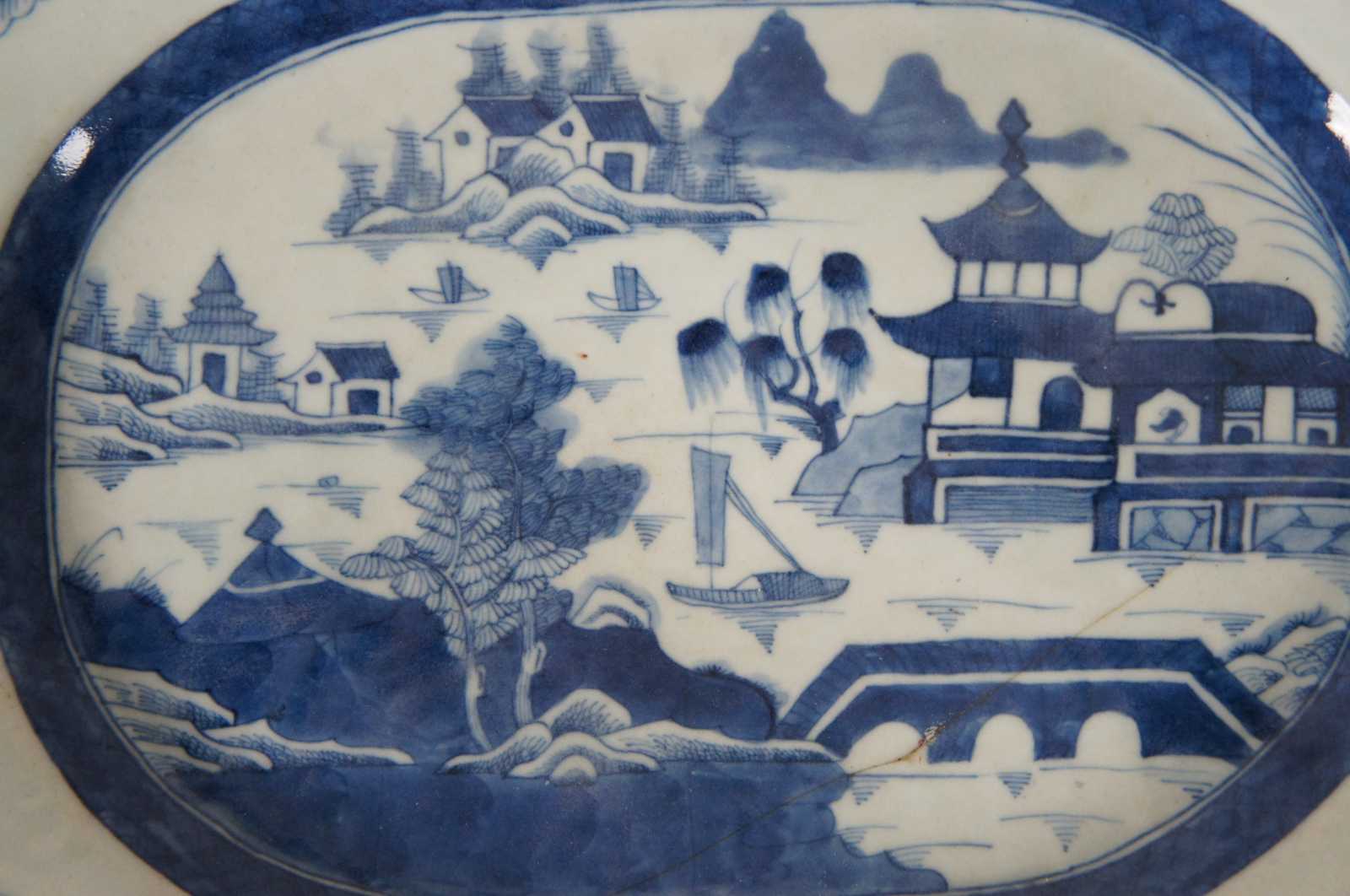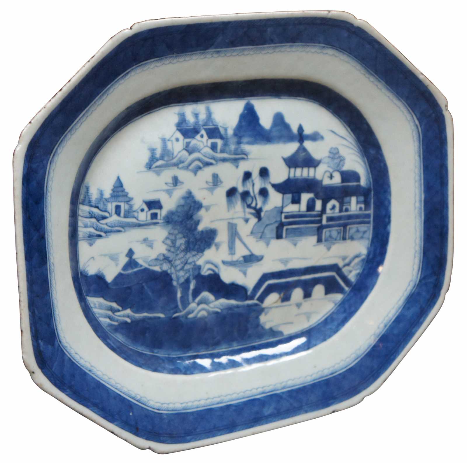 Small 19th century Canton Chinese export platter in blue and white painted porcelain. “Canton and Nanking are both patterns of dishes made in China from the late 1700s to the early 1900s. Both are named for cities in China where the dishes were thought to have been made, but we now know that Nanking was the port used to ship the dishes. Both patterns are blue and white and both have a scene with a landscape, building, bridge and trees. Nanking has a “spear and post” border and often has some gold trim. Canton has a “rain and cloud” border. There is sometimes a person on the bridge on a Nanking plate, but never on a Canton plate. Nanking is a better-quality product with crisp decorations and extra gold trim. Both Canton and Nanking dishes were made for the American market and after 1891 were marked “China” or “Made in China.”