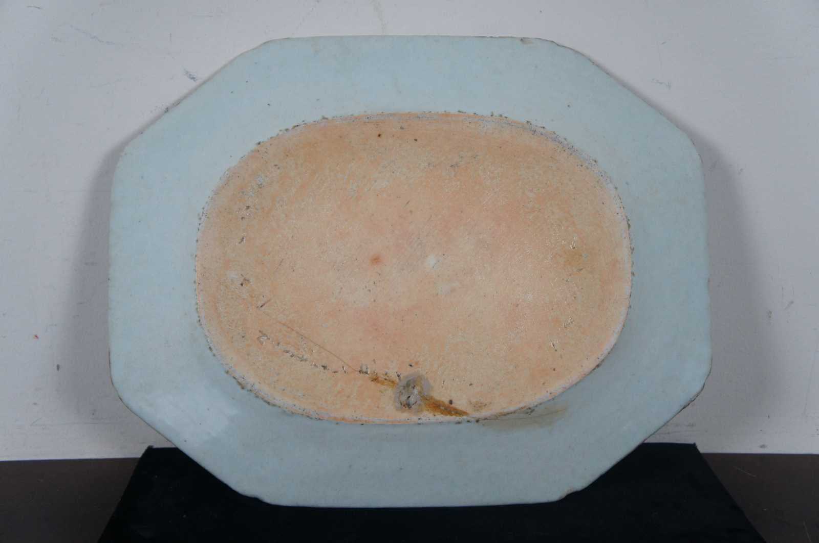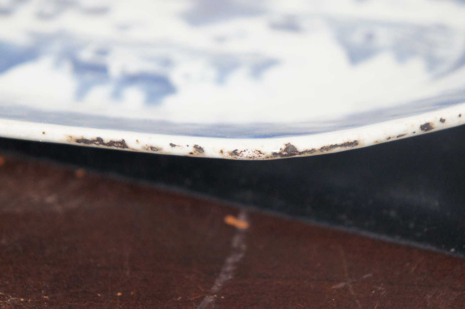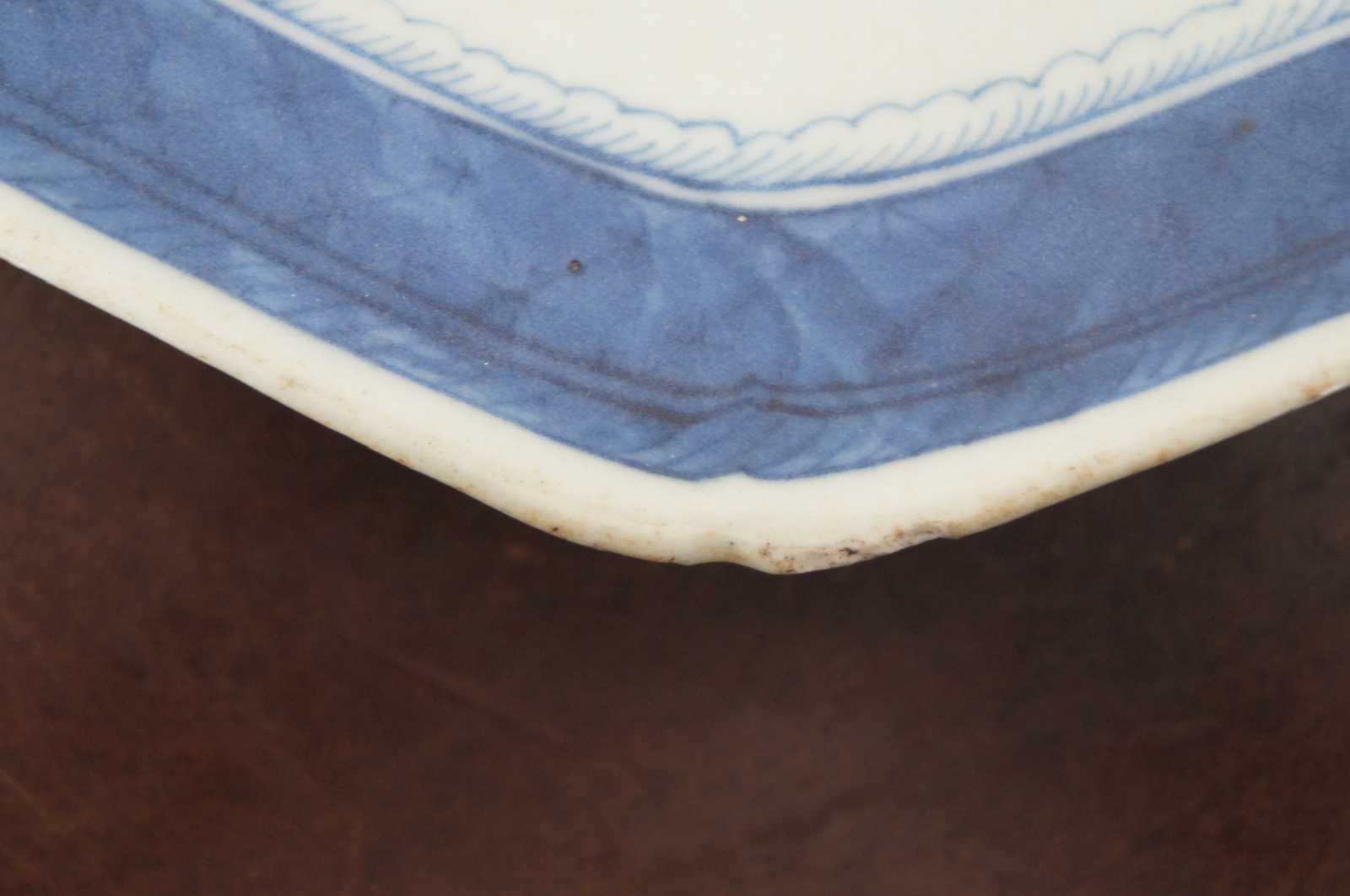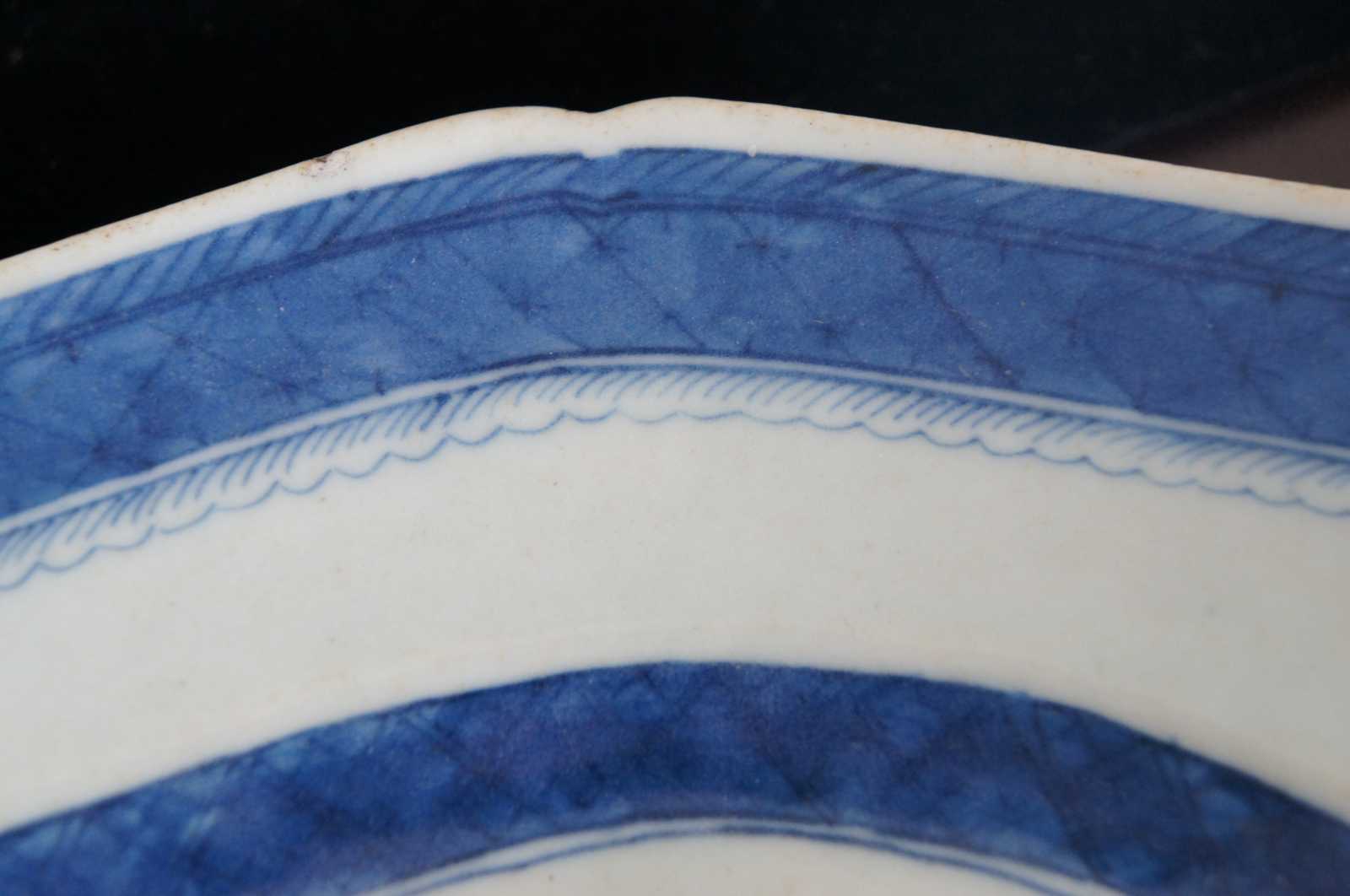 Small 19th century Canton Chinese export platter in blue and white painted porcelain. “Canton and Nanking are both patterns of dishes made in China from the late 1700s to the early 1900s. Both are named for cities in China where the dishes were thought to have been made, but we now know that Nanking was the port used to ship the dishes. Both patterns are blue and white and both have a scene with a landscape, building, bridge and trees. Nanking has a “spear and post” border and often has some gold trim. Canton has a “rain and cloud” border. There is sometimes a person on the bridge on a Nanking plate, but never on a Canton plate. Nanking is a better-quality product with crisp decorations and extra gold trim. Both Canton and Nanking dishes were made for the American market and after 1891 were marked “China” or “Made in China.”