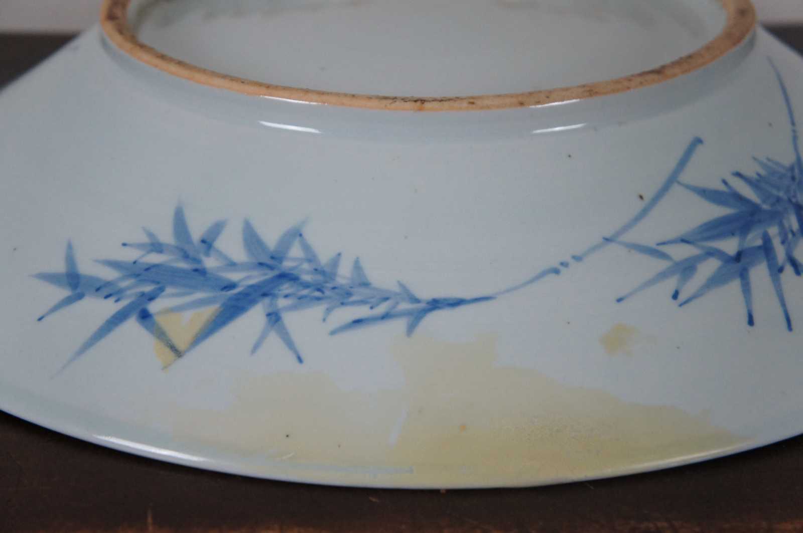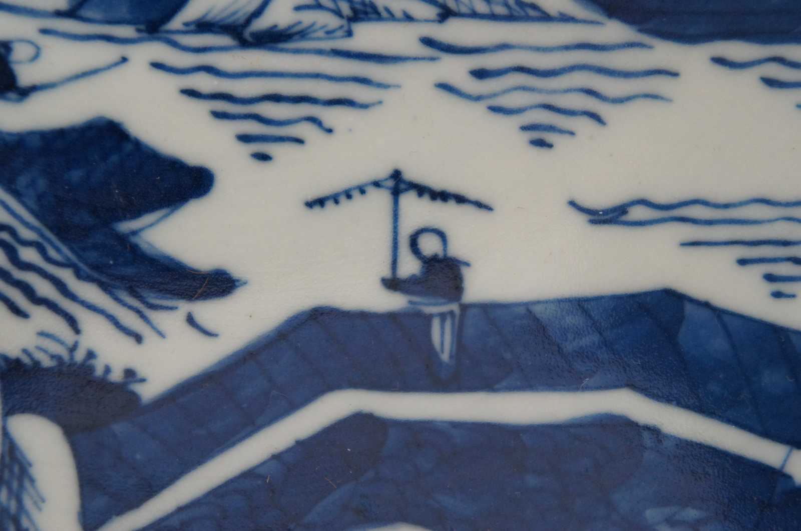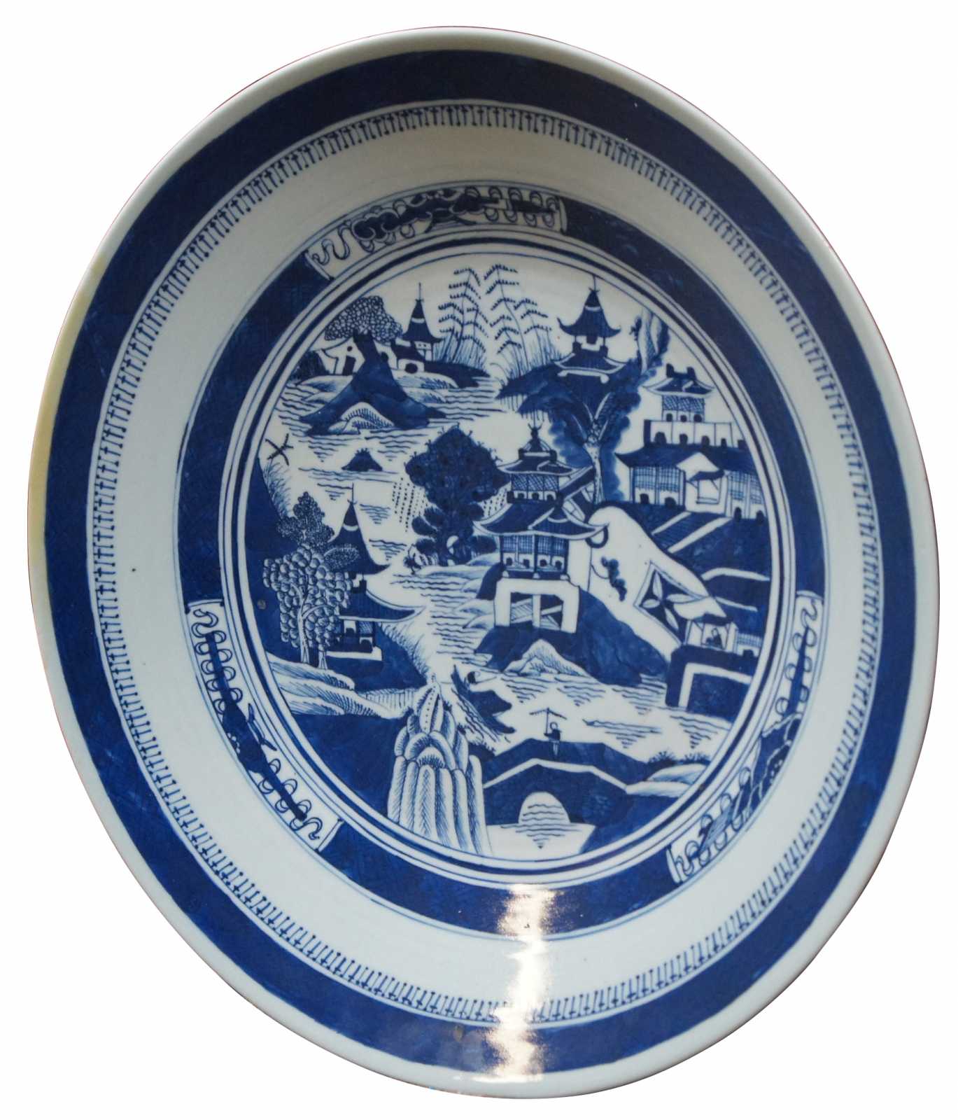 “Canton and Nanking are both patterns of dishes made in China from the late 1700s to the early 1900s. Both are named for cities in China where the dishes were thought to have been made, but we now know that Nanking was the port used to ship the dishes. Both patterns are blue and white and both have a scene with a landscape, building, bridge and trees. Nanking has a “spear and post” border and often has some gold trim. Canton has a “rain and cloud” border. There is sometimes a person on the bridge on a Nanking plate, but never on a Canton plate. Nanking is a better-quality product with crisp decorations and extra gold trim. Both Canton and Nanking dishes were made for the American market and after 1891 were marked “China” or “Made in China.”