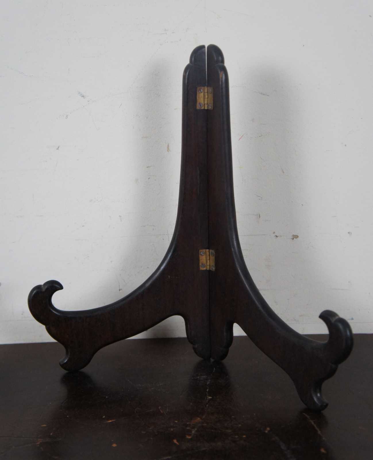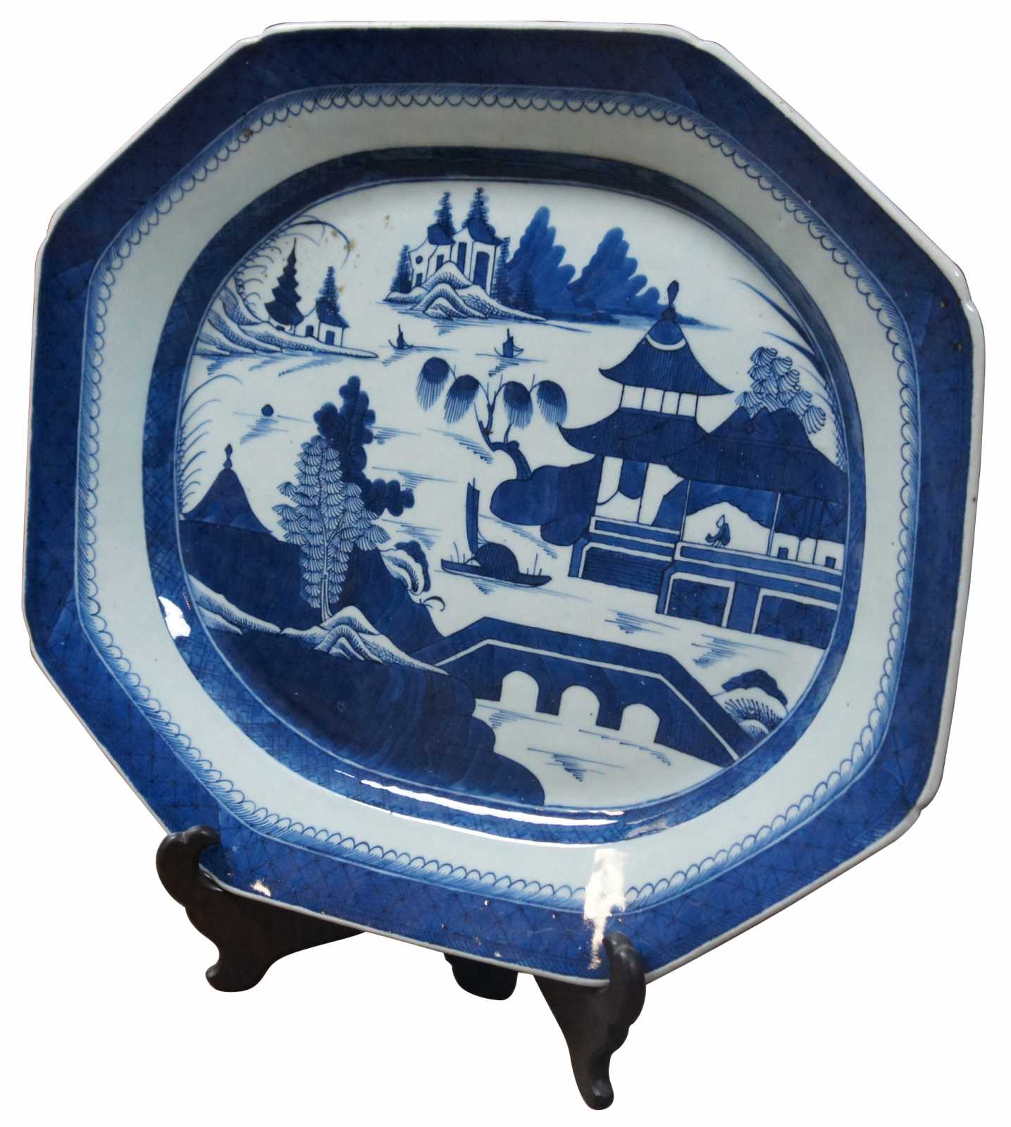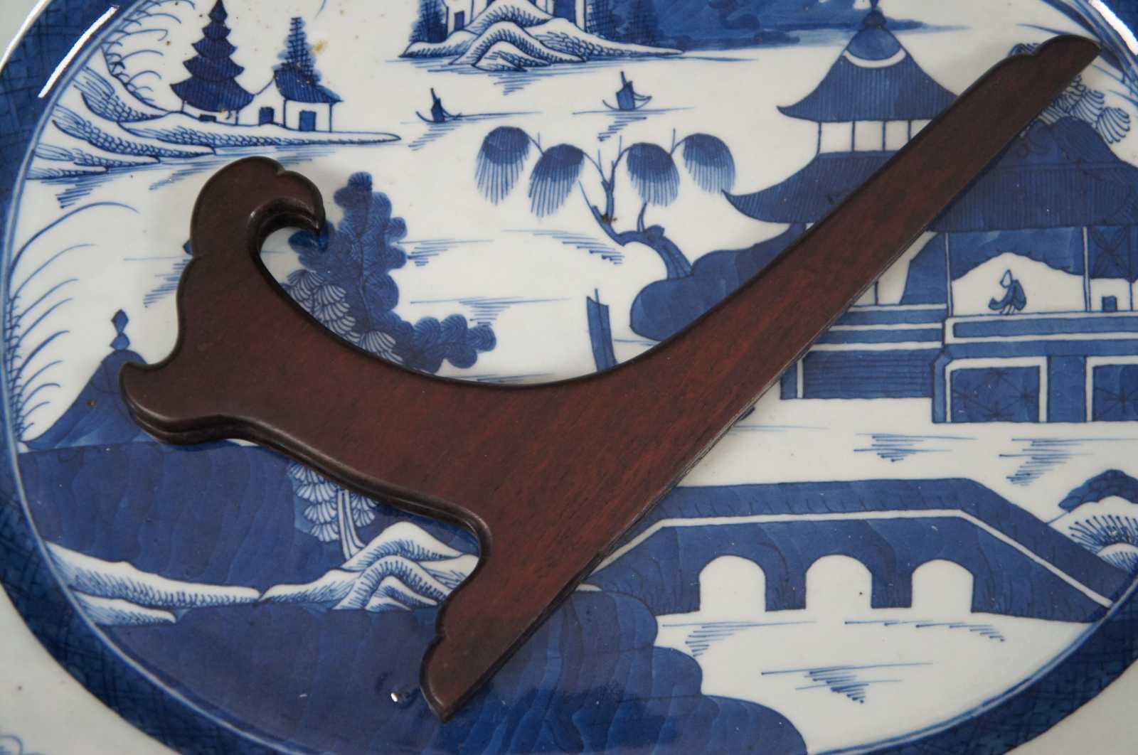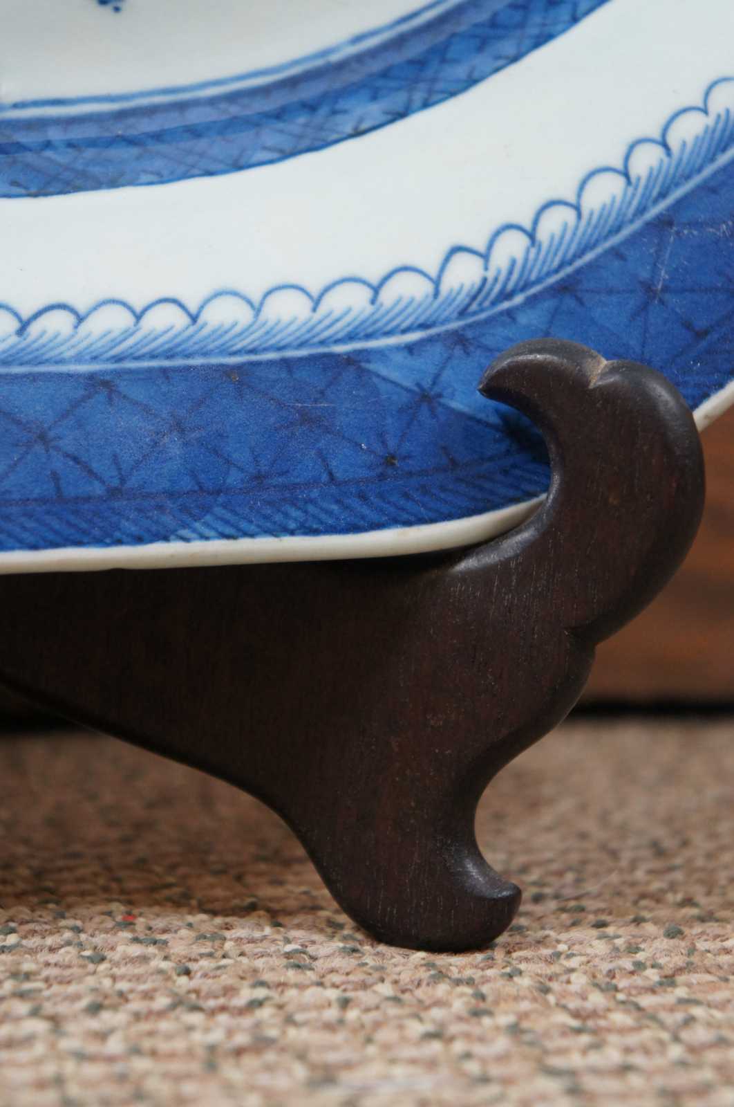 Large 19th century Canton Chinese export platter in blue and white painted porcelain; includes folding wood display stand. “Canton and Nanking are both patterns of dishes made in China from the late 1700s to the early 1900s. Both are named for cities in China where the dishes were thought to have been made, but we now know that Nanking was the port used to ship the dishes. Both patterns are blue and white and both have a scene with a landscape, building, bridge and trees. Nanking has a “spear and post” border and often has some gold trim. Canton has a “rain and cloud” border. There is sometimes a person on the bridge on a Nanking plate, but never on a Canton plate. Nanking is a better-quality product with crisp decorations and extra gold trim. Both Canton and Nanking dishes were made for the American market and after 1891 were marked “China” or “Made in China.”