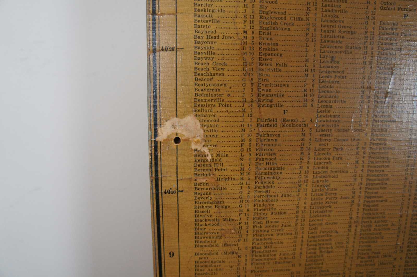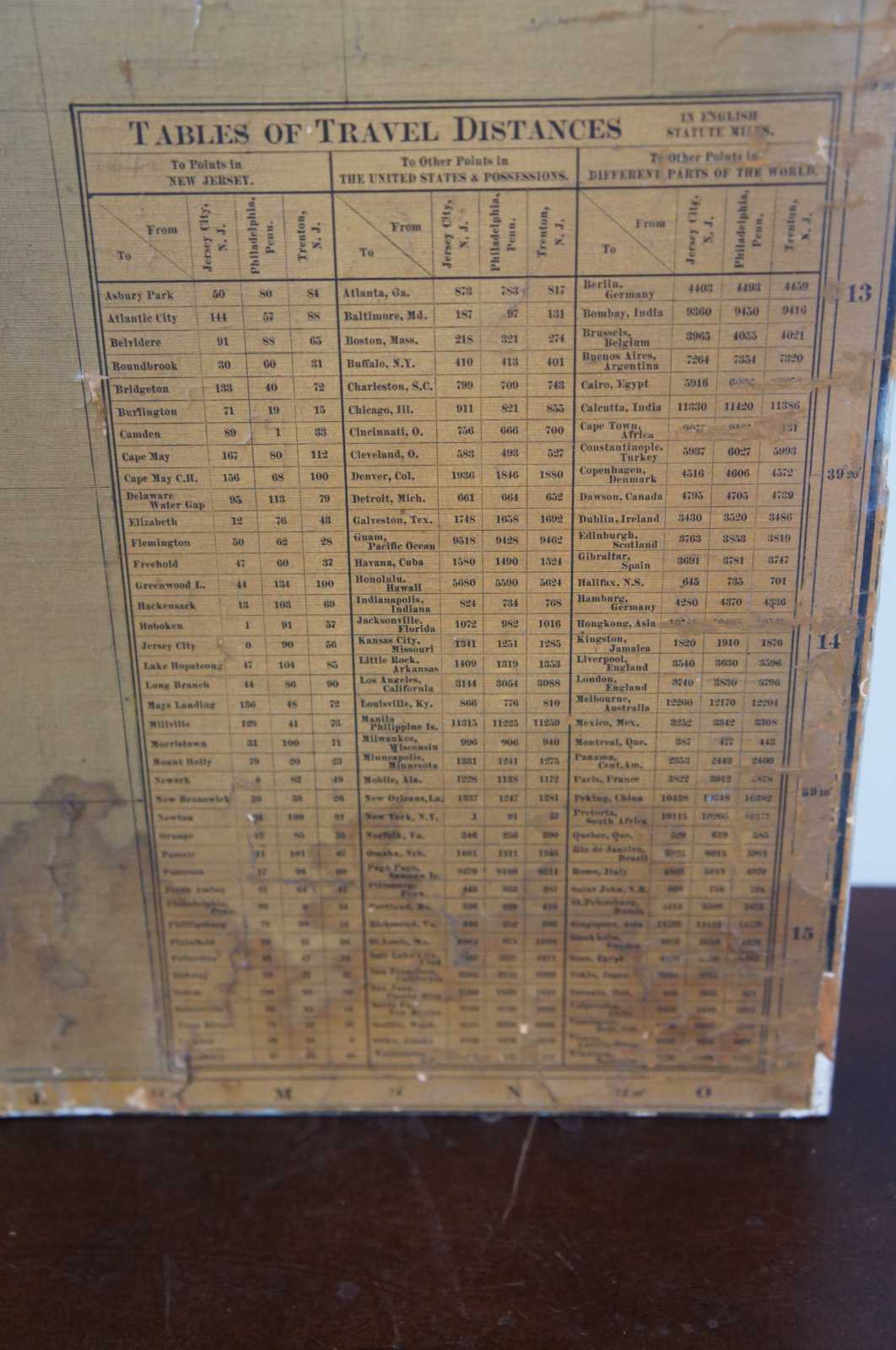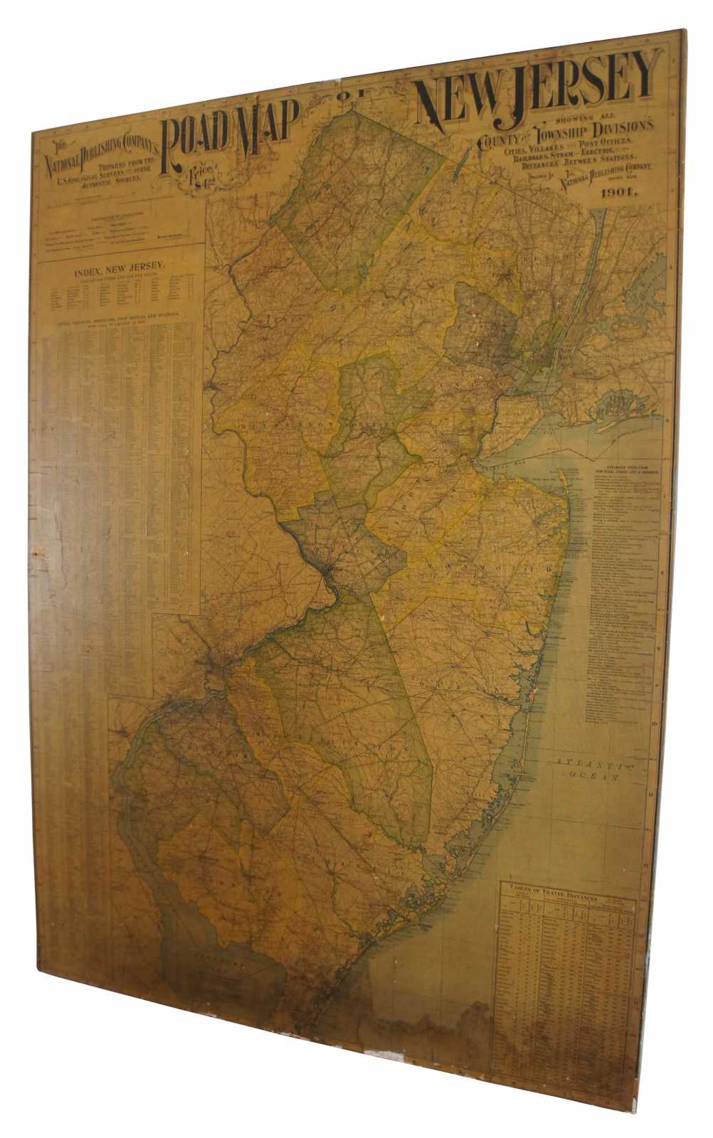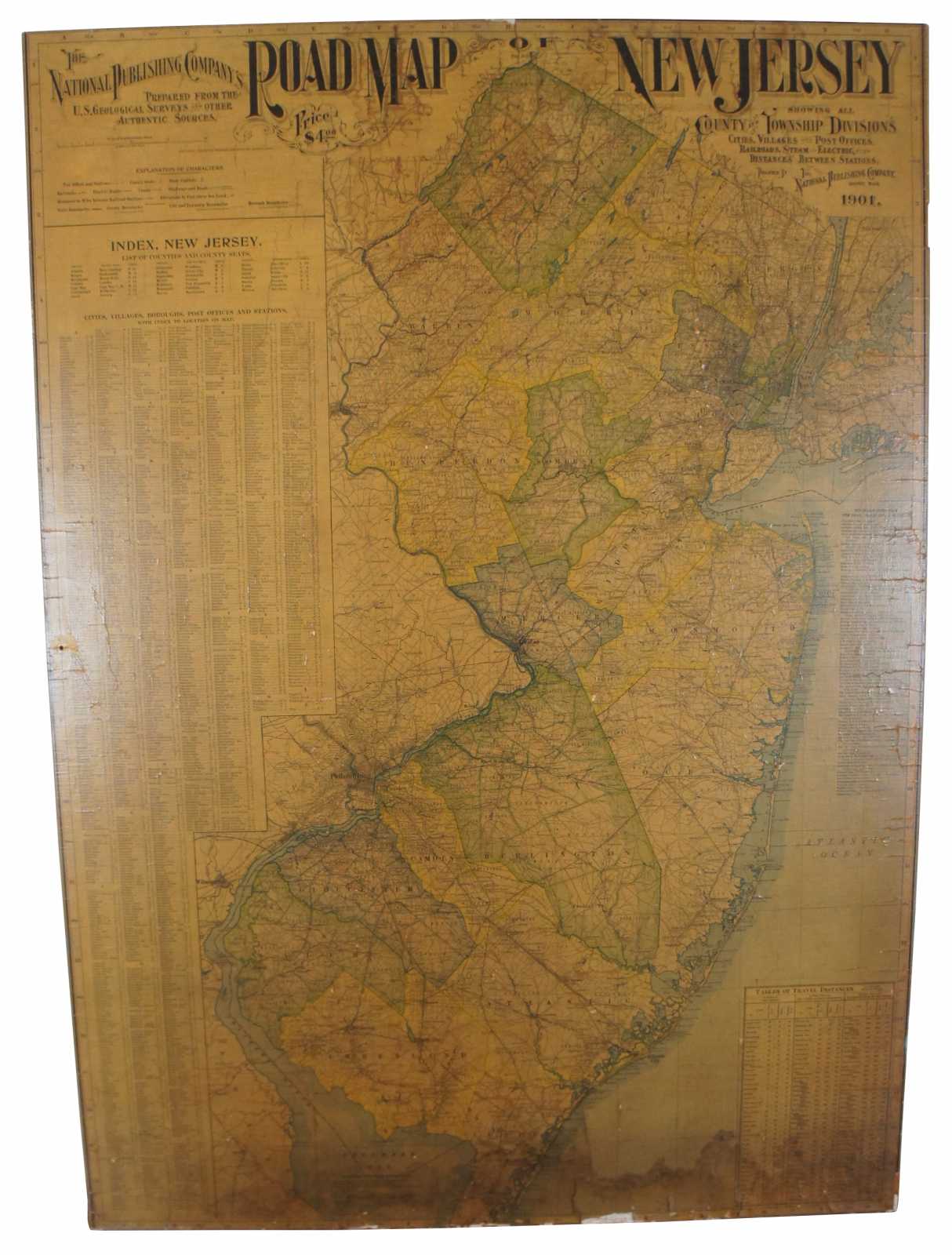 The National Publishing Company's road map of New Jersey, showing all county and township divisions, cities villages and post-offices, railroads, steam and electric, with distances between stations. 4 miles to 1 inch. This map has been mounted to board with old hinge marks seen along the right edge. Believed to have been used in a School type of setting.