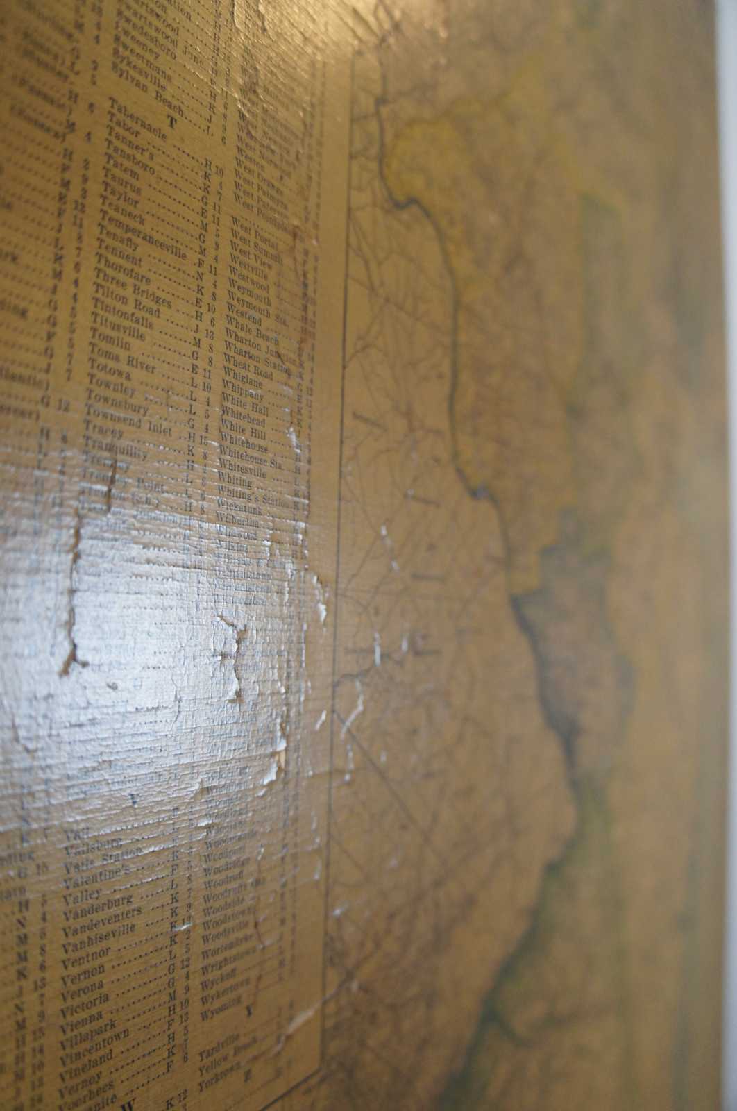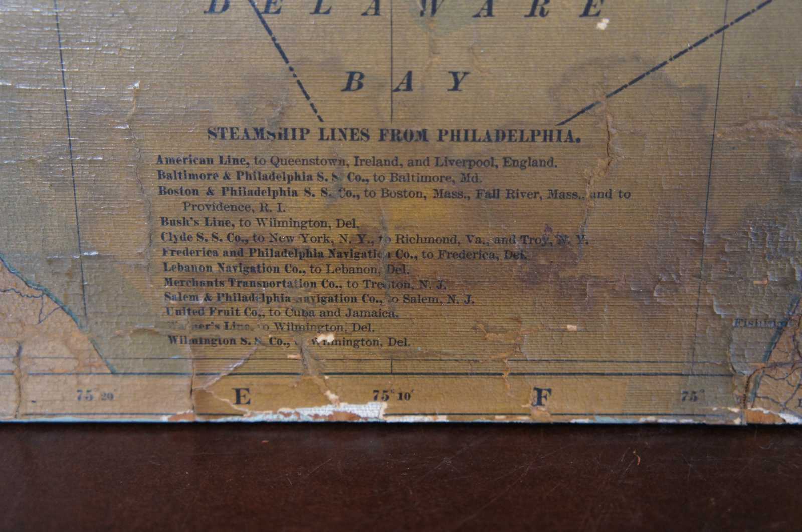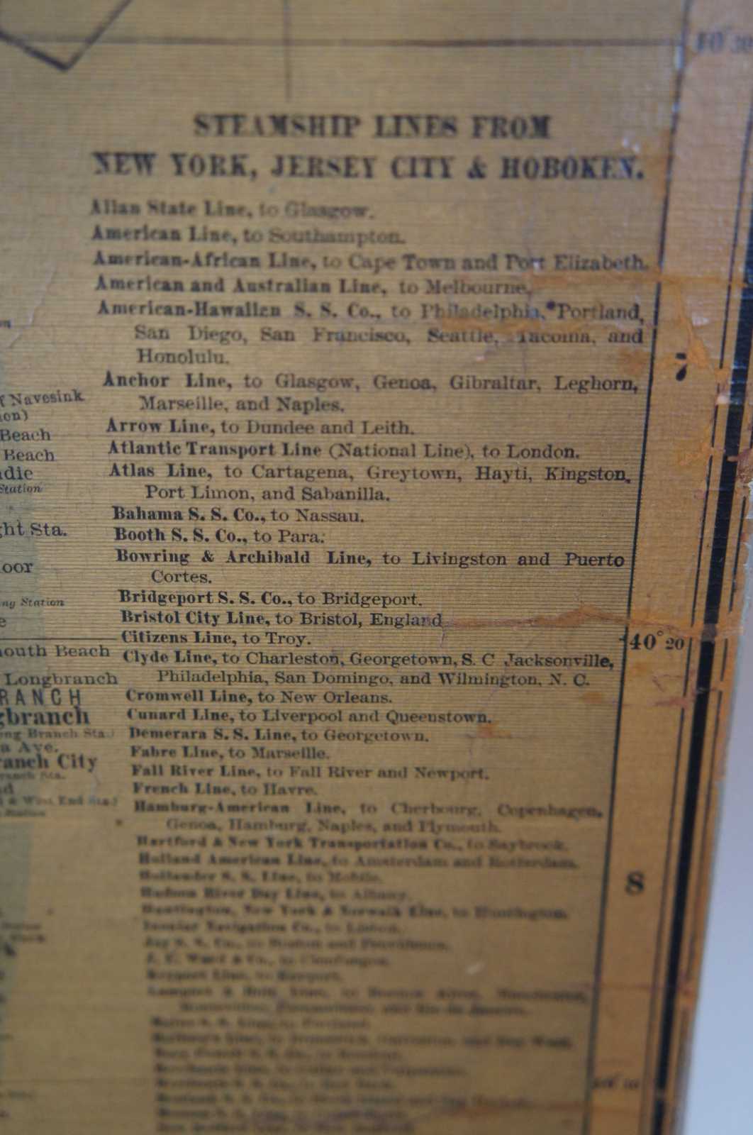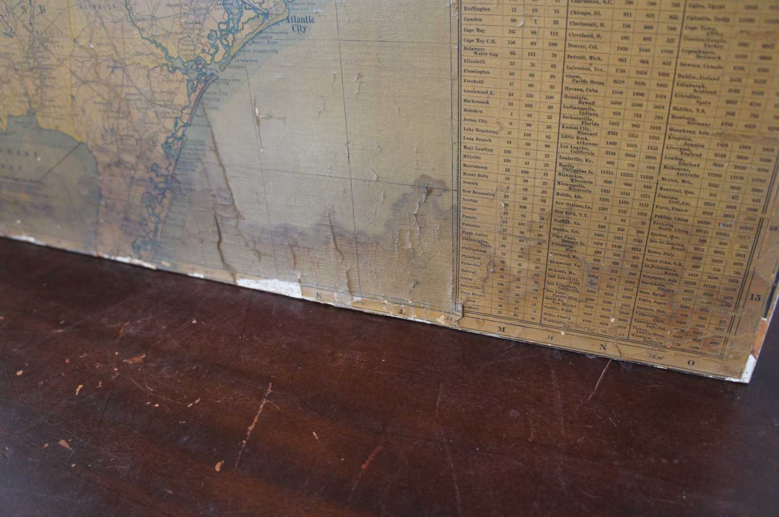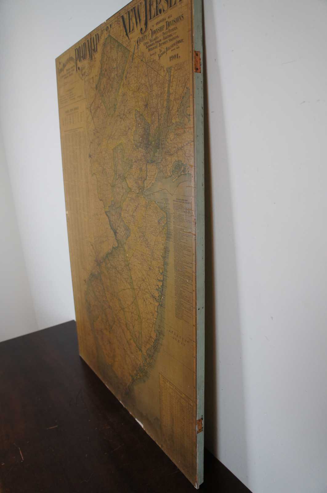 The National Publishing Company's road map of New Jersey, showing all county and township divisions, cities villages and post-offices, railroads, steam and electric, with distances between stations. 4 miles to 1 inch. This map has been mounted to board with old hinge marks seen along the right edge. Believed to have been used in a School type of setting.