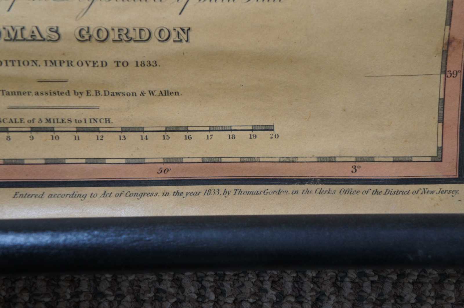 Antique wall hanging scroll map of the State of New Jersey with adjoining states compiled by Thomas Gordon, second edition, improved to 1833, engraved by H.S. Tanner, assisted by E.B. Dawson and W. Allen. Thomas Gordon (1778-1848) was a Trenton based judge, lawyer, surveyor and cartographer. Gordon was born in Amwell New Jersey and relocated as a young man to the larger city of Trenton. He studied law and mathematics and subsequently set up practices in both law and surveying. He is best known in cartographic circles for his production of this impressive wall map of New Jersey – the first government sponsored map of that state. Gordon died and was buried in Trenton, NJ. Thomas Gordon's official map of New Jersey is the first large format map of New Jersey printed in the US. In 1822, the New Jersey state legislature commissioned Thomas Gordon to compile and published an official state map. Six years later, in 1828, Gordon published this remarkable large wall map of the state, which was engraved by Henry S. Tanner, E.B. Dawson and W. Allen.