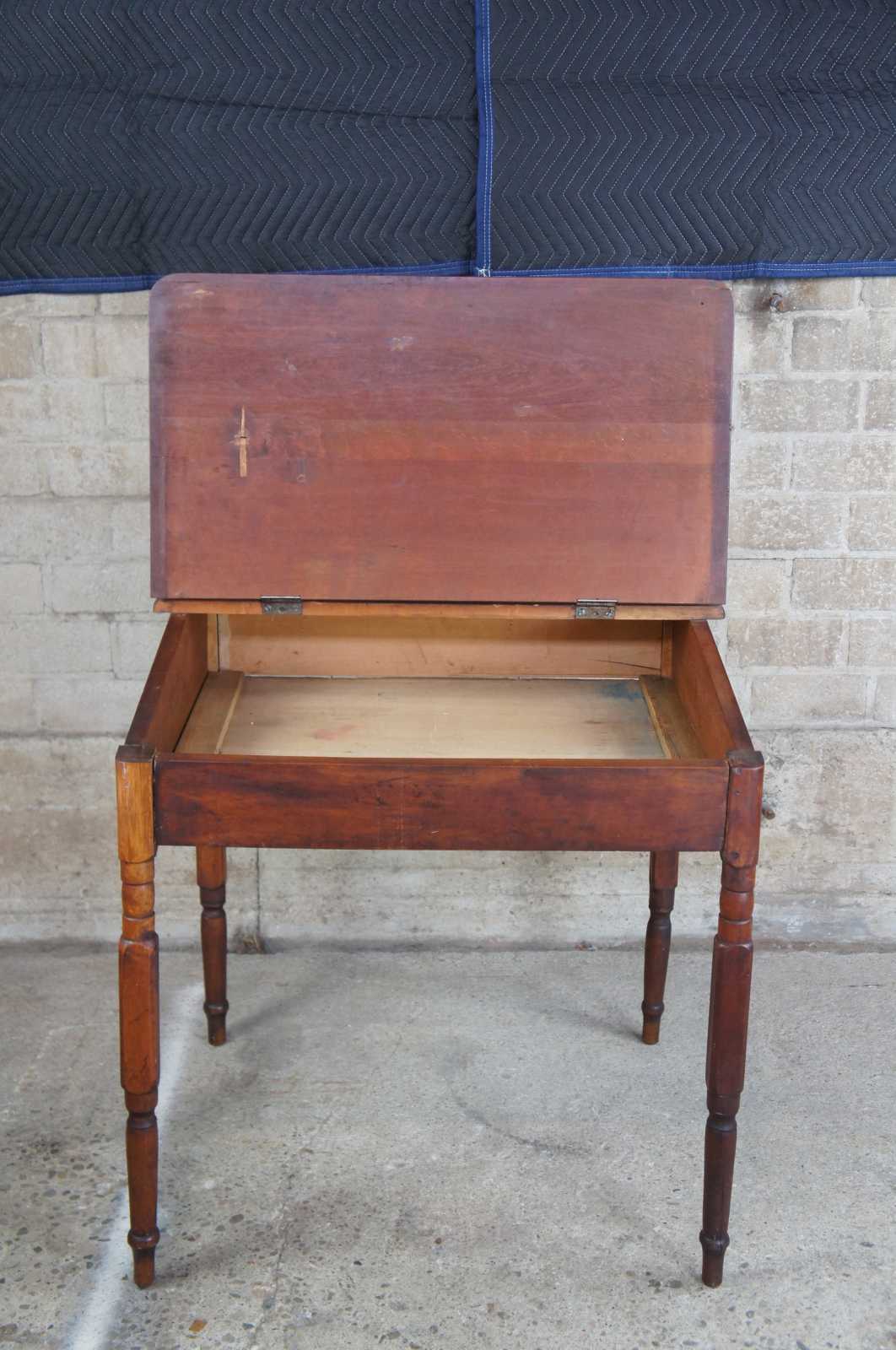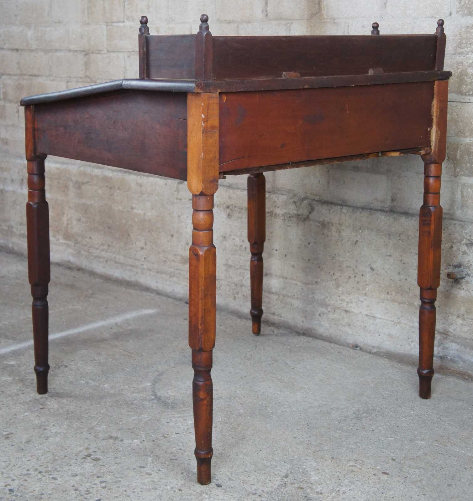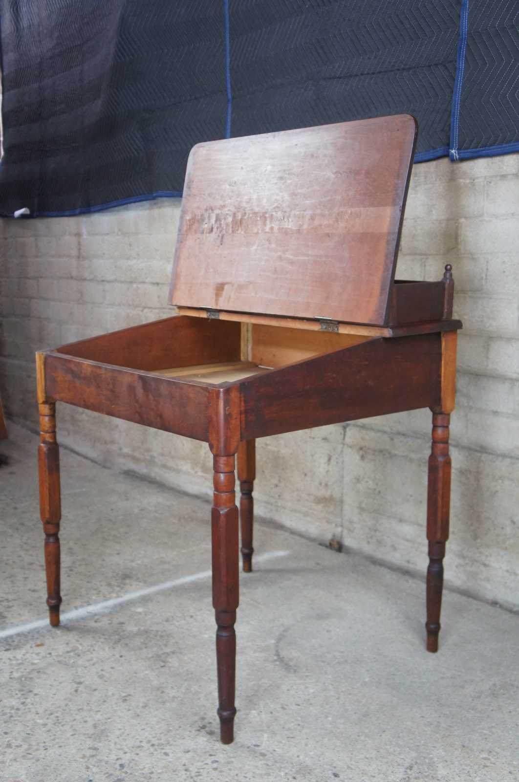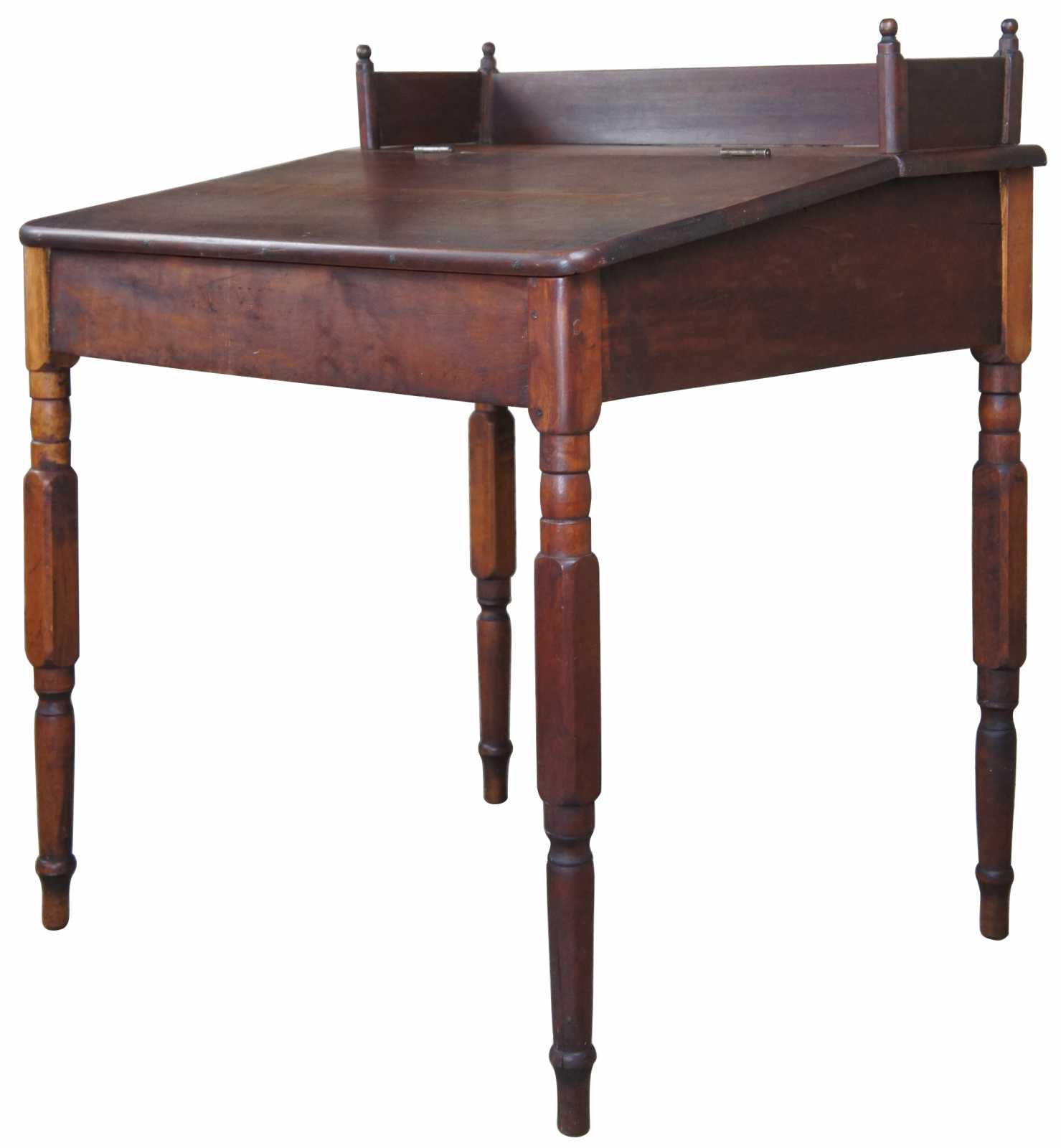 A charming 19th century slant top writing desk. Made from cherry with turned legs leading to peg feet. Features a backsplash with turned finials and large storage area underneath top.