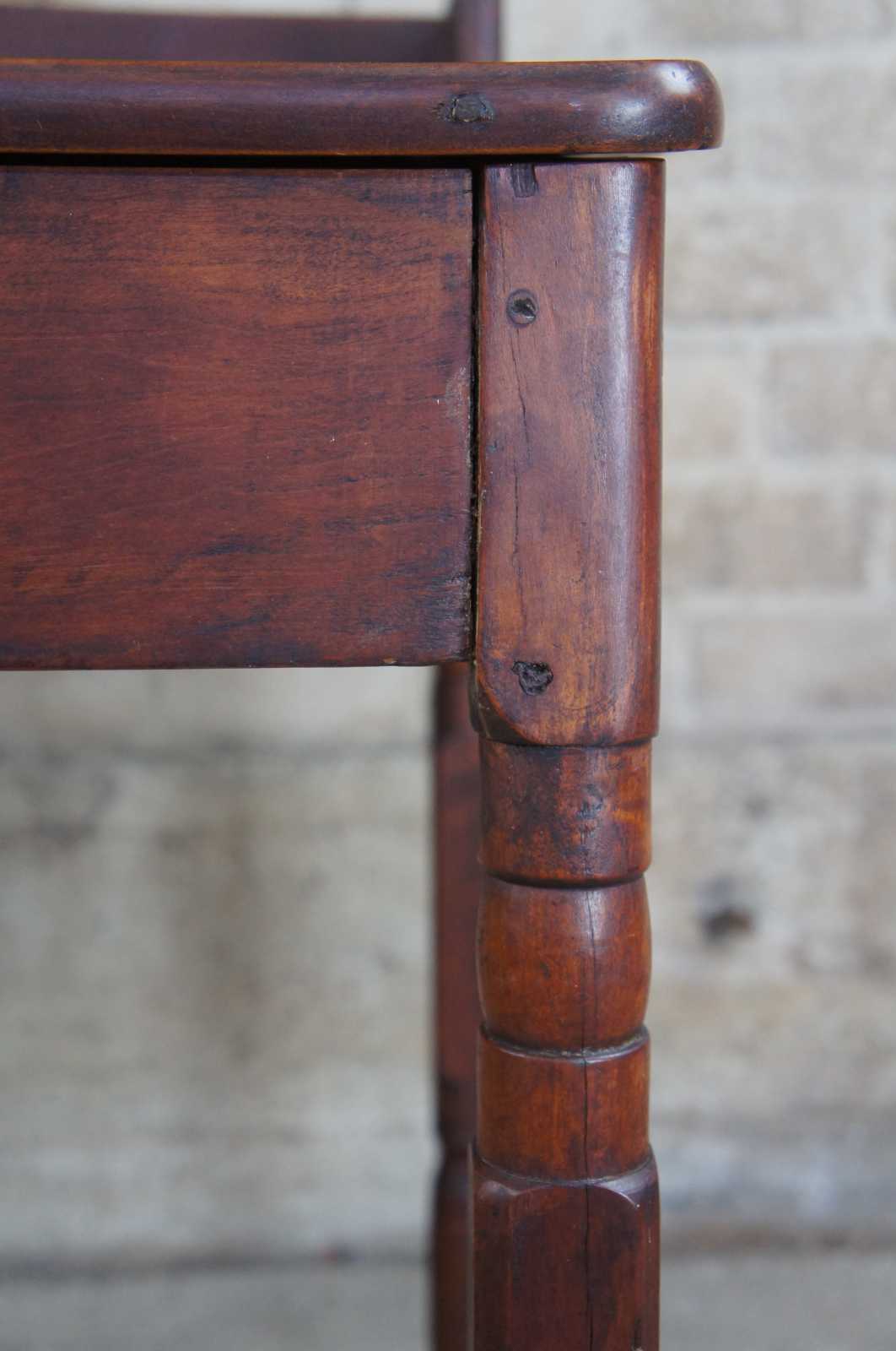 Good antique condition, wear commensurate with age and use, missing trim along back, hairline on leg, see pictures.