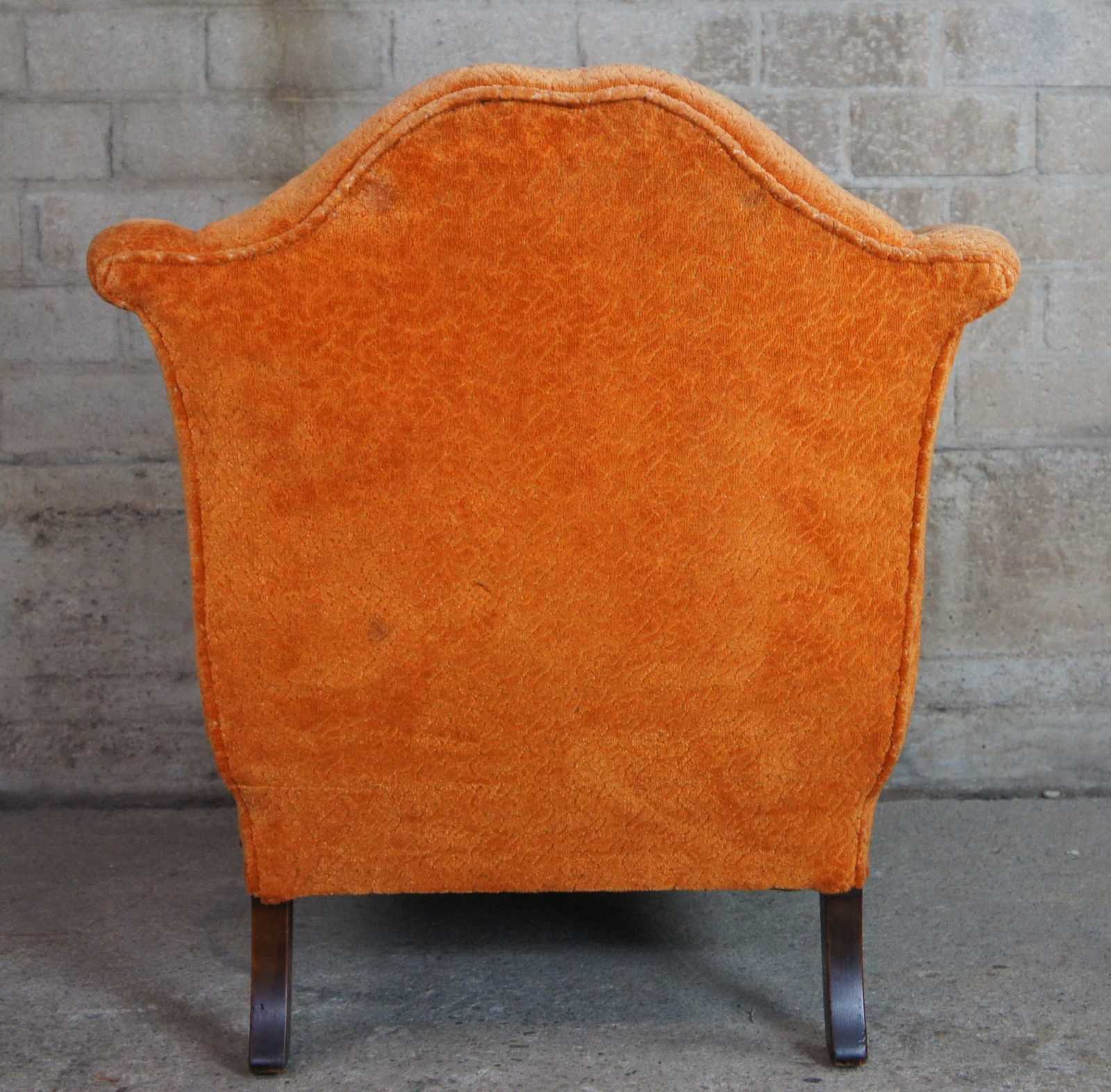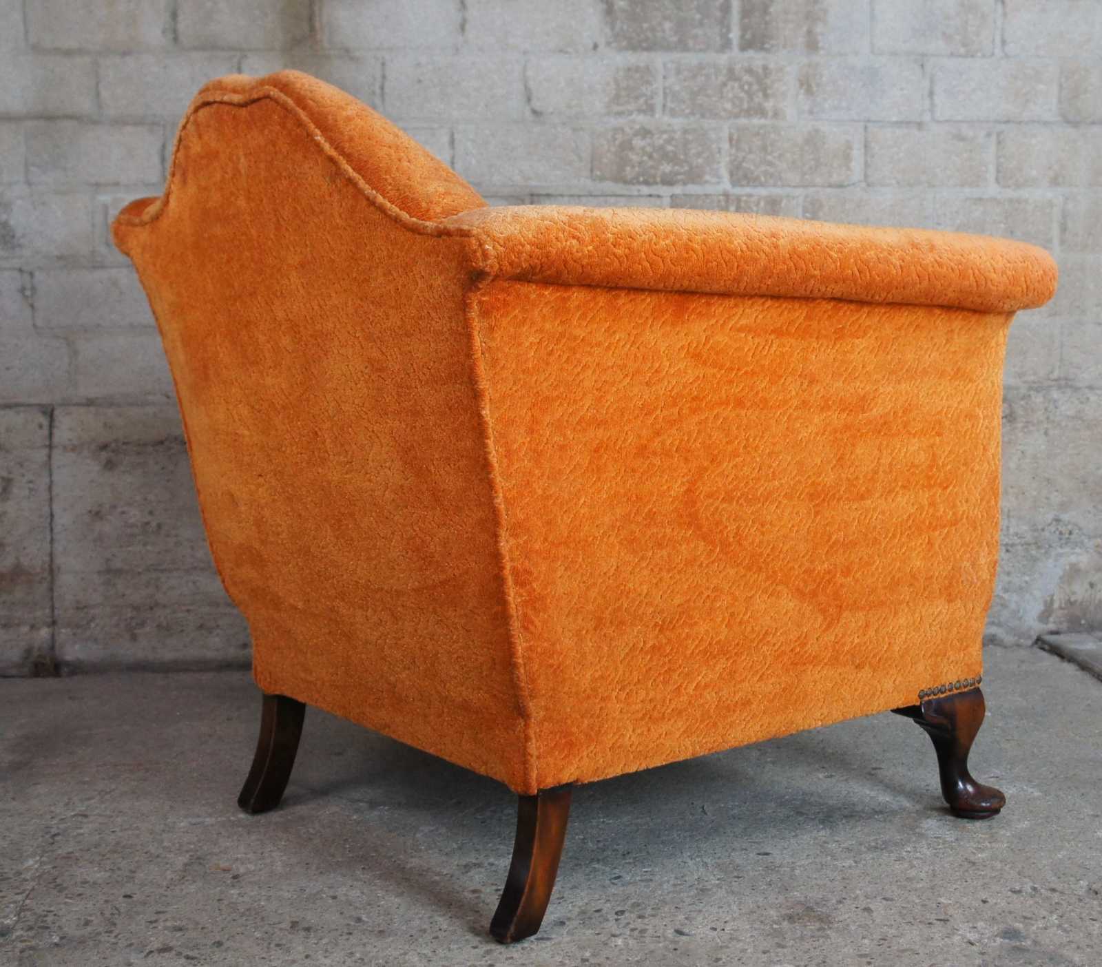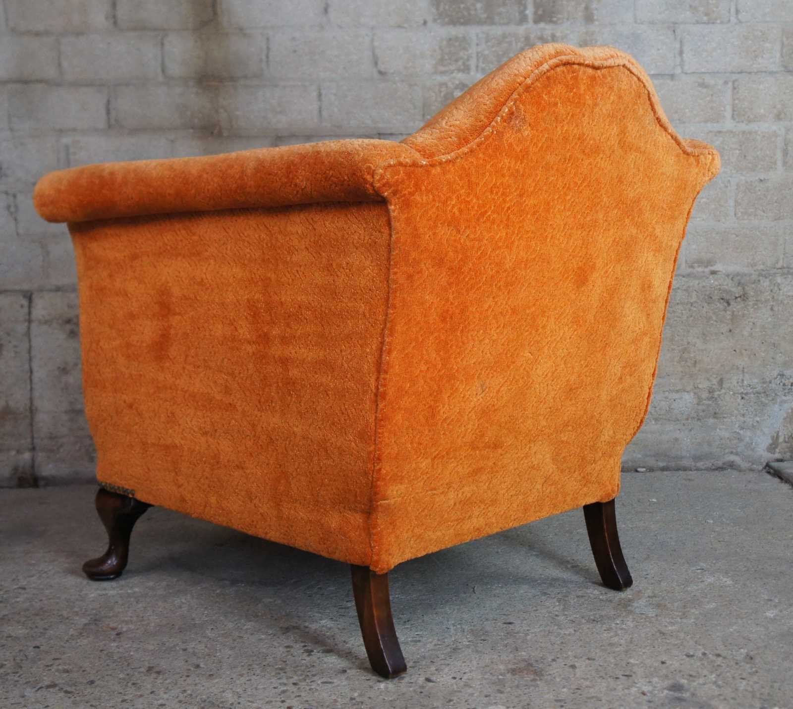 Early 20th century Queen Anne style arm chair. Made from Mahogany a camelback, flared arms and nail head trim. The chair is supported by cabriole legs with a slipper foot in the front and saber legs along the back.