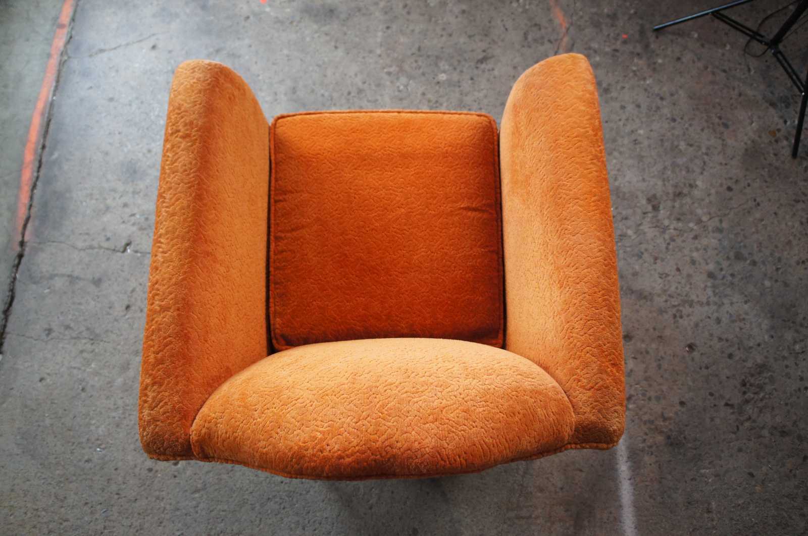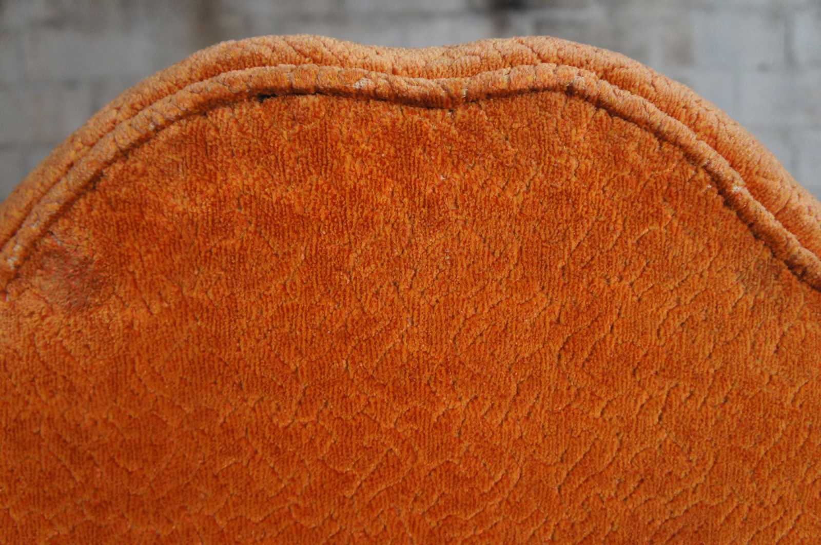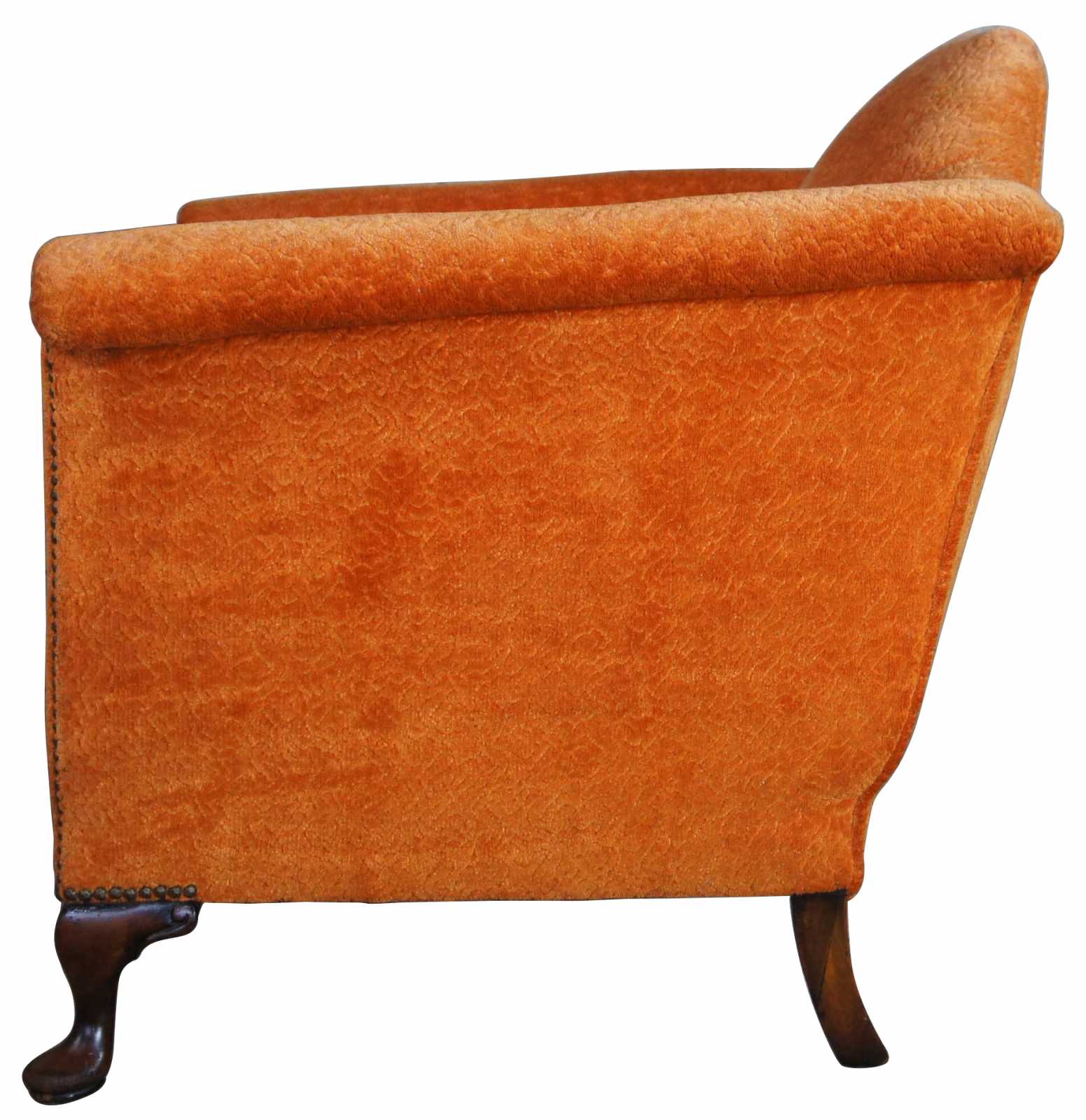 Early 20th century Queen Anne style arm chair. Made from Mahogany a camelback, flared arms and nail head trim. The chair is supported by cabriole legs with a slipper foot in the front and saber legs along the back.