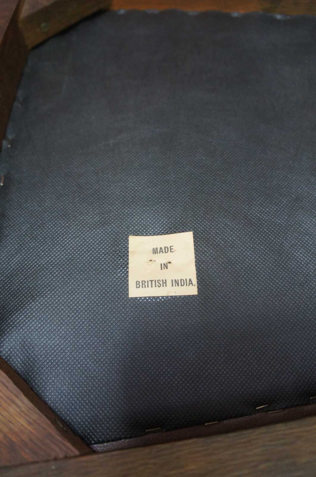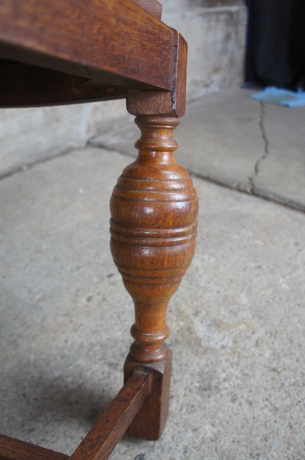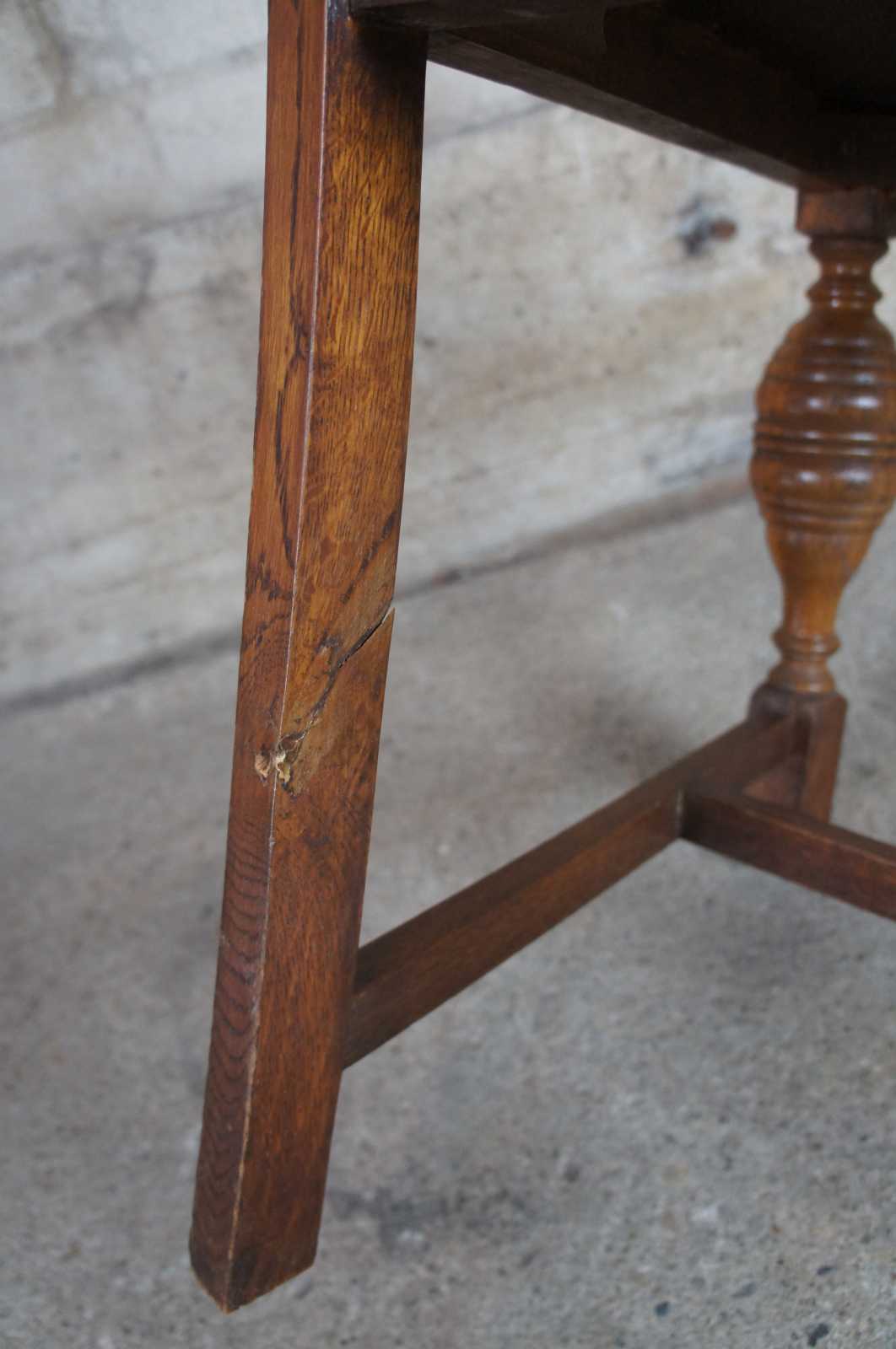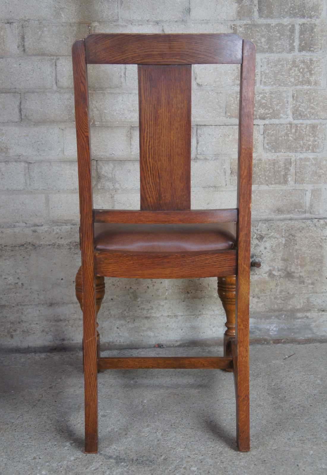 A lovely pair of 1930s Elizabethan revival dining side chairs by Jacob Summers & Sons. Part of their Hillcrest Suite as seen on page 18 of their catalog. Made from oak with a flower carved back, leather saddle seat and robust baluster shaped from legs. The company was founded by Jacob Summers in the 1880s and at the time these chairs were made, their factory was located in Tottenham, North London in the UK. Upholstered in leather made in British India. The British Raj was under rule by the British Crown in India from 1858 to 1947.
